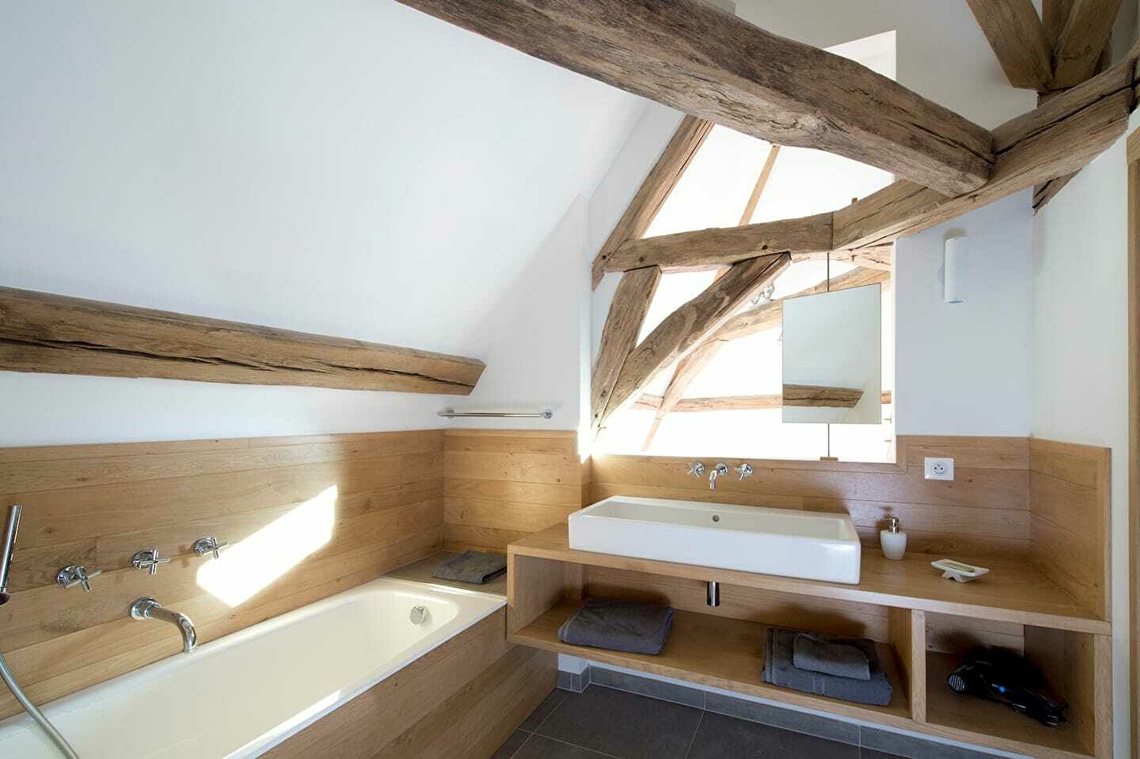 Cet appartement indépendant d'environs 100 m2 sur deux niveaux est conçu comme un loft. Il a été entièrement rénové il y a quatre ans dans une partie de l'immense grange du Domaine de Toury. Sa grande hauteur sous plafond et son agencement sobre et contemporain en font un lieu spacieux et très paisible. De larges baies vitrées et un grand balcon filant surplombant le parc vous donneront l'impression d'être en pleine nature. La piscine de 20m x 6m vous attend aux pieds de votre loft.