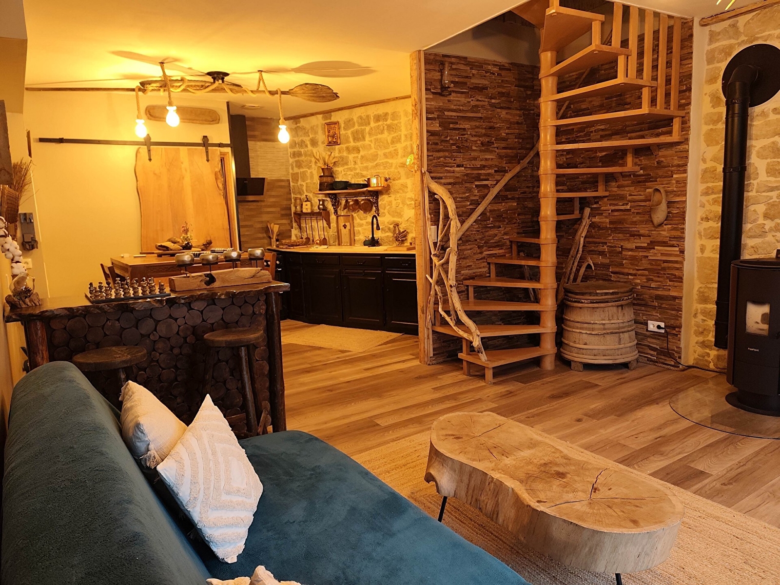 Appartement pour 4 personnes, situé dans une bâtisse en pierres. L'appartement a été refait à neuf avec l'utilisation de bois et de pierres apparentes afin d'apporter une sérénité et un bien-être apaisant. La décoration d'antan mêle objets anciens du quotidien et outils de métier de meunier et boulanger, en lien avec l'histoire de la bâtisse puisqu'il s'agit d'un ancien moulin du 13è siècle. L'ensemble se situe sur un parc arboré et paysagé au bord de rivière, dans un cadre bucolique et reposant. Une aire de jeux est à disposition des plus jeunes.