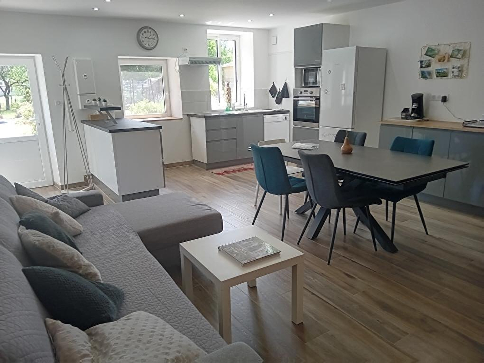 Au coeur du vignoble jurassien, à 10 min d'Arbois, dans ce joli petit village, venez découvrir ce gîte entièrement rénové dans la maison mitoyenne à celle des propriétaires. Au rez de chaussée, belle pièce à vivre composée d'une cuisine entièrement équipée, d'un salon avec canapé et télévision écran plat, salle d'eau avec douche à l'italienne et wc indépendants ainsi qu'une première chambre avec un lit de 160. A l'étage, vous trouverez 3 chambres, une avec un lit de 160x200cm, une avec un lit de 140x190 et la dernière équipée de deux lits superposés 90x190. Salle d'eau avec douche à l'italienne et wc. Côté extérieur, vous pourrez profiter d'une terrasse aménagée de salon de jardin et barbecue (plancha) privative à la belle saison, et d'un jardin clos. Le jardin est partagé avec les propriétaires pour offrir l'accès aux différents agrès aux plus jeunes (balancoire, trampoling, petit chalet....) N'attendez plus pour réserver votre séjour