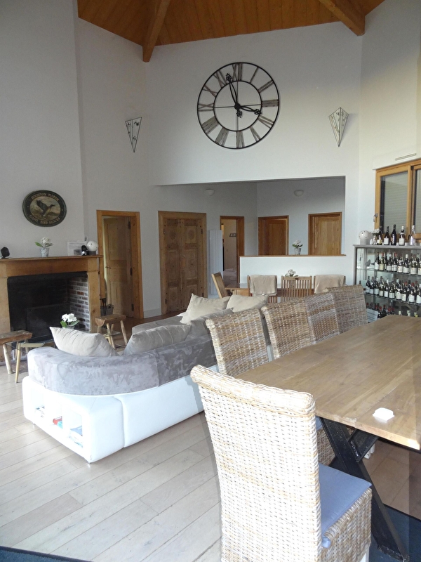 Grand séjour/salon avec cheminée, cuisine parfaitement équipée.