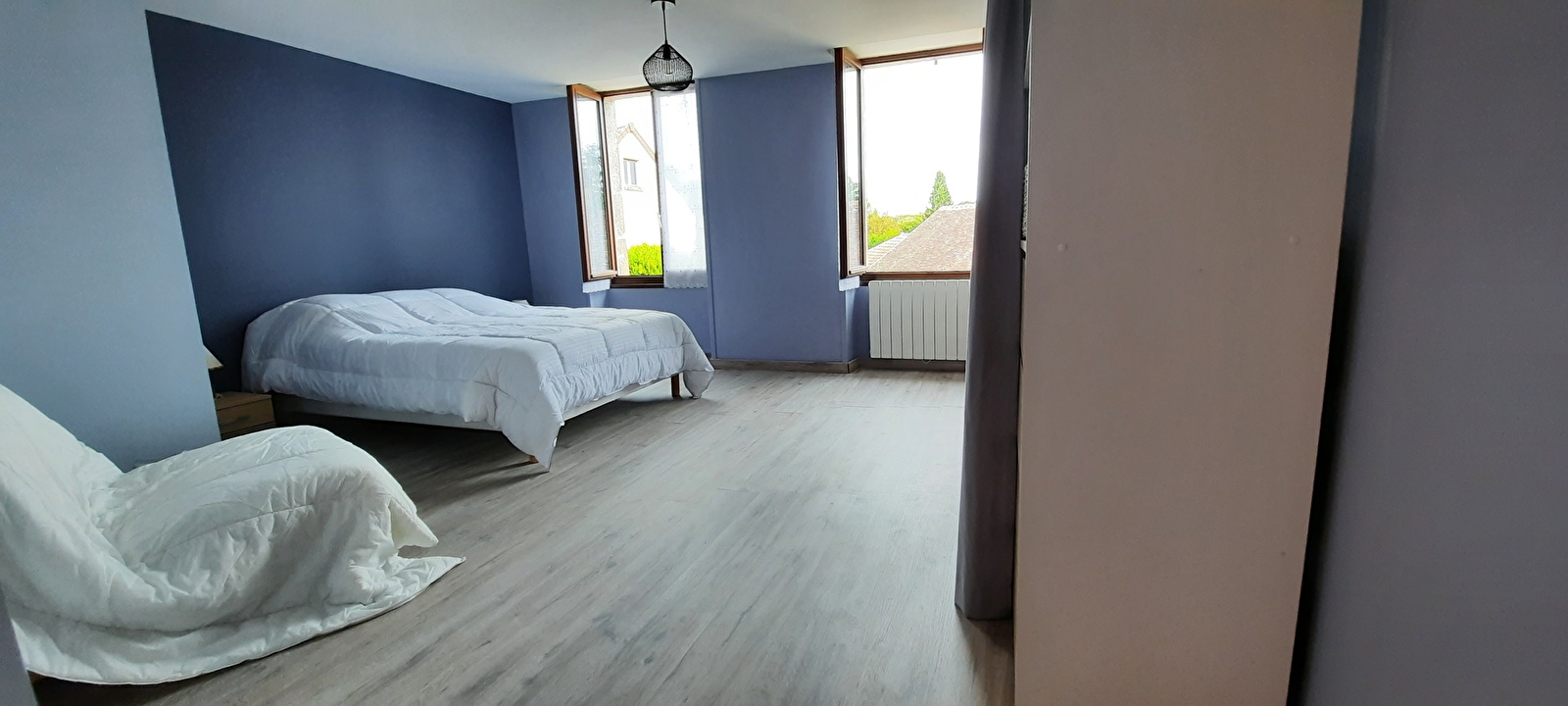 Au premier étage une grande chambre (23 m²) avec un lit double, un futon simple et une salle d’eau avec WC.