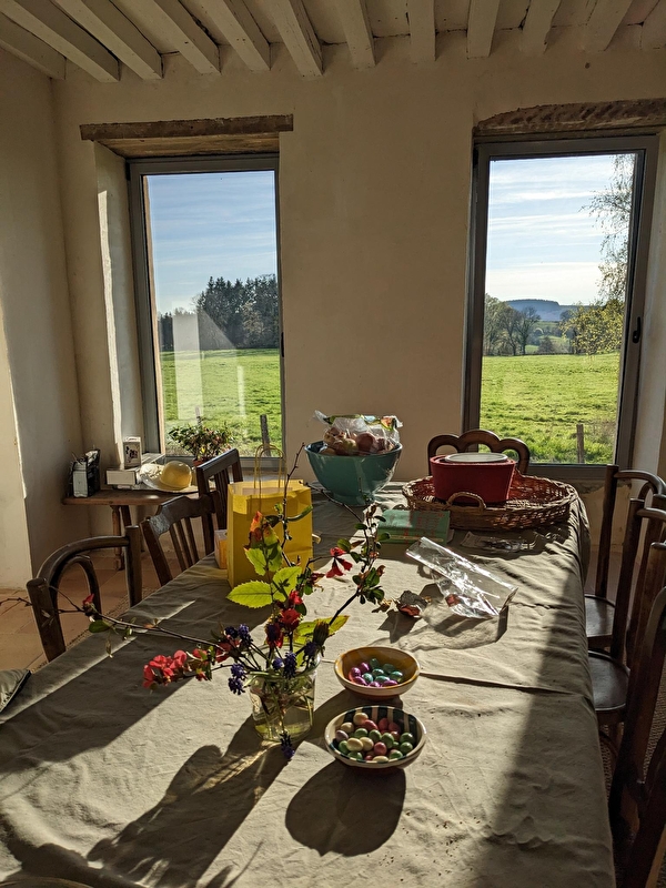 Ferme morvandelle traditionnelle et rénovée à l'écart d'un hameau très calme. Maison habitée durant l'année, composée de deux bâtiments, très lumineuse avec grands volumes. Vue sur les champs et forêts environnants. Idéal pour réunions familiales au printemps ou en été. Accès internet par fibre optique. Grand jardin de 5000m².