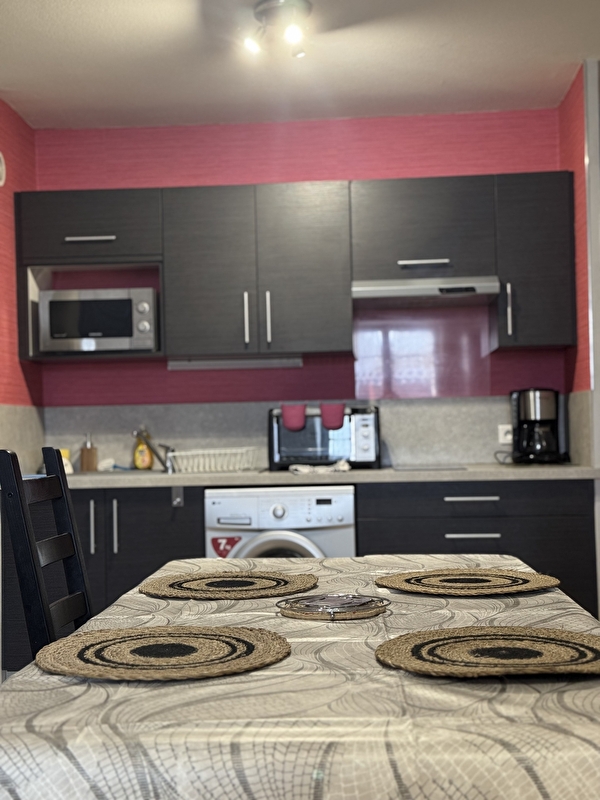 Cuisine entièrement équipée : plaques, four, micro-ondes, réfrigérateur, lave-linge.