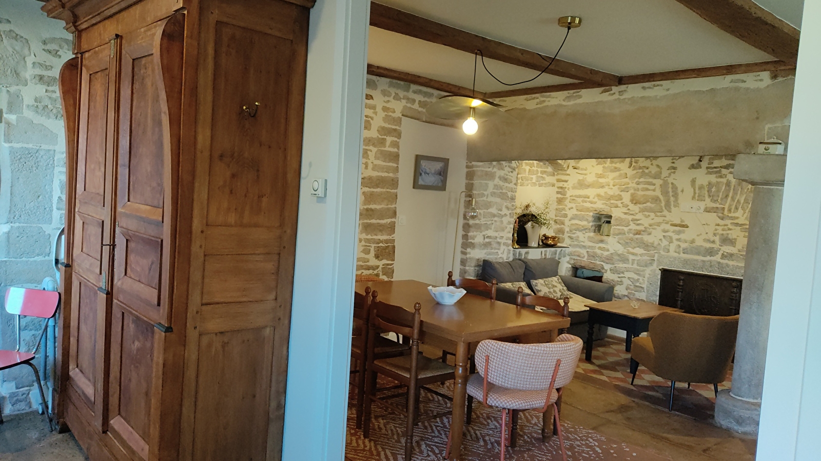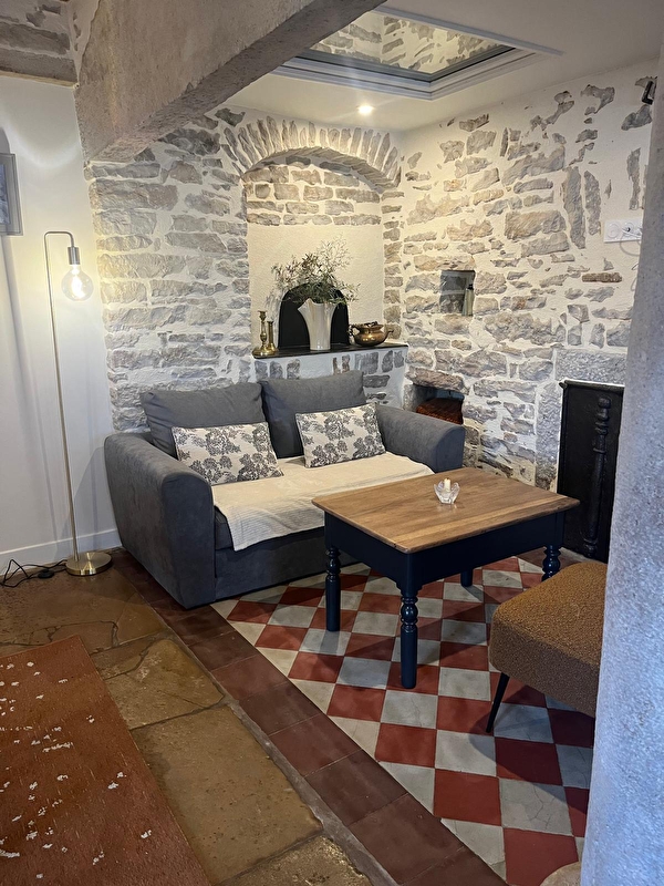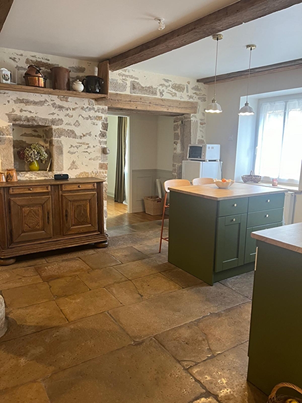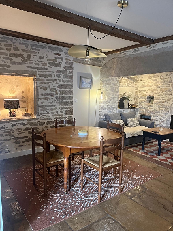 Nous avons eu à coeur de mettre en valeur les éléments originaux de la maison , tels que le tuyé, les niches et les murs en pierre.....