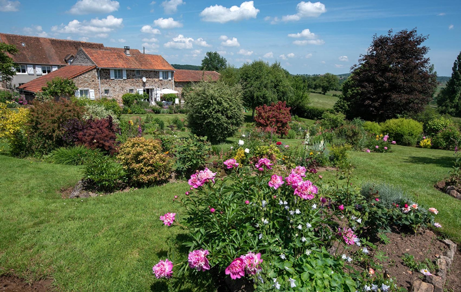 Jeanine & Gabriel (passionné de nature & paysagisme) vous ouvrent les portes de charmantes authentiques écuries de caractère datant de 1819 soigneusement restaurées (dépendances jadis de l'ancien domaine agricole charolais qui occupait les lieux, ayant joué un rôle majeur pour la résistance locale durant la seconde guerre mondiale) blotties au calme au cœur d'un paisible petit hameau rural chargé d'histoire perché en "belvédère" sur une colline dominant Montceau (situé sur la ligne de démarcation). Apaisant écrin champêtre alentour, niché en lisière d'une bucolique pâture boisée accueillant des vaches charolaises en saisons (& "Robert" leur âne parqué un peu plus loin). Possibilité de pouvoir observer la faune sauvage sur place (chevreuils, lièvres, renards, nombreux oiseaux…). Spacieux gîte de bon confort. Chaleureux cachet campagnard au charme "vintage" un brin "rustique" sublimé par l'âme du bâti d'origine (murs & piliers en pierres, poutres & charpente d'origine). Ambiance douillette. Vaste terrasse exposée ouverte sur un exceptionnel & sublime "jardin naturel campagnard paysagé d'inspiration anglaise" extrêmement fleuri de 3000m² à cheminement & enfilade, 100% écologique, soigneusement végétalisé & arboré, pensé & créé de toutes pièces par Gabriel (250 rosiers de variétés diverses, pivoines, iris, pavots, lupins, lavande fleurs des champs, très nombreux arbustes...). Superbe vue dégagée sur la campagne environnante.