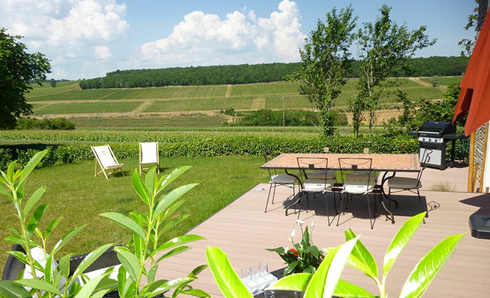 Terrasses (salon de jardin, barbecue, transats, parasol) et grand jardin de donnant sur le vignoble.