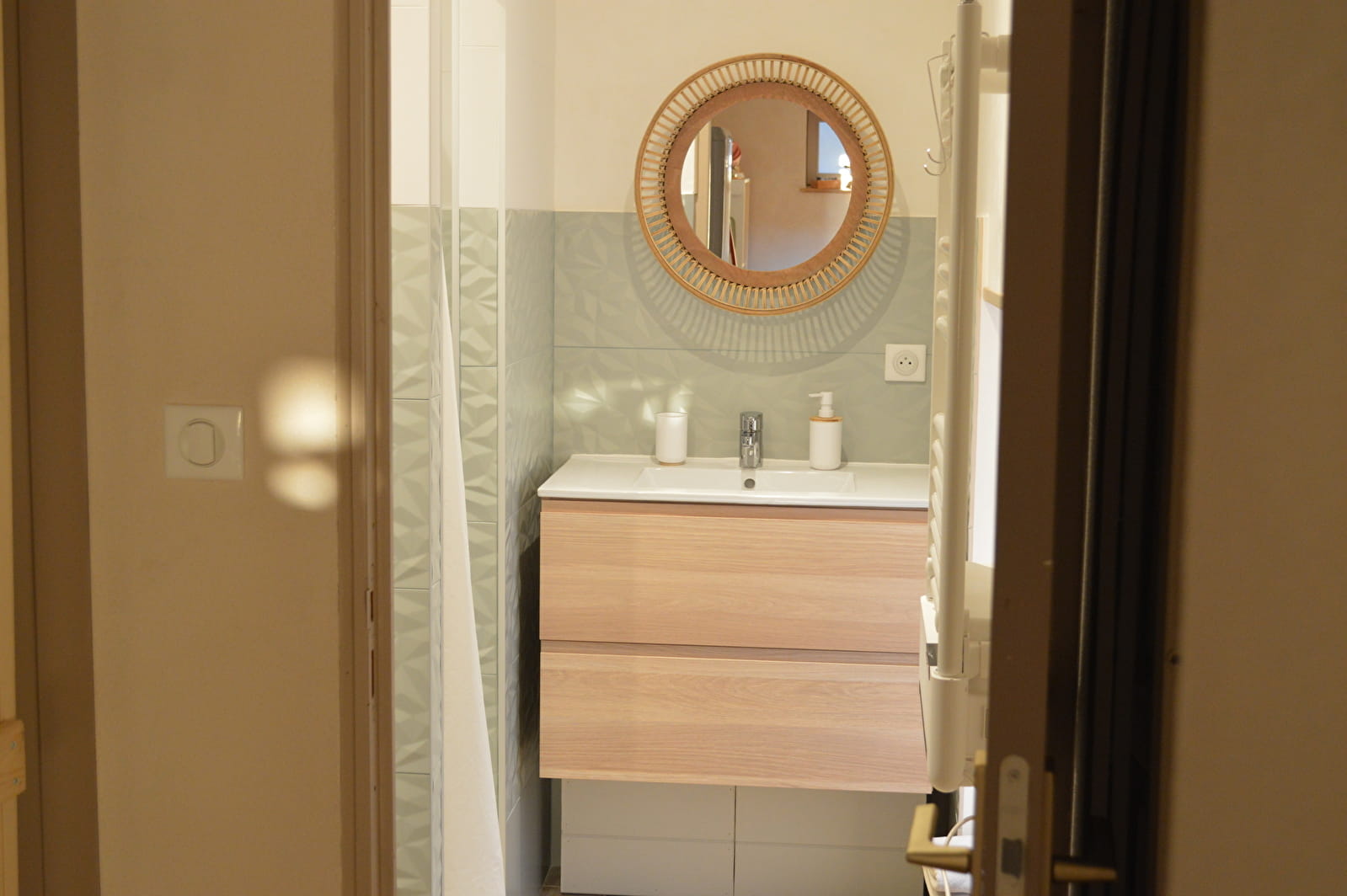 Au rez-de chaussée, vous découvrirez la pièce de vie avec un agréable salon et une cuisine ouverte entièrement équipée ; puis au bout d’un petit couloir, une salle de bain avec douche italienne et toilettes.