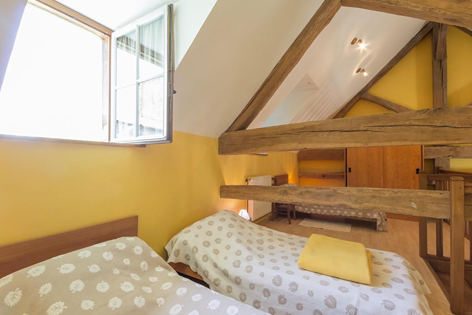 De l'autre côté du gîte, on trouve à l'étage : 4 chambres avec un lit 140 cm chacune, une salle de bains et un WC séparé (la pièce palière a été fermée pour en faire une vrai chambre avec un velux)