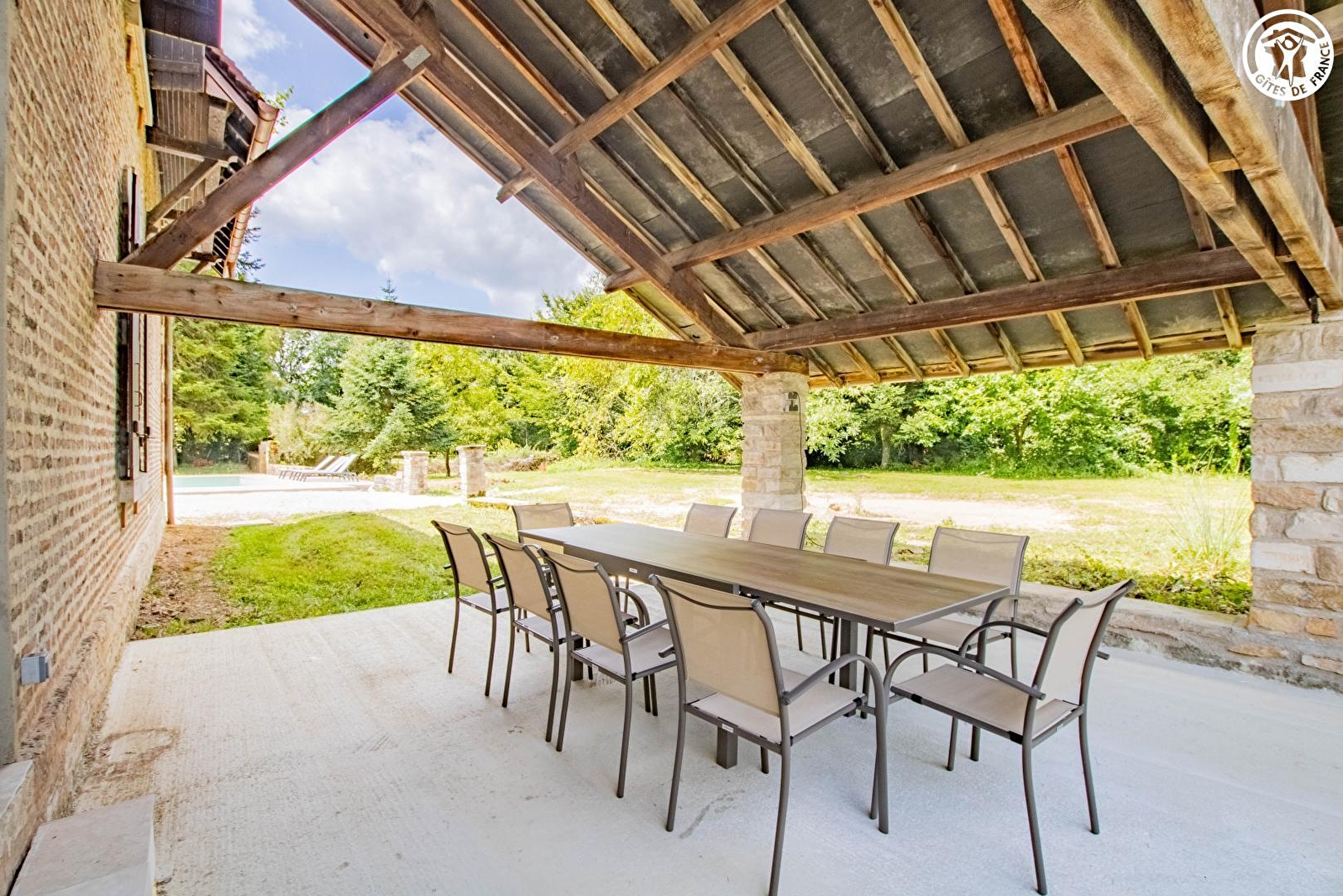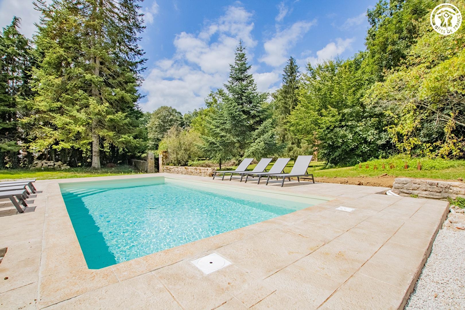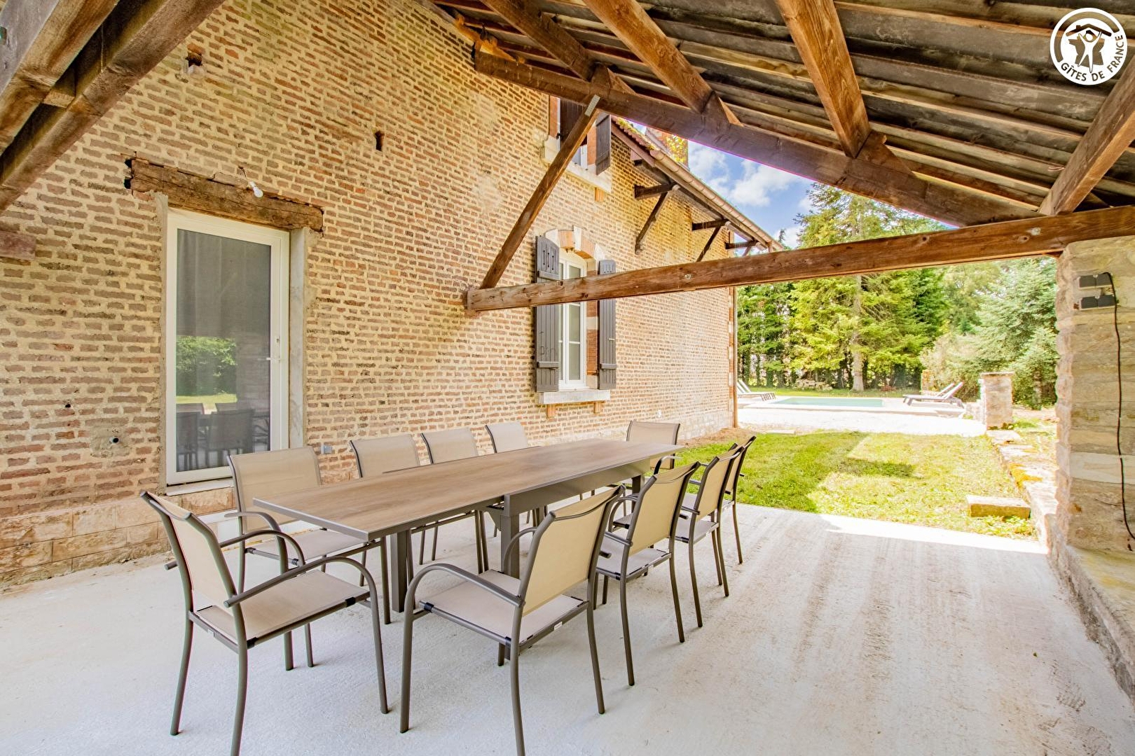 Ravissante demeure "bourgeoise" de caractère de la fin XIXe intégralement réhabilitée, nichée sur un site chargé de grande histoire, à l'endroit d'une ancienne forteresse médiévale dont demeure une élégante rare chapelle en briques érigée au XIVe soigneusement restaurée (exceptionnel chef d'œuvre de l'art gothique en Bresse Bourguignonne / "Chapelle de Bellefond" bordant la propriété) & une authentique tour médiévale sauvegardée trônant au cœur même du parc. Calme & tranquillité en pleine campagne bressane, au sein d'un paisible mini hameau rural lové en lisière de champs & prairies à l'orée d'un vaste bois (en partie privé), non loin du cœur commerçant du bourg (nombreuses commodités sur place dont supermarché). Magnifique douce campagne de plaines bocagères & vastes forêts domaniales sauvages parsemée d'étangs & rivières, véritables "poumons verts" du territoire. Spacieux gîte de très bon confort. Beaux volumes. Chaleureux cachet campagnard aux accents contemporains sublimé par l'âme dépaysante d'une ancienne bâtisse parfaitement conservée (manteau de cheminée en pierres, escalier & parquets d'origine...). Énormément de charme & caractère. Cosy & ultra douillet. Large terrasse abritée ouvrant sur une belle piscine (8x4m). Vaste parc de 3 ha, arboré & végétalisé, littérale "aire de jeux" privilégiée pour les enfants comprenant un petit bois privé (doté d'un sentier). Annexe aménagée en salle de jeux avec baby-foot & vélo d'appartement.