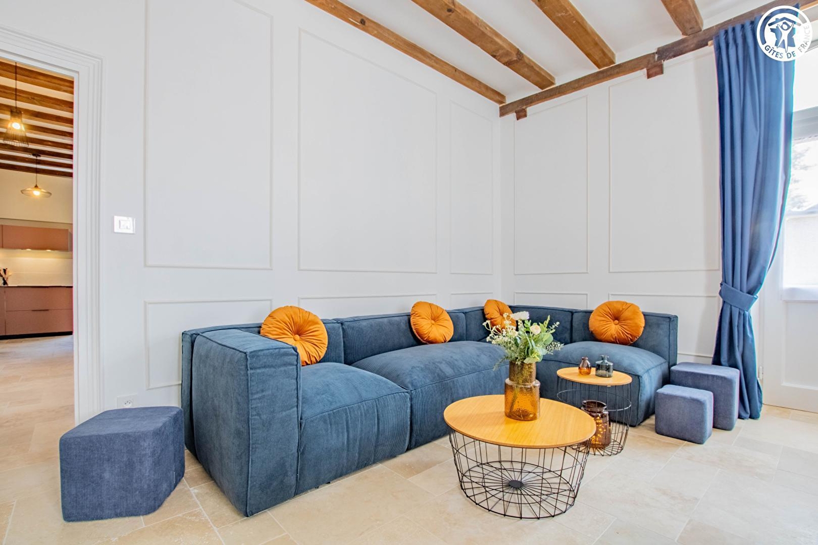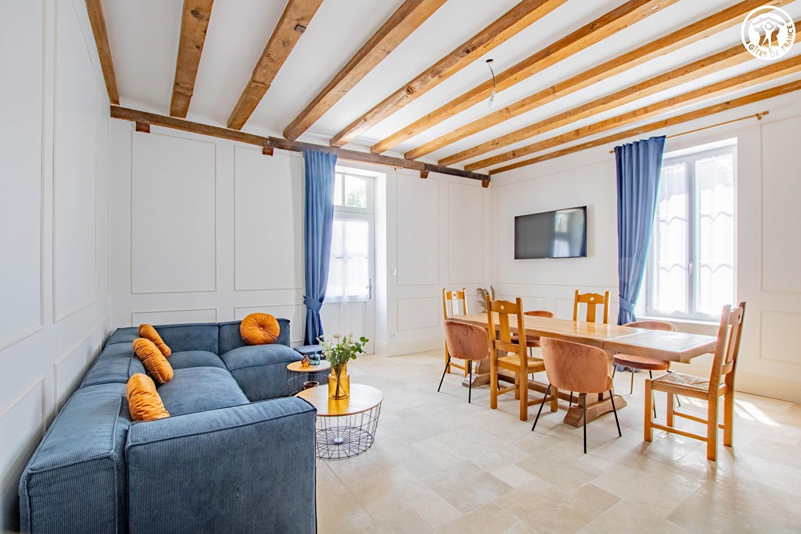 Composition : Maison individuelle voisinant l'habitation des propriétaires (totale indépendance sans vis à vis). Wifi (fibre). Chauffage PAC + cheminée. Climatisation. Rdc : cuisine, séjour-salon, salle d'eau (douche), Wc indépendant, buanderie. 1er étage : 4 chambres (3 comprenant 1 lit 2 p.160x200cm / 2 lits 1 personne de 90x190cm jumelables en lit 2 personnes de 180x190cm), salle d'eau (douche), Wc indépendant. Terrasse abritée + jardin (parc 3 ha) + parking privés. Annexe avec baby-foot. Commerces 4.5 km. Supermarché 4 km.