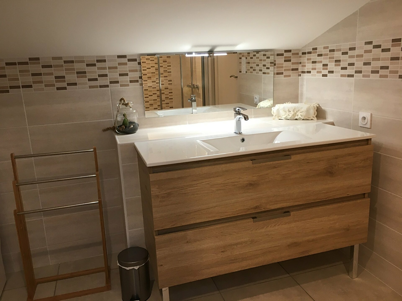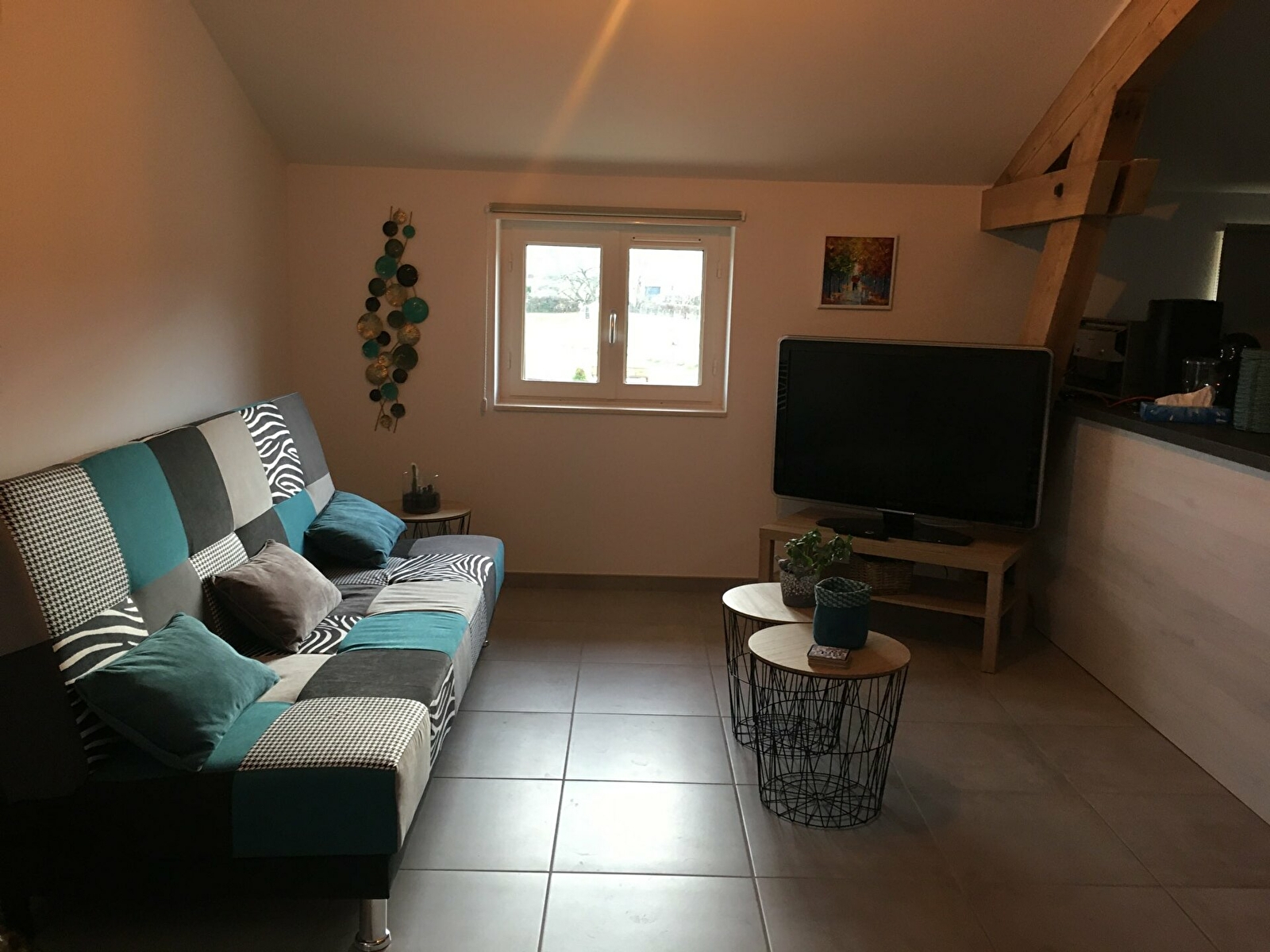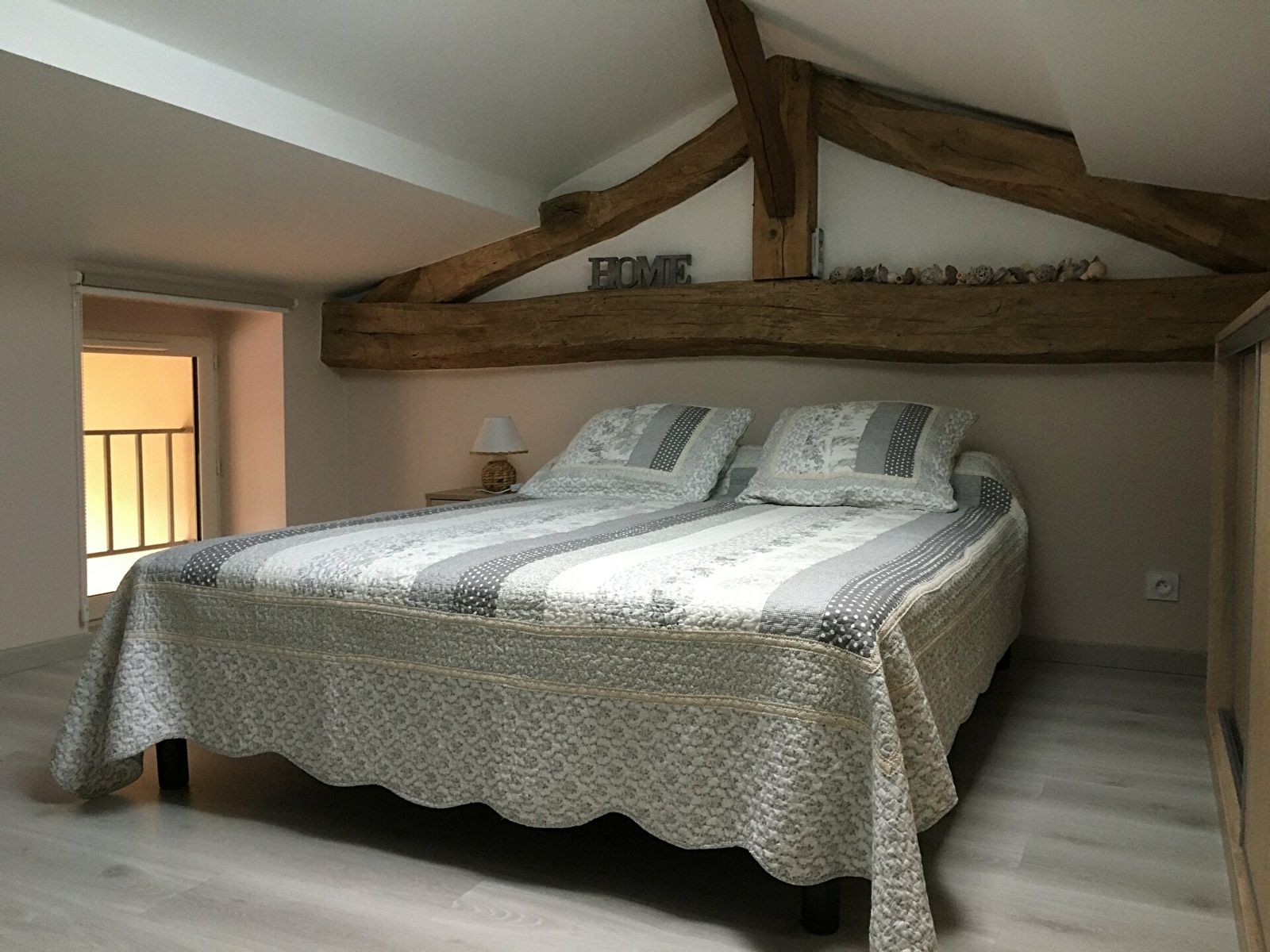 Il est composé d'une pièce à vivre avec cuisine toute équipée (four, micro onde, frigo avec une partie congèle, lave vaisselle, cafetière à filtre ou à dosette, bouilloire...), un coin salon avec canapé convertible pouvant servir de couchage pour deux personnes, d'une chambre avec un lit de 160x200 comprenant un placard de rangement ainsi qu'un téléviseur. La salle de bain (douche) est séparée des WC.