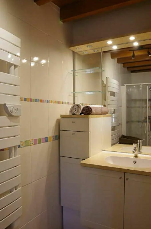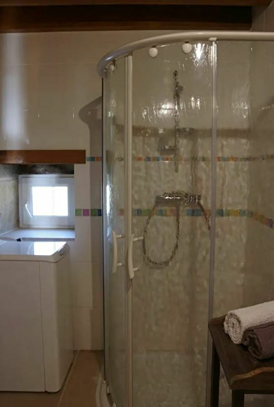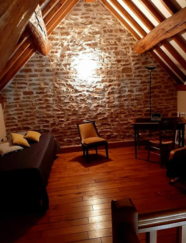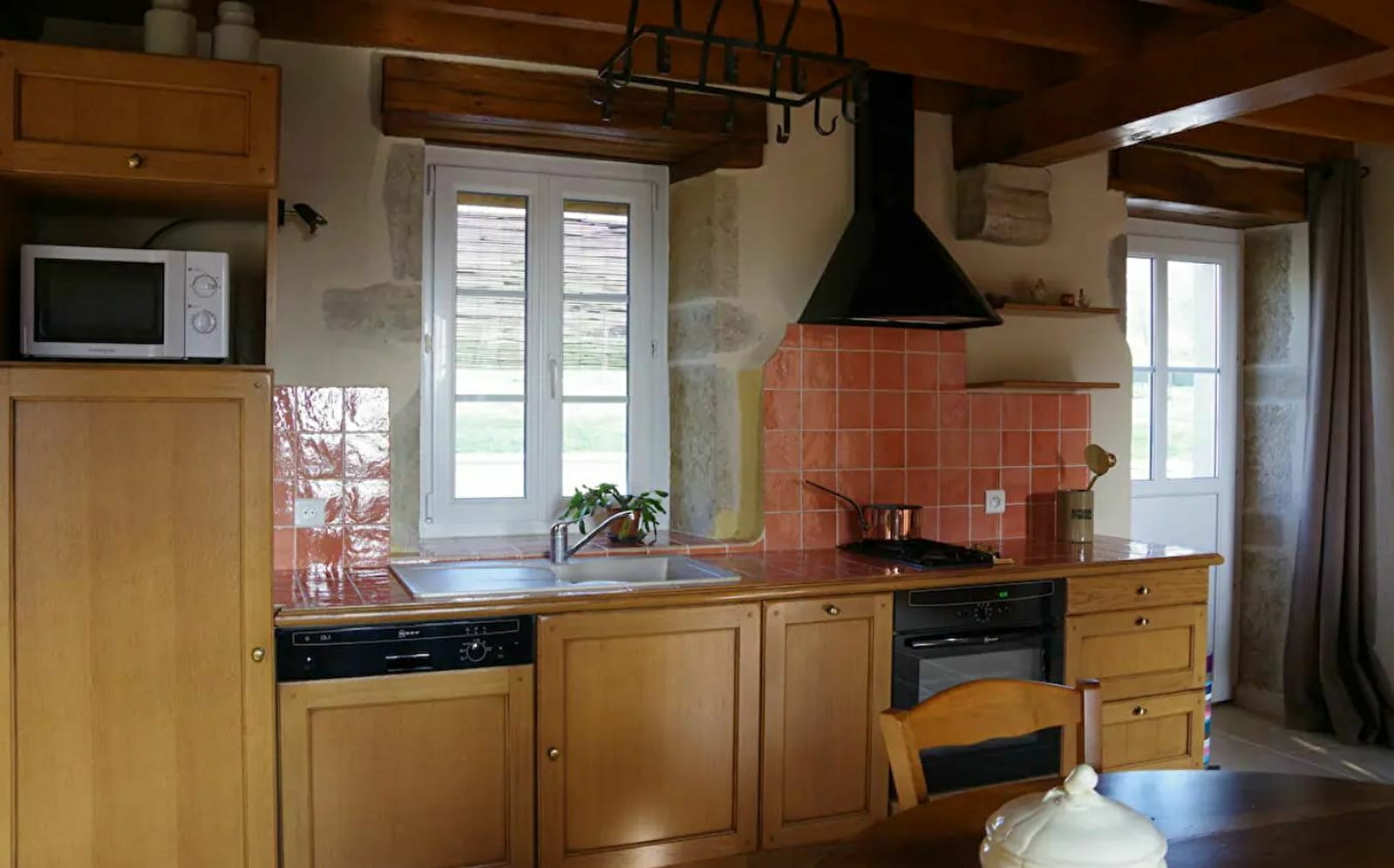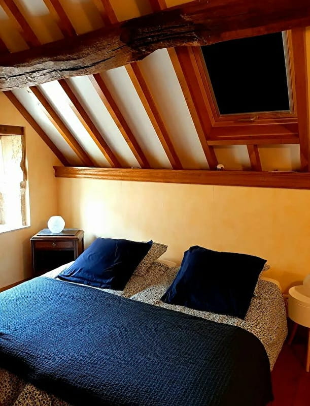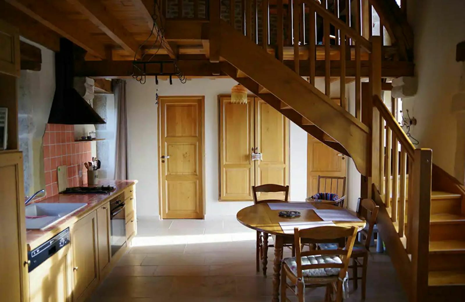 Gîte d'environ 75m² rénové en matériaux naturels. il comprend 2 niveaux : rez-de-chaussée pièce à vivre avec sa cuisine aménagée, salle de douche et WC séparés.