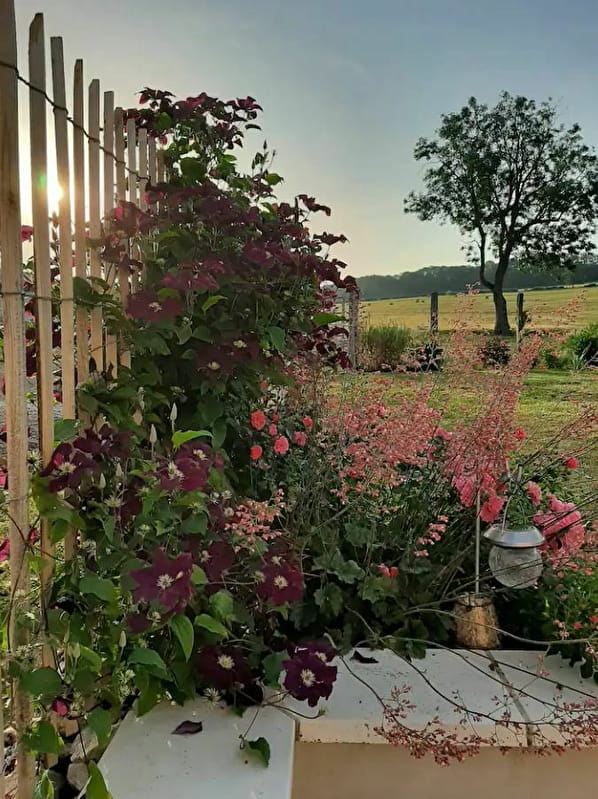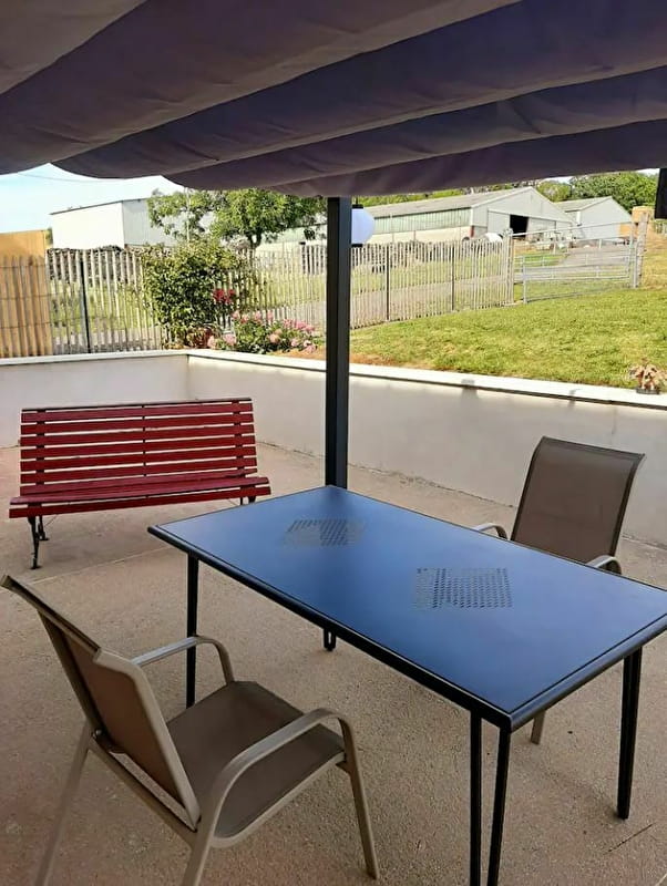 A l'extérieur terrasse privative sans vis-à-vis, pergola, salon de jardin, balançoire et petit potager, légumes et fruits à disposition en fonction des saisons.
