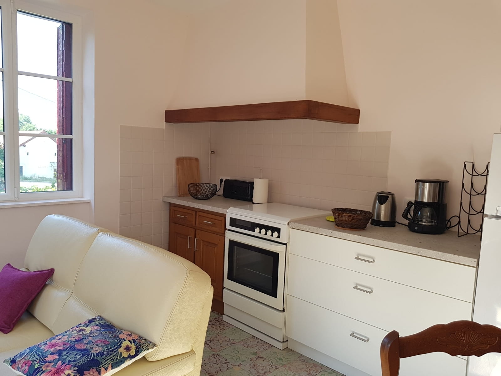 - la pièce principale: cuisine-séjour de 22m2 comprenant cuisine équipée (cuisinière feux gaz, hotte aspirante, four chaleur tournante, réfrigérateur congélateur, lave vaisselle, micro-ondes, grille-pain, cafetière, bouilloire, table à repasser, fer à repasser, lave linge) et coin salon avec TV écran plat.