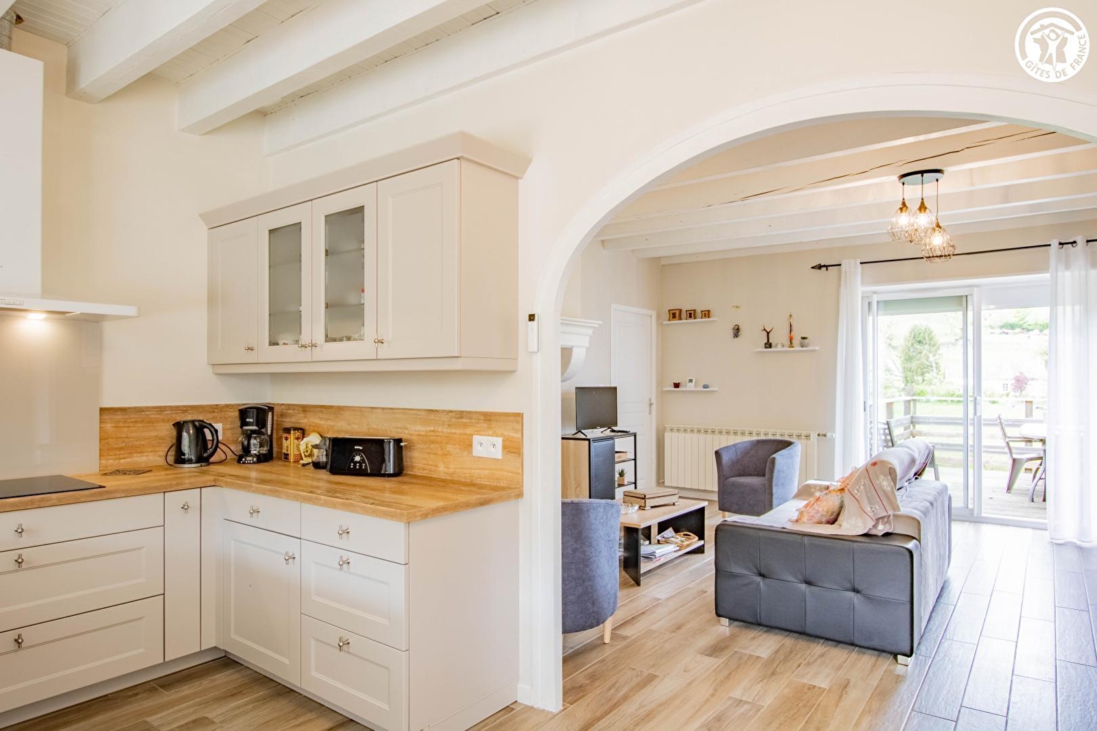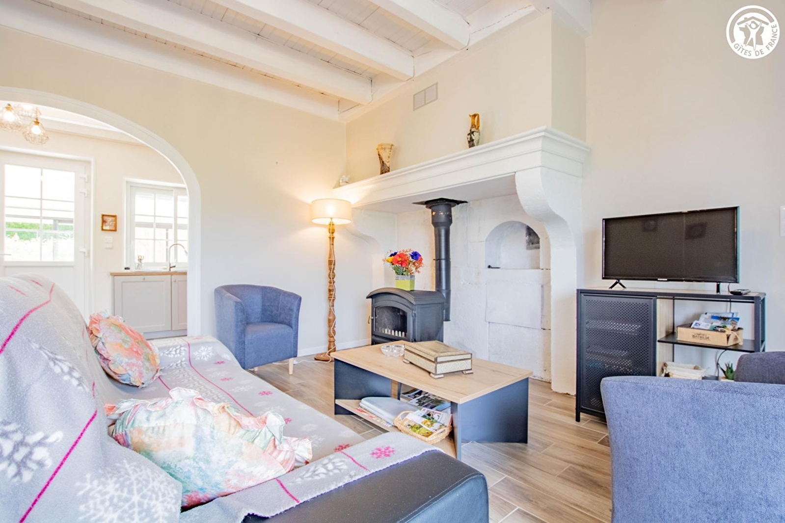 Composition : Maison individuelle de plain-pied (légers demi-niveaux intérieurs). Wifi (fibre). Chauffage central gaz. Séjour-cuisine-salon, 2 chambres dont 1 séparée par un rideau (lit 2 p. 140x190cm dans chaque), salle d'eau (douche/Wc). Terrain clos (400m²) + balcon-terrasse + abri voiture (2 places) + garage (1 pl. / local vélos) privatifs. Commodités dont supermarché à 12 km.