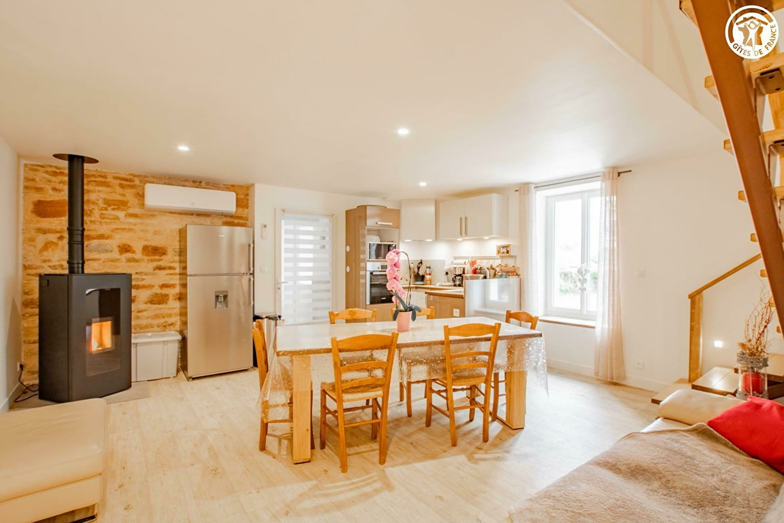 Thomas & Oriane vous ouvrent les portes d'une ravissante authentique demeure de pays datant de 1821, soigneusement restaurée & revisitée en confortable villégiature, sise en bordure de ruelle & d'une douce prairie (accueillant en saisons des vaches charolaises & limousines de la ferme voisine), à deux pas de la Voie Verte (passant à seulement 200m) et du bucolique "Étang de Chaumont" (apaisant site naturel privilégié de promenades comme de découverte de la faune & de la flore), en toute proximité du centre bourg de Chatenoy-le-Royal doté de l'intégralité des commodités (dont supermarché). Hameau résidentiel & agricole niché en secteur péri-urbain au creux de la douce campagne chalonnaise vallonnée, mixant viticulture, agriculture & pleine nature (en partie protégée en ZNIEFF pour ses richesses faunistiques & floristiques), entre belles forêts sauvages (dont deux vastes "forêts domaniales" toutes proches, littérales "poumons verts" du territoire à parcourir lors de reposantes balades à pied ou VTT), prairies & coteaux de vignobles (premières vignes à 5 km). Gîte de très bon confort. Chaleureux cachet campagnard contemporain, sublimé par quelques traces du bâti d'origine (mur & linteau en pierres). Ambiance douillette, zen & très douce. Équipement complet de qualité. Agréable petit jardinet agrémenté d'un salon de jardin, naturellement ombragé sous les arbres.