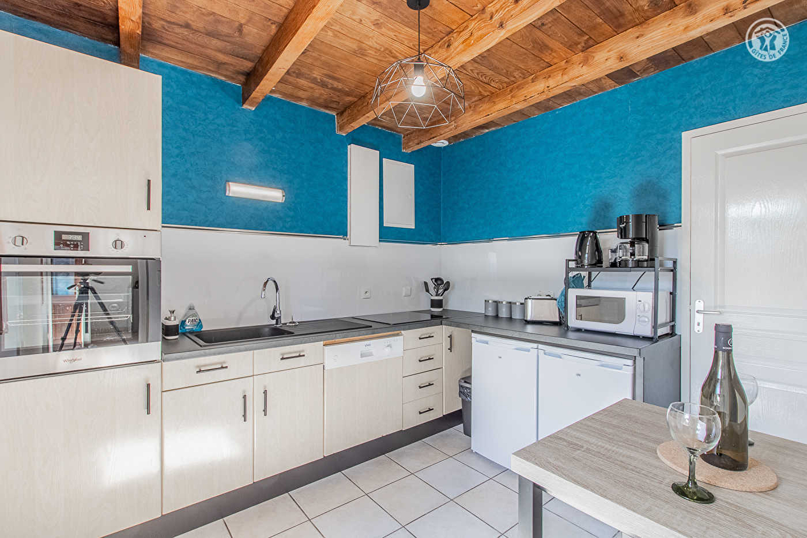 Composition : Maison individuelle. Wifi (fibre). Chauffage central fioul. Pièce de vie climatisée. Rdc : cuisine, séjour, séjour-salon, salle d'eau (douche), Wc indépendant. 1er étage : 3 chambres (lit 2 p. 140x190cm / 2 lits 1 p. 90x190cm / lit 2 p. 140x190cm) dont une avec accès privatif indépendant possible depuis le jardin (par escalier extérieur), salle d'eau (douche/Wc). Double terrasse (dont une abritée) + jardin clos (2000m²) avec portail électrique (balançoire-toboggan/cages de foot/table de ping-pong) + parking privés. Borne recharge voitures électriques. Supérette 4.5 km. Mini supermarché 8 km.