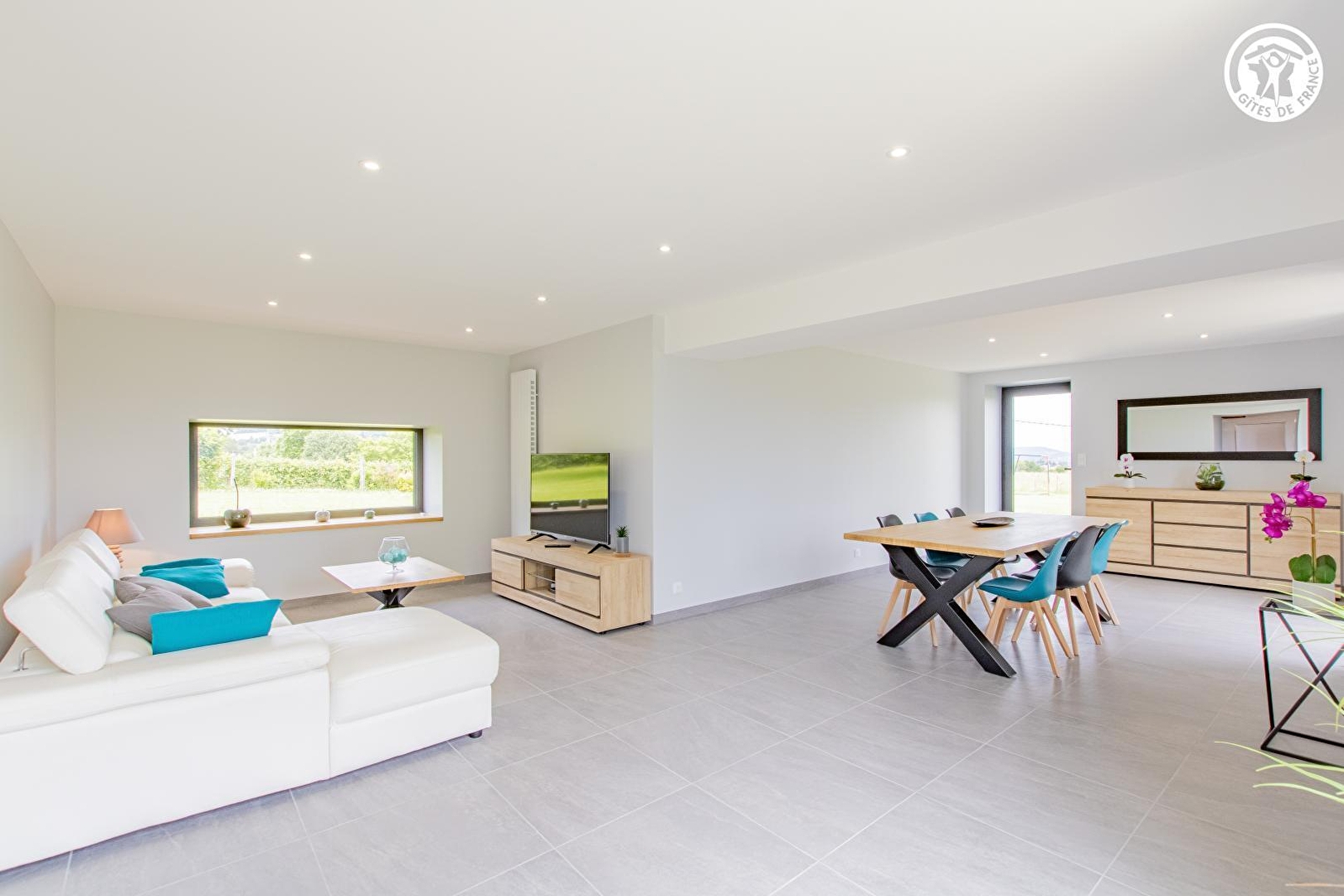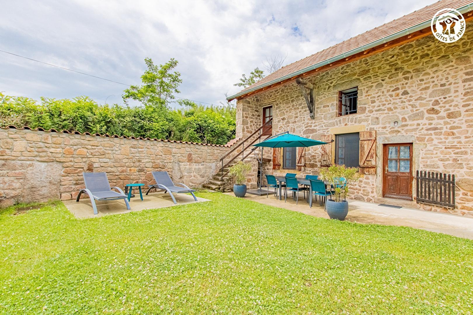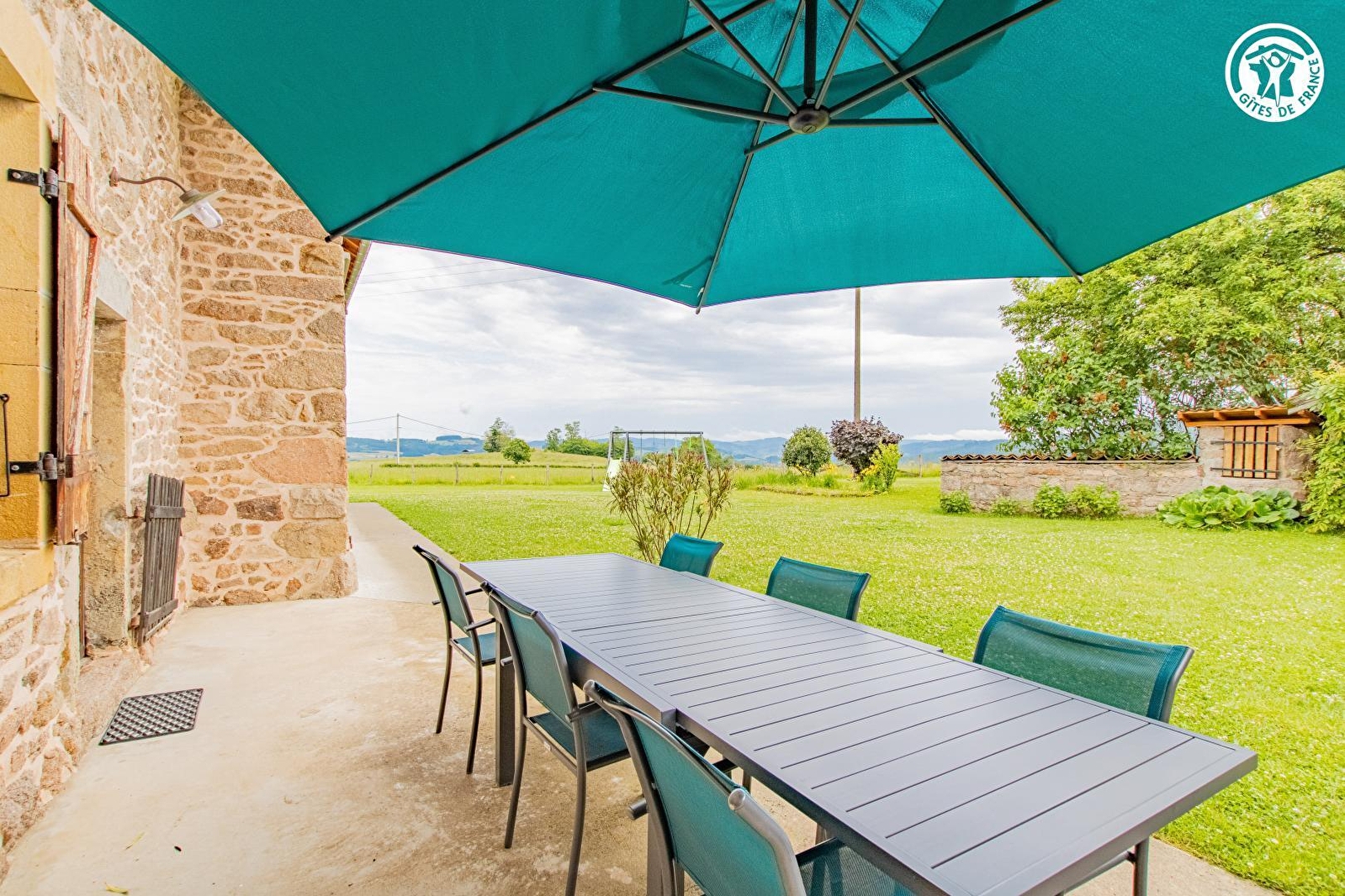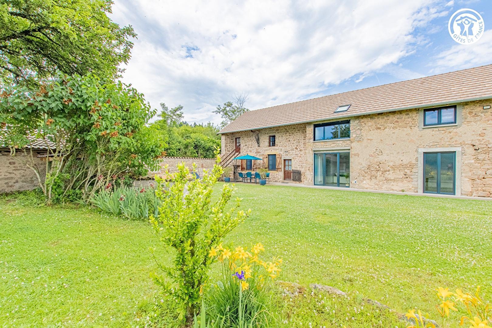 Élégante ferme traditionnelle de caractère du XIXe soigneusement réhabilitée, blottie en "belvédère panoramique" à flanc de colline sur un coteau sud, au sein d'un paisible mini hameau rural "dispersé". Absolue tranquillité en pleine campagne de montagne douce, au creux d'un site protégé en ZNIEFF & Natura 2000 pour ses richesses floristiques & faunistiques, niché en lisière de prairies au cœur d'un magnifique plateau de bocage (avec les vaches charolaises comme voisines en saisons), sous les crêtes boisées des monts environnants, proche de l'exceptionnel arboretum de Pézanin, l'un des plus beaux de France (comprenant 450 espèces végétales sur 25 ha, autour d'un bucolique étang de pêche). Sublime écrin préservé de nature & verdure. Littéral havre de paix. Mini "paradis vert"' ultra reposant. Gîte de très bon confort. Vaste pièce de vie. Chaleureux cachet campagnard aux accents contemporains sublimé par l'âme du bâti originel (poutres & manteau de cheminée en pierres). Large terrasse exposée (complétée par une insolite terrasse abritée), ouverte sur un agréable jardin clos engazonné de 2000m², arboré & végétalisé, doté d'un brasero, d'une balançoire-toboggan, d'un terrain de foot avec ses cages & d'une table de ping-pong. Superbe vue dégagée à quasi 360° affichant les monts du Clunisois, Mâconnais & Beaujolais en toile de fond. Magnifiques panorama & paysages.