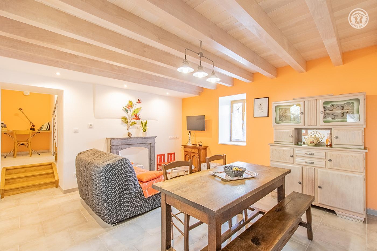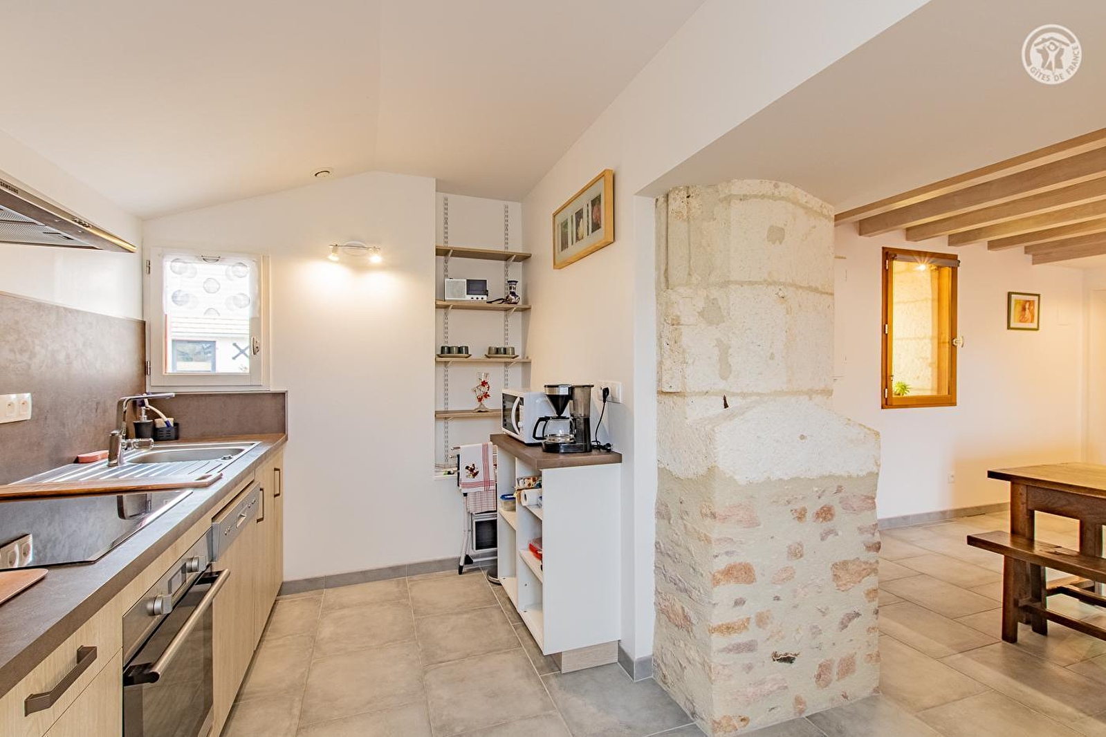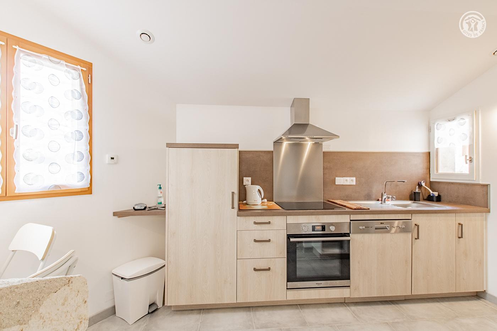 Composition : Maison de village mitoyenne. Wifi. Chauffage électrique. Gîte en duplex avec demi-niveau (accès par escalier extérieur). 1er étage : séjour-cuisine-salon (canapé BZ 2 p. 140x190cm en appoint), espace bureau, salle d‘eau (douche), Wc indépendant. 2ème étage : 2 chambres (lit 2 p. 160x200cm / 2 lits 1 p. de 90x190cm). Cour-terrasse close + local vélos + terrain pétanque + parking privatifs. Commodités 4.5 km.