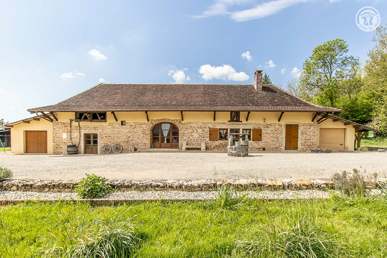 Ravissante ferme traditionnelle de caractère du XIXe restaurée avec soins, nichée en pleine campagne en lisière de prairies, au creux d'une vaste clairière ouverte, à l'orée d'une grande forêt. Au sein d'un paisible hameau résidentiel sis à 4 km du centre de Cuiseaux, la « cité des peintres », lieu de naissance d'Édouard Vuillard & Pierre Puvis de Chavannes artistes mondialement connus, blottie sur les contreforts boisés du massif Jura, au creux d'un sublime cadre paysagé préservé de montagne douce. Pétrie de charme, dotée de nombreuses commodités et d'infrastructures sportives & culturelles de qualité, ce pittoresque village médiéval commerçant chargé d'histoire (ancienne ville frontière) dispose d'un riche patrimoine (porte du verger, remparts, château des princes d'Orange, église, chapelle, maisons bourgeoise et hôtels particuliers du XVIème siècle, anciennes maisons vigneronnes…). Gîte de très bon confort à l'architecture intérieure atypique. Ultra spacieux. Vaste pièce de vie. Chaleureux cachet campagnard contemporain mixant traditions & modernité dans l'esprit d'une douce « maison de famille » aux riches traces du passé (murs en pierres, briques, manteau de cheminée, poutres, linteaux en pierres… d'origine). Équipement très complet de qualité. Agréable propriété naturelle de 3 ha comprenant un vaste jardin engazonné (parfaite aire de jeux pour les enfants) et une grande cour (terrain de pétanque naturel) accueillant un large espace terrasse exposé.