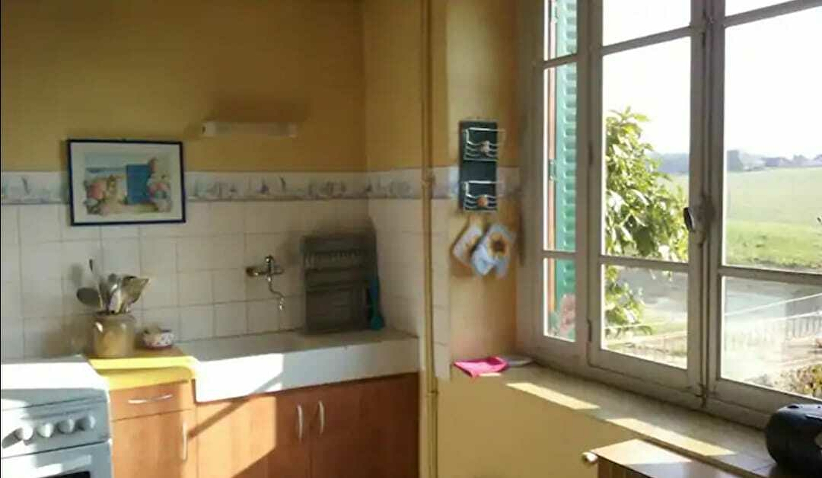 VASTE espace à vivre : Cuisine simple et campagnarde (gazinière / cuisinière à bois / frigo congélateur / micro ondes / cafetière électrique).