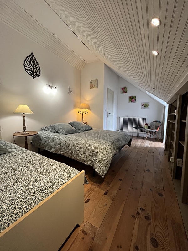 Cette grande maison de campagne familiale (environ 250 m²) est composée de 5 chambres et peut accueillir 14 personnes confortablement (15 sur demande avec supplément) : 4 salles de bains, 3 toilettes, une cuisine équipée et sa spacieuse salle à manger, un vaste salon, confortable et accueillant.