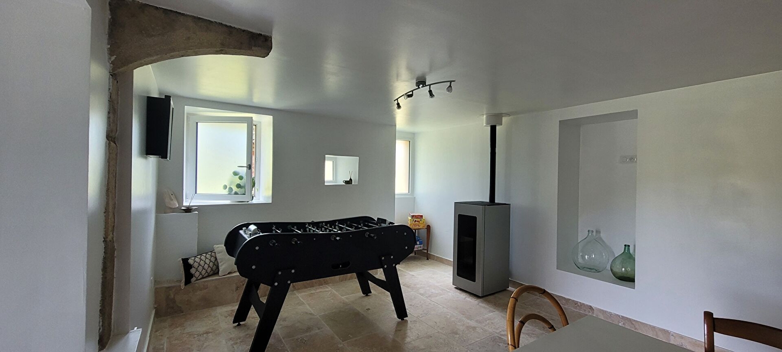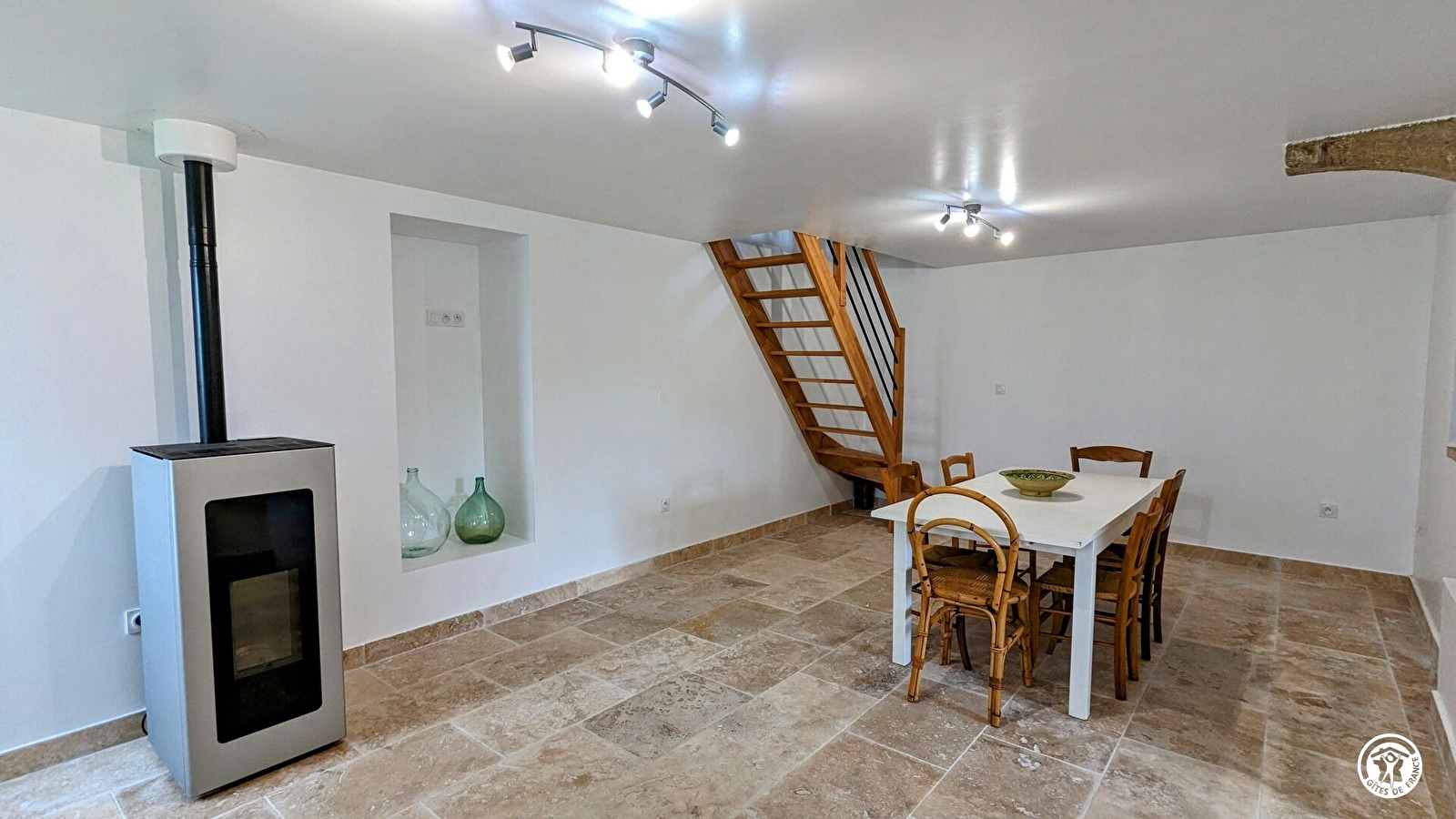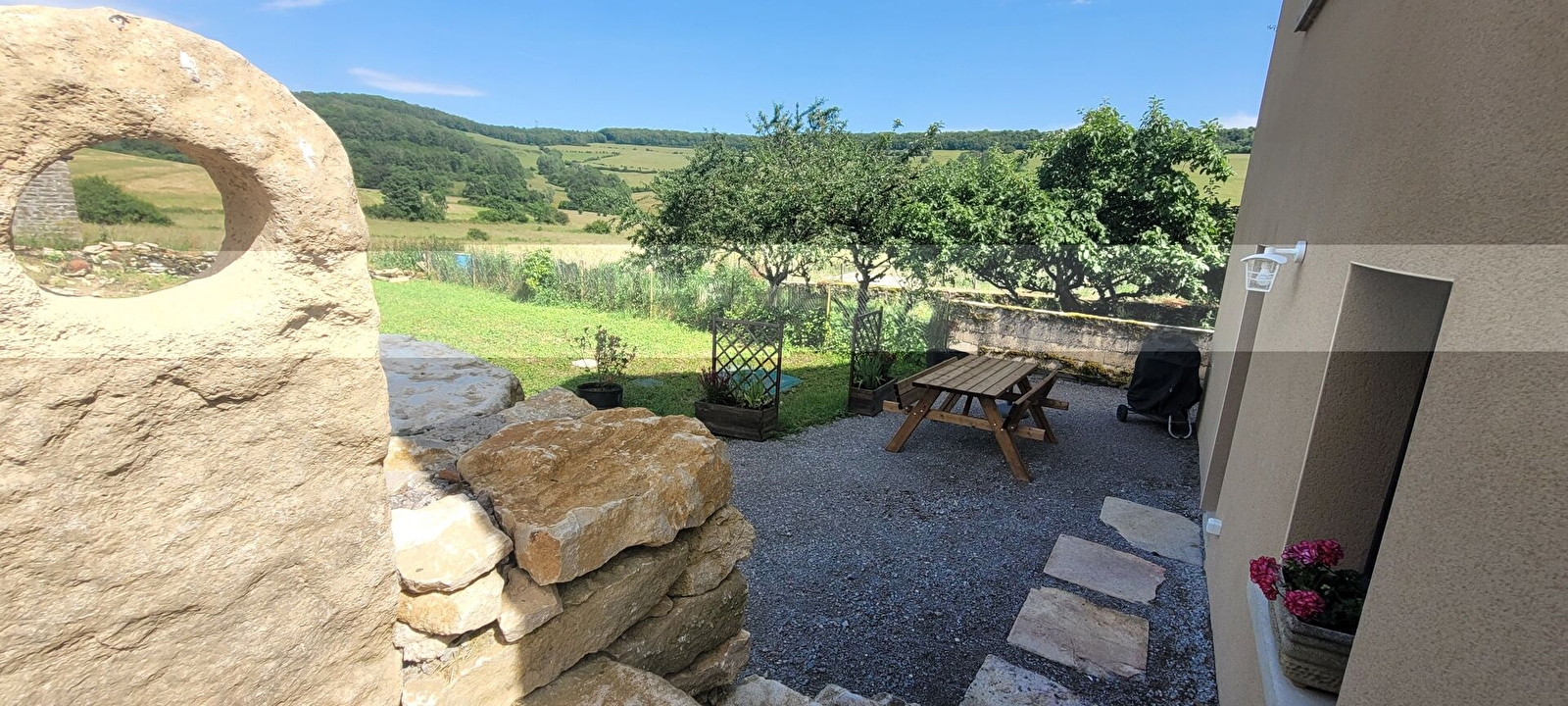 Dans un petit village calme, jolie maison indépendante, entièrement rénovée avec goût. Rez-de-chaussée : hall d'entrée, salon avec TV connectée, salle d'eau avec douche italienne, 1 chambre avec 1 lit de 160X200 cm. A l'étage : 1 chambre ouverte sur palier avec 1 lit de 140X190 cm, communicante avec 1 chambre avec 1 lit de 140X190 cm avec salle d'eau privative, WC indépendant. Lit bébé, chaise haute bébé et pot wc sur demande. Au niveau inférieur : salle à manger avec poêle à granulés (1er sac offert, au-delà 6 €/sac) et cuisine entièrement équipée. 1 WC indépendant. Accès direct à la terrasse et au jardin, offrant une très jolie vue dégagée sur la campagne. Parking public devant le gîte.