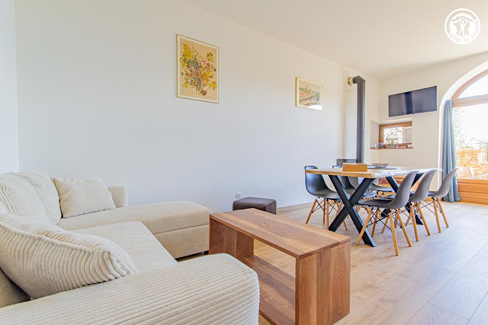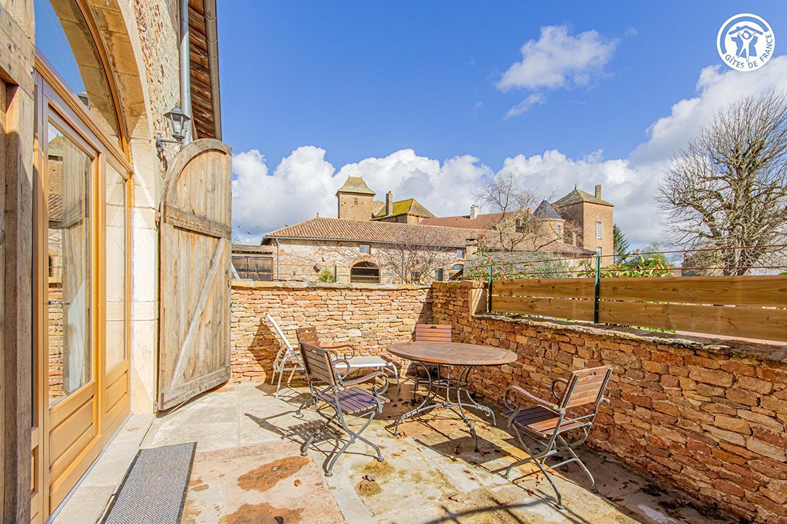 Viticulteur & "fermier" par passion (aménagée dans l'esprit d'une "micro ferme", la propriété abrite lamas, moutons, ânes, chevaux, une bassecour avec cygnes & des lapins en liberté !), Yves-Arnaud & sa compagne Cécile vous accueillent au sein d'authentiques écuries du XVIIe soigneusement restaurées, jouxtant le somptueux château-fort médiéval de Salornay édifié au XIIIe, pétri de grande histoire & parfaitement conservé, sur un domaine viticole de 24 ha exploité en "agriculture biologique" (dégustations & vente possible). Au calme, en pleine campagne mâconnaise vallonnée, adossé à flanc de colline sur un vaste plateau exposé dominant la vallée de la Saône, au creux d'un paisible hameau rural. Ravissant cadre champêtre préservé au cœur des vignobles, mixant bucoliques prairies & vastes massifs forestiers, proche de l'intégralité des commodités. Spacieux gîte de bon confort. Chaleureux cachet campagnard aux accents contemporains. Douce sobriété dans une ambiance apaisante & zen. Belle pièce de vie au beau volume baignée de lumière derrière une grande baie vitrée cintrée (à l'endroit de l'ancienne porte cochère). Intimiste terrasse close jouxtant une vaste cour (véritable terrain de pétanque "naturel") et un agréable jardin arboré & engazonné (espace non privatif accolé à une terrasse couverte abritant un ancien pressoir). Accès possible au vaste domaine de 24 ha (dont les proches vignobles) ainsi qu'à un étang de pêche privé sis à 1 km.