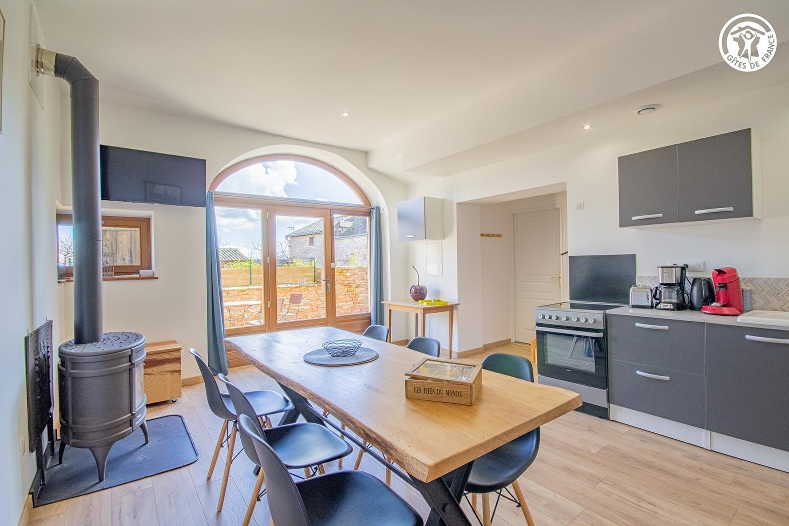 Composition : Maison mitoyenne (avec second gîte + appartement des propriétaires) sur propriété comprenant plusieurs logements loués à l'année & 5 chambres d'hôtes avec salle réception (côté château). Wifi. Chauffage PAC (+ radiateurs à l'étage). Poêle à bois. Climatisation. Rdc : séjour-cuisine-salon, 1 chambre (lit 2 p. 140x190cm), salle d'eau (douche/Wc). 1er étage : 2 chambres (2 lits 1 p. 90x190cm / 2 lits 1 p. 90x190cm superposés). Terrasse close + parking privés. Local vélos. Cour + terrain commun. Commerces & supermarchés 4 km.