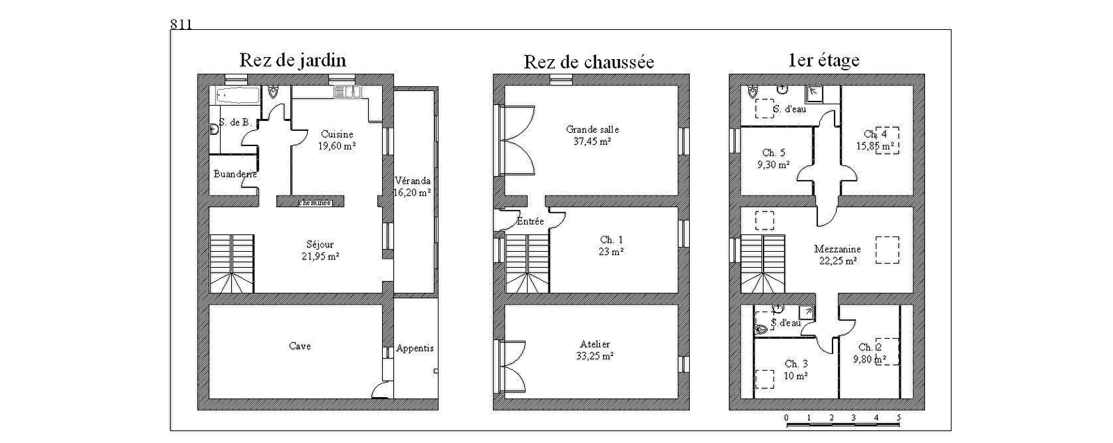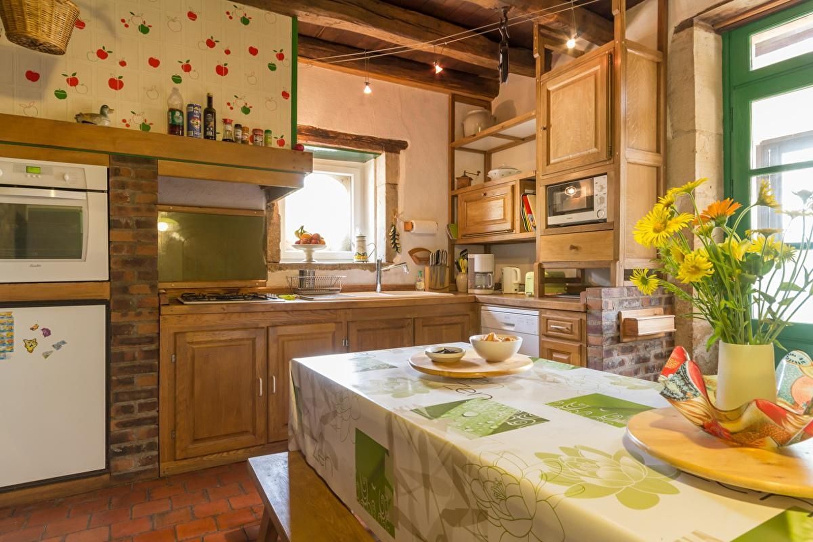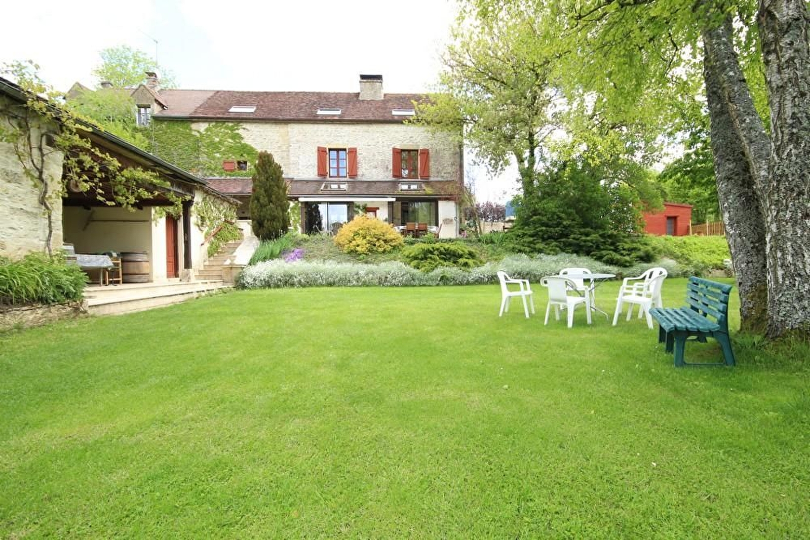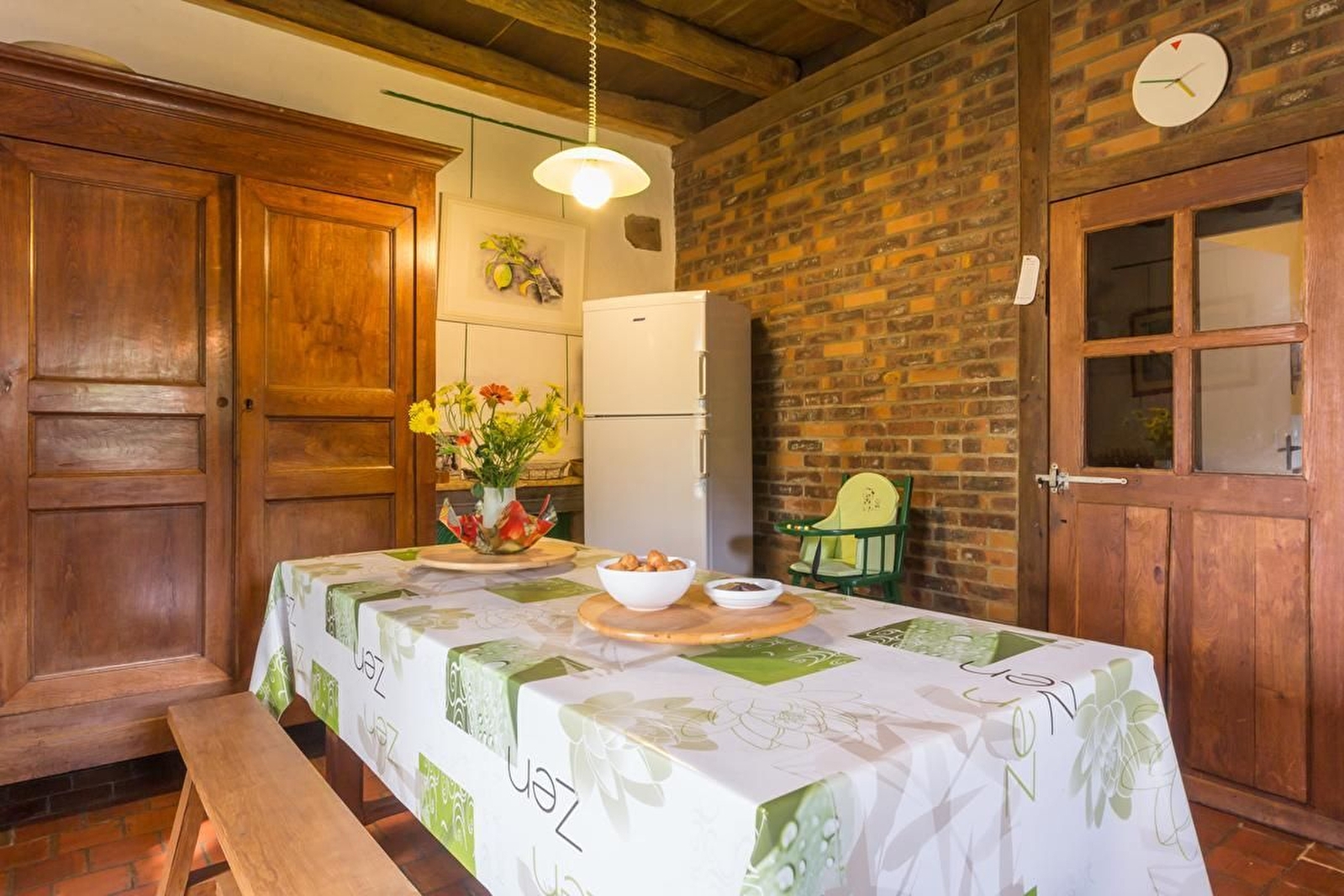 Rez-de-jardin, accessible par un escalier en pierre et ouvrant sur une grande terrasse en angle avec pelouse. Cuisine et salle à manger-salon avec poêle à bois donnant sur une véranda. Salle de bains, WC indépendant et buanderie.