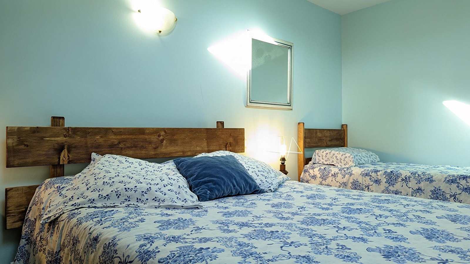À l'étage : une salle de bain mansardée (faible hauteur dans la baignoire) avec un WC, chambre 1 composée d'un lit simple (90x190) et d'un lit double (140x190), chambre 2 composée d'un lit simple (90x190) et d'un lit double (160x190). Pour votre confort, les lits seront faits à votre arrivée.