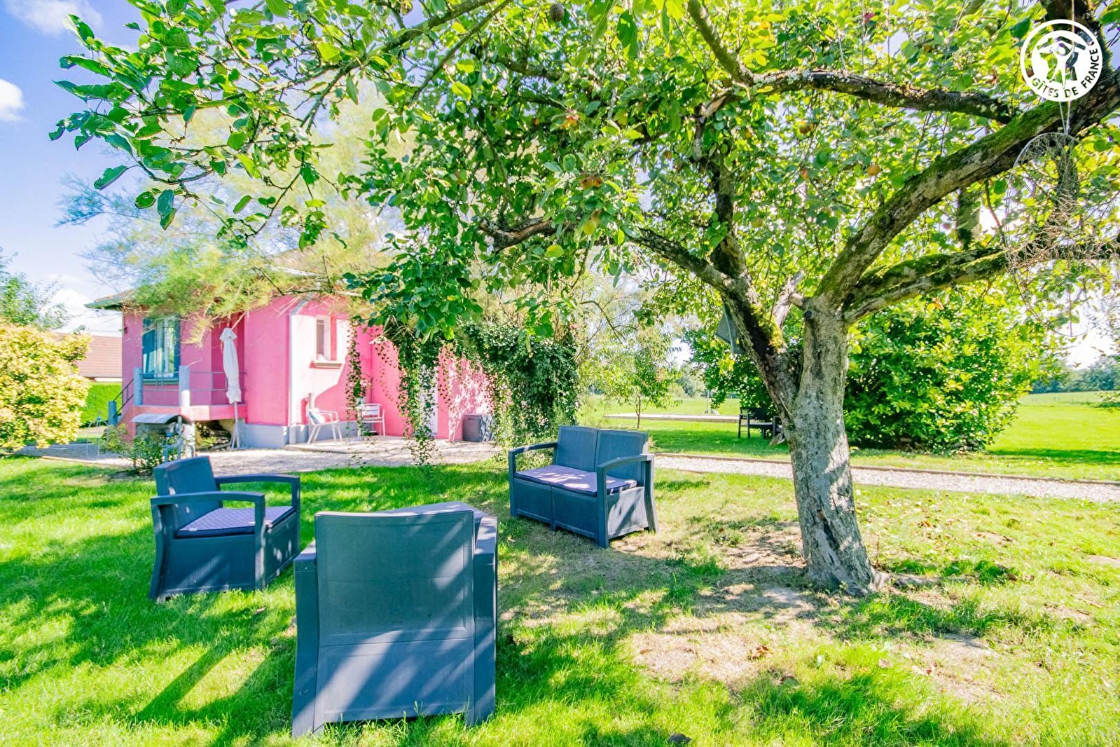 Toutes deux passionnées de "déco" & d'horticulture, Francine & Brigitte vous ouvrent les portes d'une ravissante demeure "fifties" soigneusement "relookée", voisinant la charmante ferme bressane traditionnelle qu'elles occupent, elle également parfaitement rénovée, abritant leur "maison d'hôtes". Calme & totale tranquillité, blotti en pleine campagne en lisière d'un vaste plateau "ouvert" de champs & prairies boisés, à deux pas d'une belle forêt sauvage & de bucoliques étangs. Paisible petit hameau rural résidentiel, proche du centre bourg commerçant de Simard, petit village bressan typique riche d'une majestueuse & rare église en brique au clocher néo roman. Bucolique cadre champêtre préservé, mixant agriculture & pleine nature. Enchanteur & reposant. Gîte de très bon confort. Belle pièce de vie au "volume cathédrale". Chaleureux cachet d'esprit "campagne chic" aux accents contemporains sublimé par les riches traces du bâti d'origine dont un magnifique assortiment de sols en mosaïque, carreaux de ciment et "terrazzo". Énormément de charme & caractère. Ultra cosy & douillet. Ambiance lumineuse, zen & douce. Agréable jardin engazonné de 1000m², arboré, fleuri & végétalisé, abritant une insolite terrasse lovée sous une gloriette avec tonnelle (complétée par une mini terrasse), un terrain de pétanque, table ping-pong, mini cage de foot & filet de volley-badminton. Véritable aire de jeux sécurisée pour les enfants.
