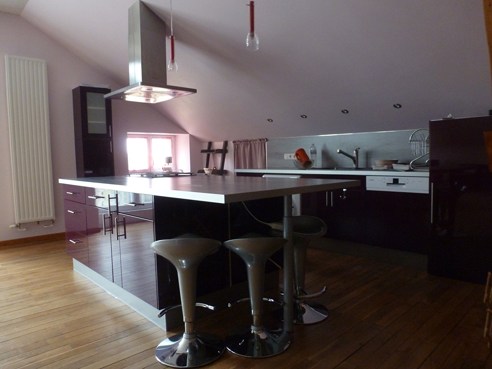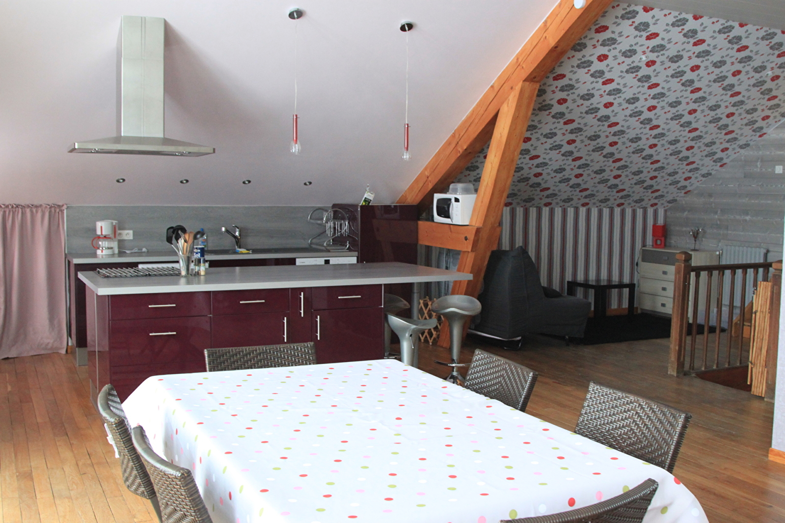 Le logement se situe au deuxième étage avec accès indépendant de plain-pied. Il est tout équipé pour 6 personnes : une grande pièce à vivre avec un poêle à granulés, une cuisine aménagée, une salle de bains, une chambre indépendante avec un lit en 140, un clic clac et un bz placé dans la pièce principale (les couettes et les oreillers sont mis à disposition, prévoir linge de lit et linge de toilette, possibilité de location du linge).