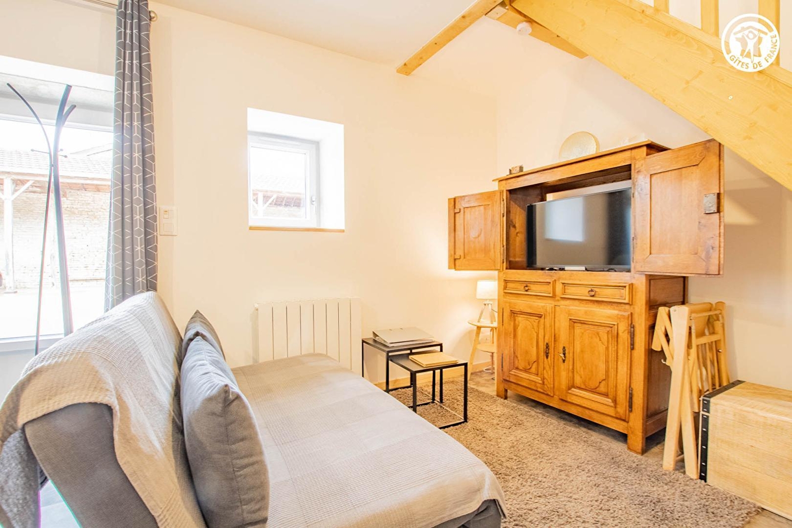 Audrey & Eric vous ouvrent les portes d'élégantes authentiques écuries datant du XIXème siècle intégralement restaurées avec soin (jadis liées à la ferme de pays qui occupait les lieux, dont demeurent les imposants anciens préaux "séchoir"), nichées au creux d'une intimiste vaste cour intérieure sise en bordure de ruelle au sein d'un paisible & pittoresque petit hameau rural résidentiel abritant une belle chapelle prieurale romane du XIIème siècle (aujourd'hui revisitée en espace d'exposition d'œuvres d'art). A deux pas des rives de la Saône, en pleine campagne du haut Mâconnais, apaisant écrin préservé de montagne douce aux bucoliques paysage vallonnés conjuguant coteaux de vignobles (premières vignes à seulement 1.5 km), champs, prairies & belles forêts, blotti au pied de la montagne de Burgy (massif sauvage offrant un exceptionnel belvédère panoramique jusqu'au Mont-Blanc par temps clair !). Village viticole doté de l'appellation "Viré Clessé", Montbellet dispose d'un riche patrimoine (église et chapelle romane des XII & XIème siècle, plusieurs châteaux notamment médiévaux, très nombreux moulins, lavoirs, vestiges d'une commanderie du XIIIe…). Gîte de très bon confort. Chaleureux cachet campagnard aux accents contemporains. Cosy & douillet. Ambiance zen & douce. Agréable terrasse privative exposée (ombragée l'été) ouverte sur la cour, littéral "terrain de pétanque naturel". En bonus : en leur compagnie, vous pouvez rendre visite au poulailler des propriétaires comme à leurs 2 boucs nains, parqués à l'arrière de la propriété.
