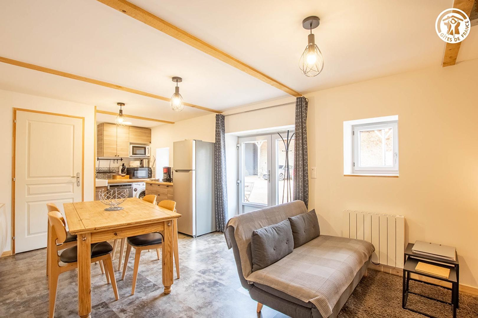 Composition : Maison individuelle jouxtant la maison des propriétaires (totale indépendance). Wifi (fibre). Chauffage électrique. Étage climatisé. Rdc : séjour-cuisine-salon, Wc indépendant. 1er étage : 2 chambres (lit 2 p. 160x200cm / 2 lits 1 p. 90x190cm superposés) dont une abritant la salle d'eau (douche). Terrasse + parking privés. Abri voitures couvert. Local vélos. Cour en commun. Petits commerces 7 km. Supermarché 9 km.