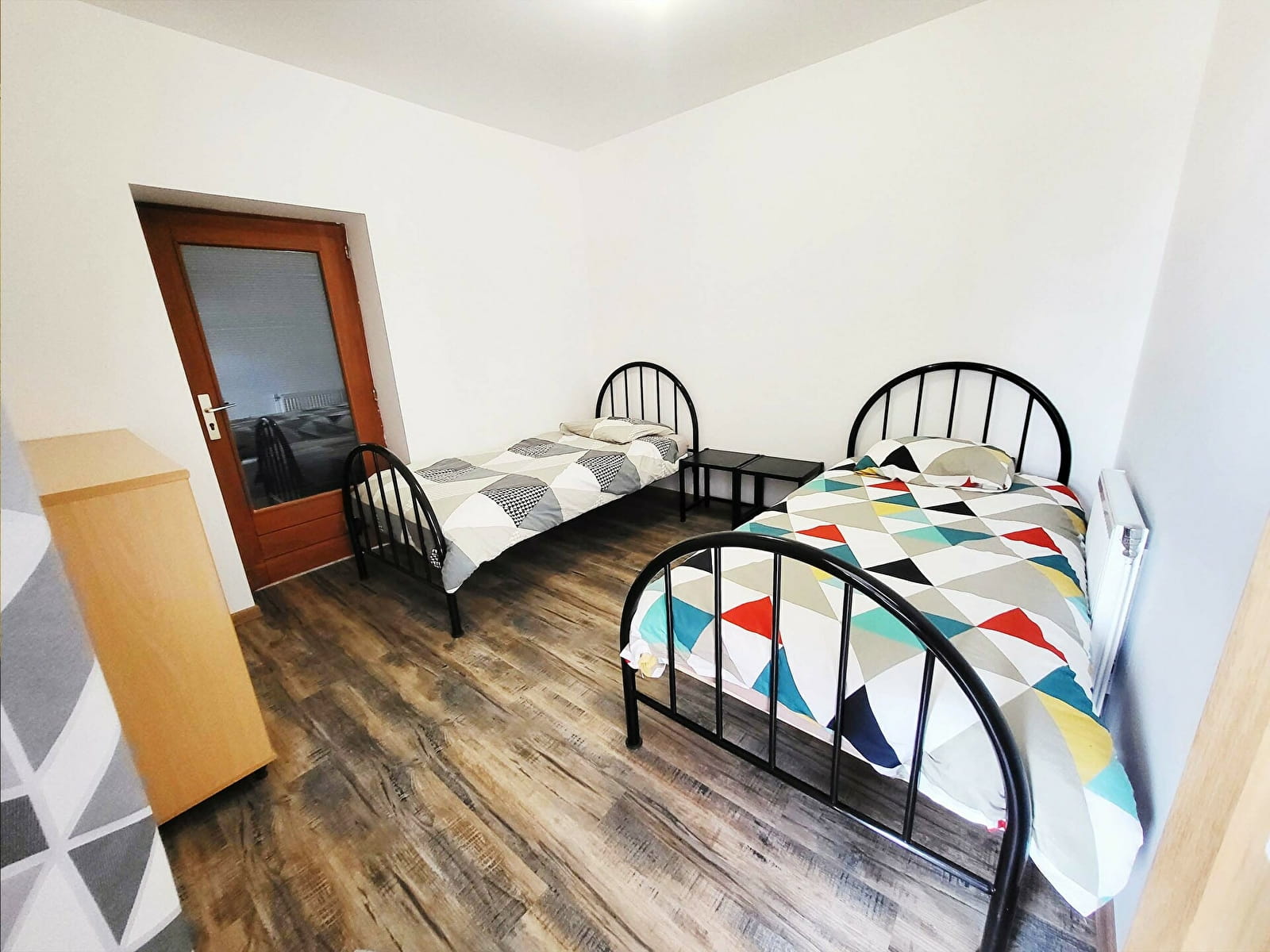 Chambre : 2 lits simples, Chambre : 1 lit Queen size + 1 lit simple. les draps des 2 chambres sont fournis, lit bébé de type parapluie, gratuit. Salle de bain avec douche à jet de massage attenante à la grande chambre. Toilettes séparées.