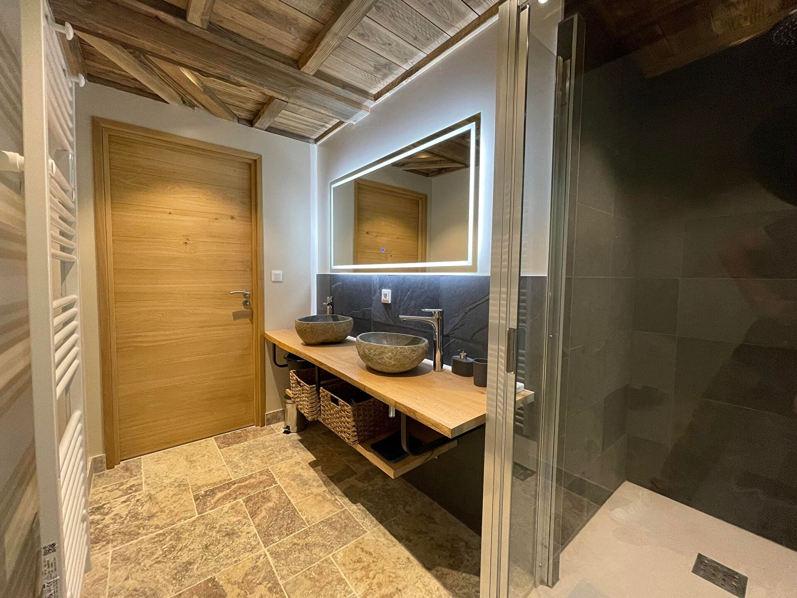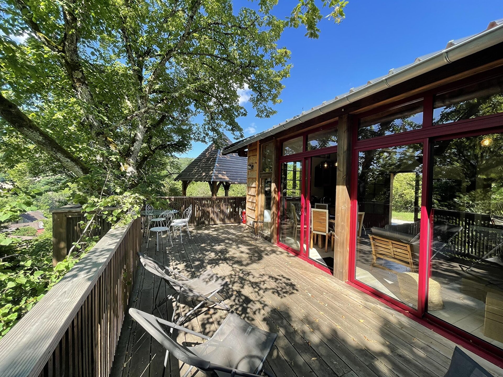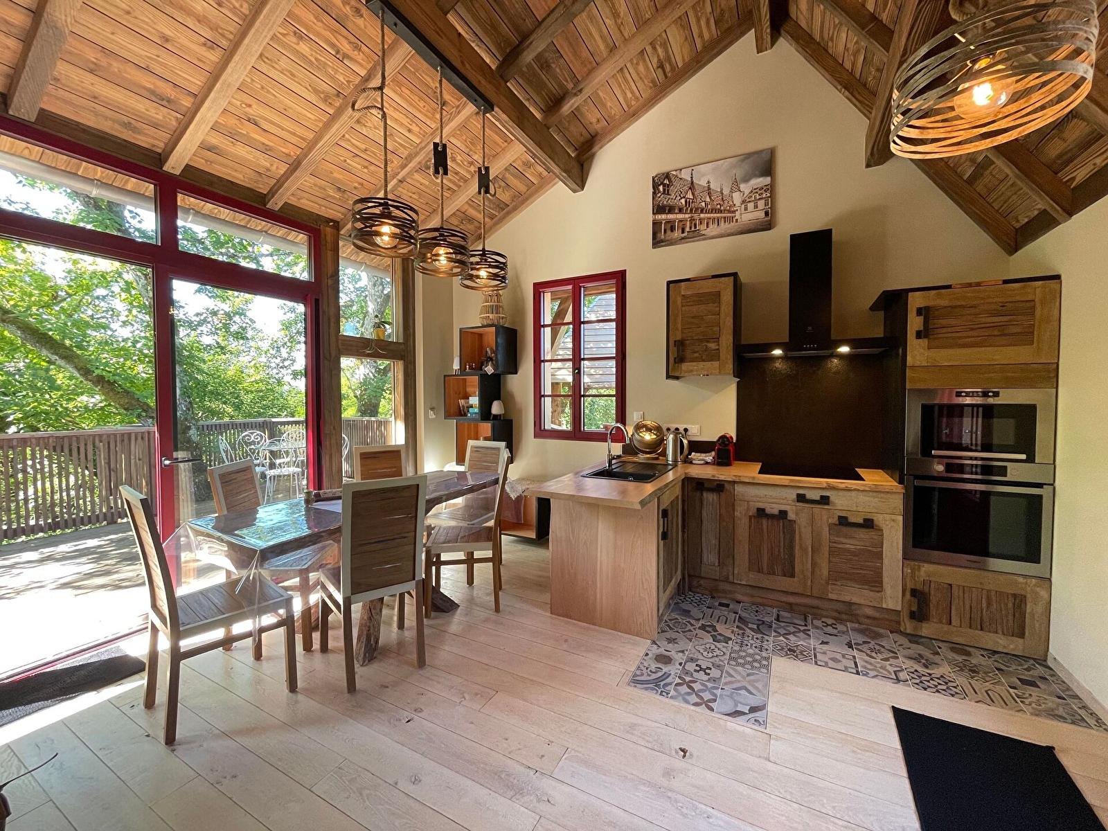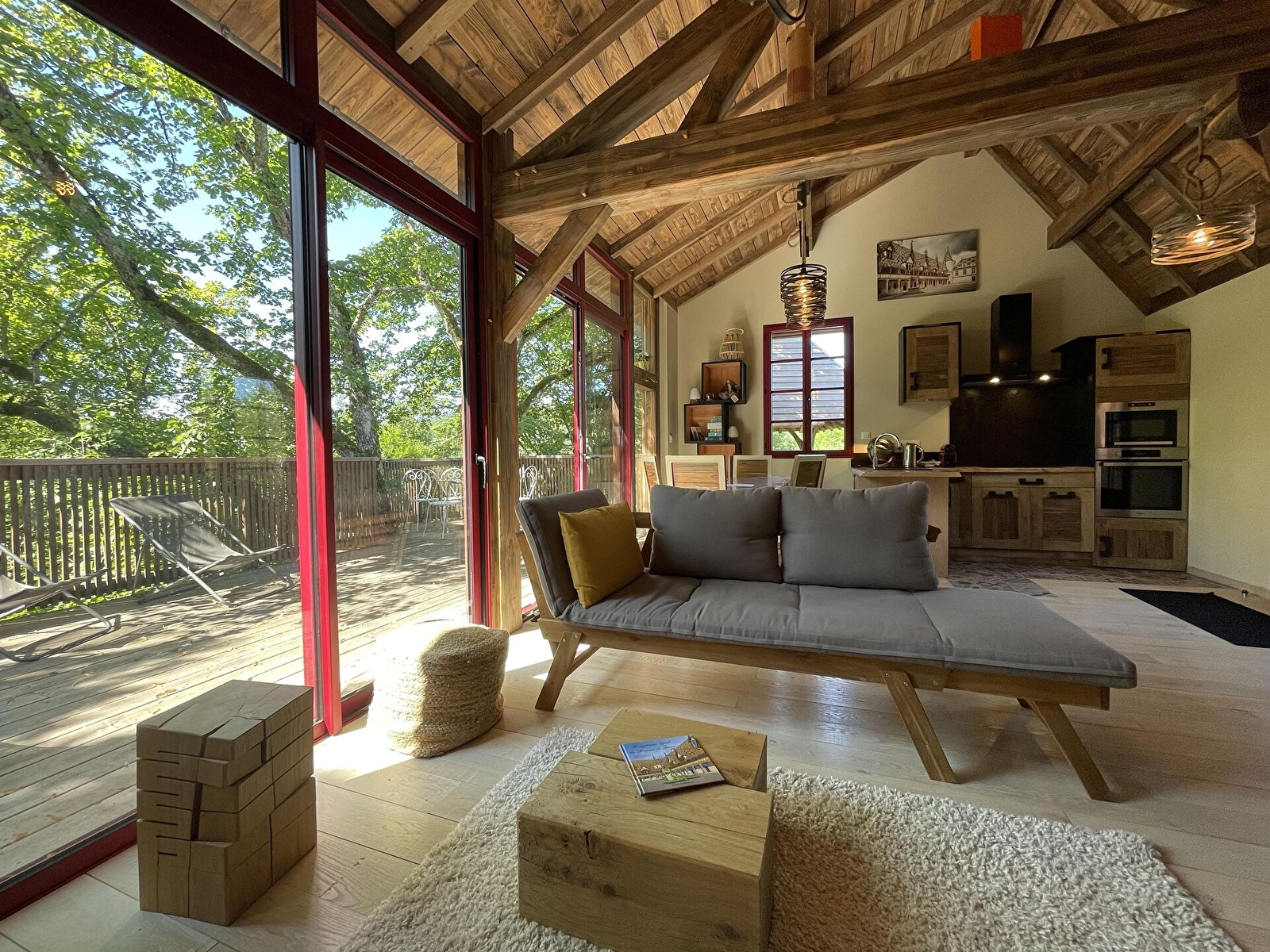 Un large salon/salle à manger avec cuisine ouverte toute équipée s'ouvre sur une terrasse ombragée. Un ponton vous mènera au SPA extérieur abrité. La salle d'eau moderne est équipée d'une large douche avec double colonne (2 douches) et d'une double vasque. WC indépendants.