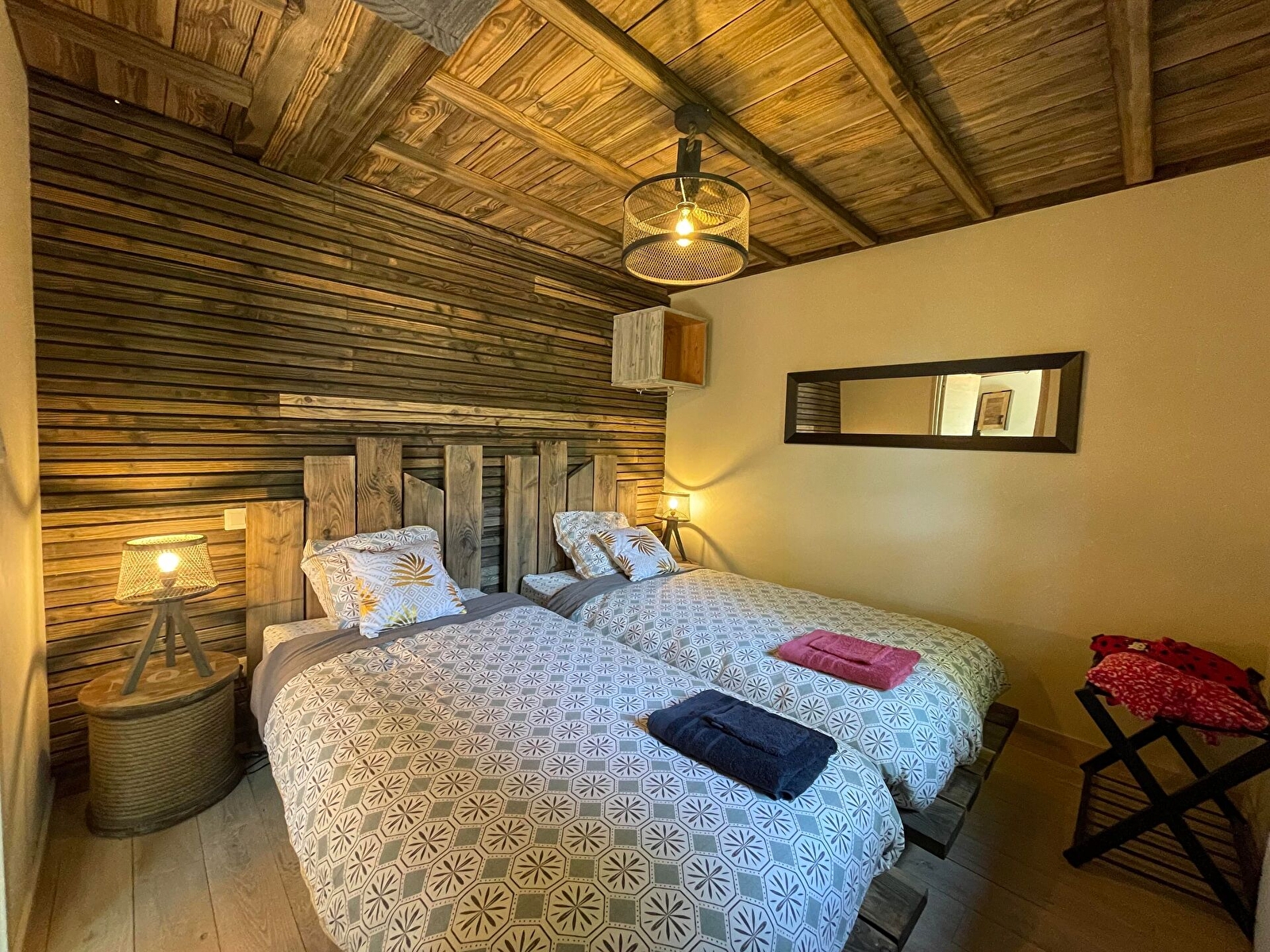 Deux belles chambres en rez-de-chaussé, l'une avec un lit en 160x200 et l'autre avec de deux lits en 90x200 jumelables, sont complétées par un couchage supplémentaire sur mezzanine pour 2 personnes, par laquelle vous accédez par une échelle de meunier.