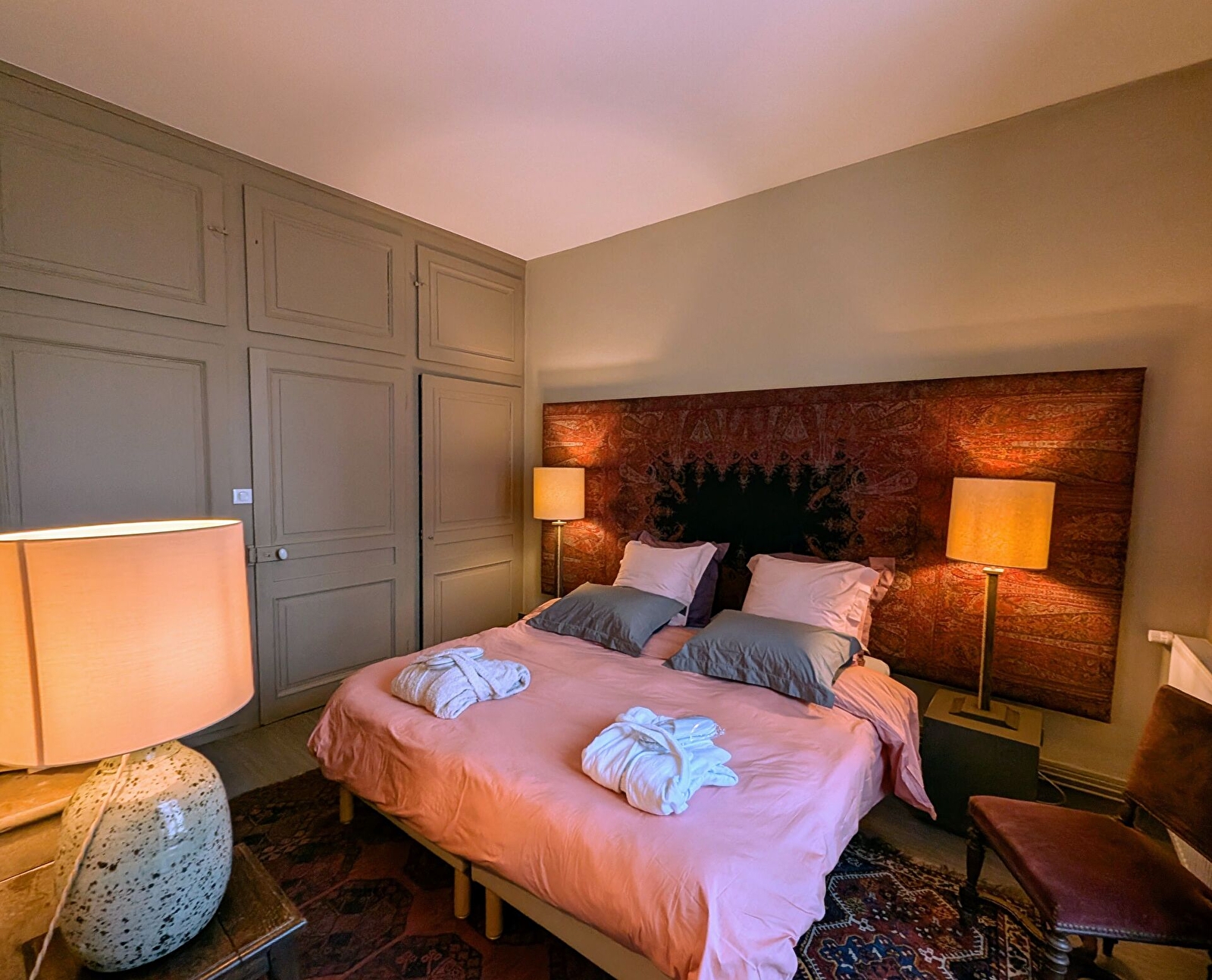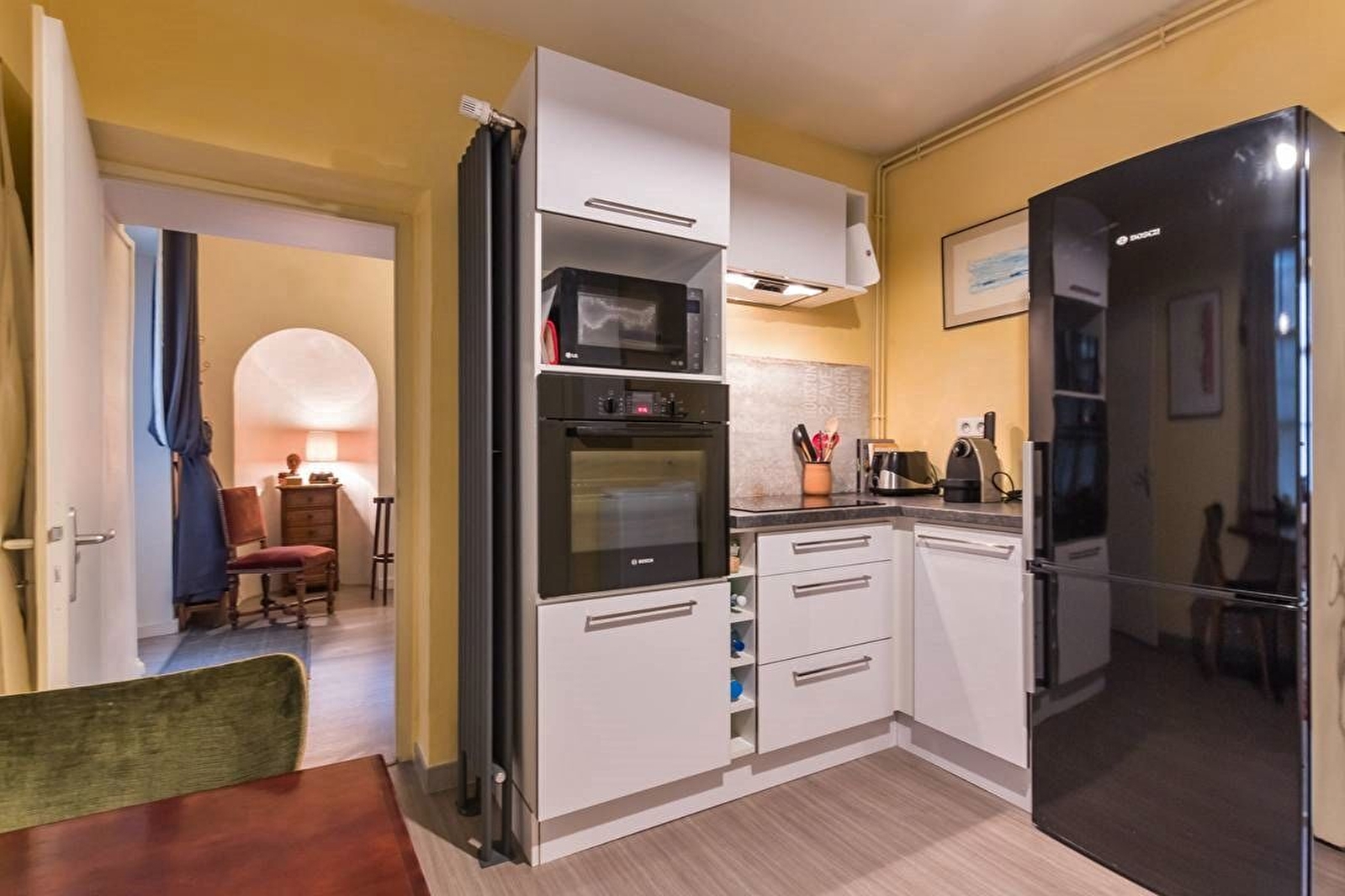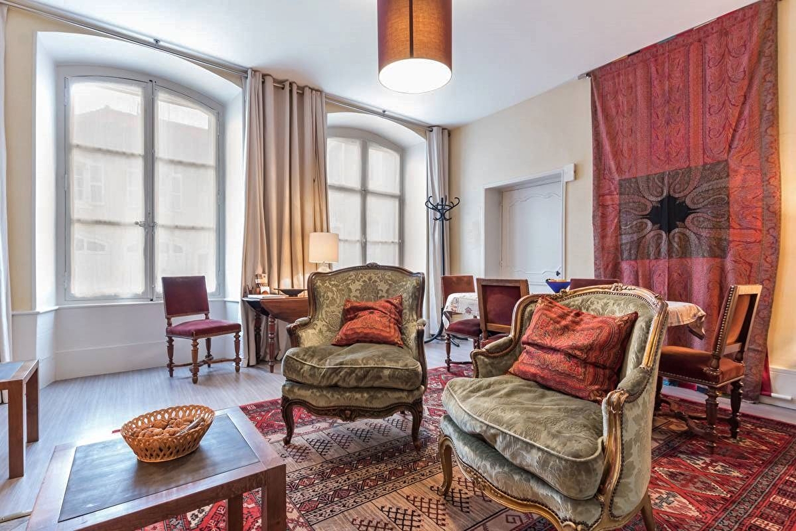 Au cœur du centre historique de Vesoul, vous séjournez dans un très bel appartement situé en RDC de l'hôtel particulier du 18ème siècle, l'hôtel Lyautey de Genevreuille, classé au patrimoine des Monuments Historiques, faisant face à l'hôtel Thomassin, célèbre maison du vieux Vesoul, pour sa magnifique façade. Décoration soignée et raffinée : tapisserie en cachemires, meubles anciens, peintures, poteries, cheminées décoratives... Il comprend : un salon/salle à manger, une chambre (2 lits 90/200 jumelés), un espace détenter libre de 8m2. (un lit bébé peut vous être mis à disposition). Nombreux rangements. Une cuisine moderne et tout équipée. Une salle d'eau - Wc. Parking privatif dans la cour commune et fermée la nuit par le portail en fer forgé. Pour votre confort : le linge de toilette, peignoirs, linge de lits et lits faits à l'arrivée. Charges comprises et ménage inclus. Internet WIFI avec la fibre.