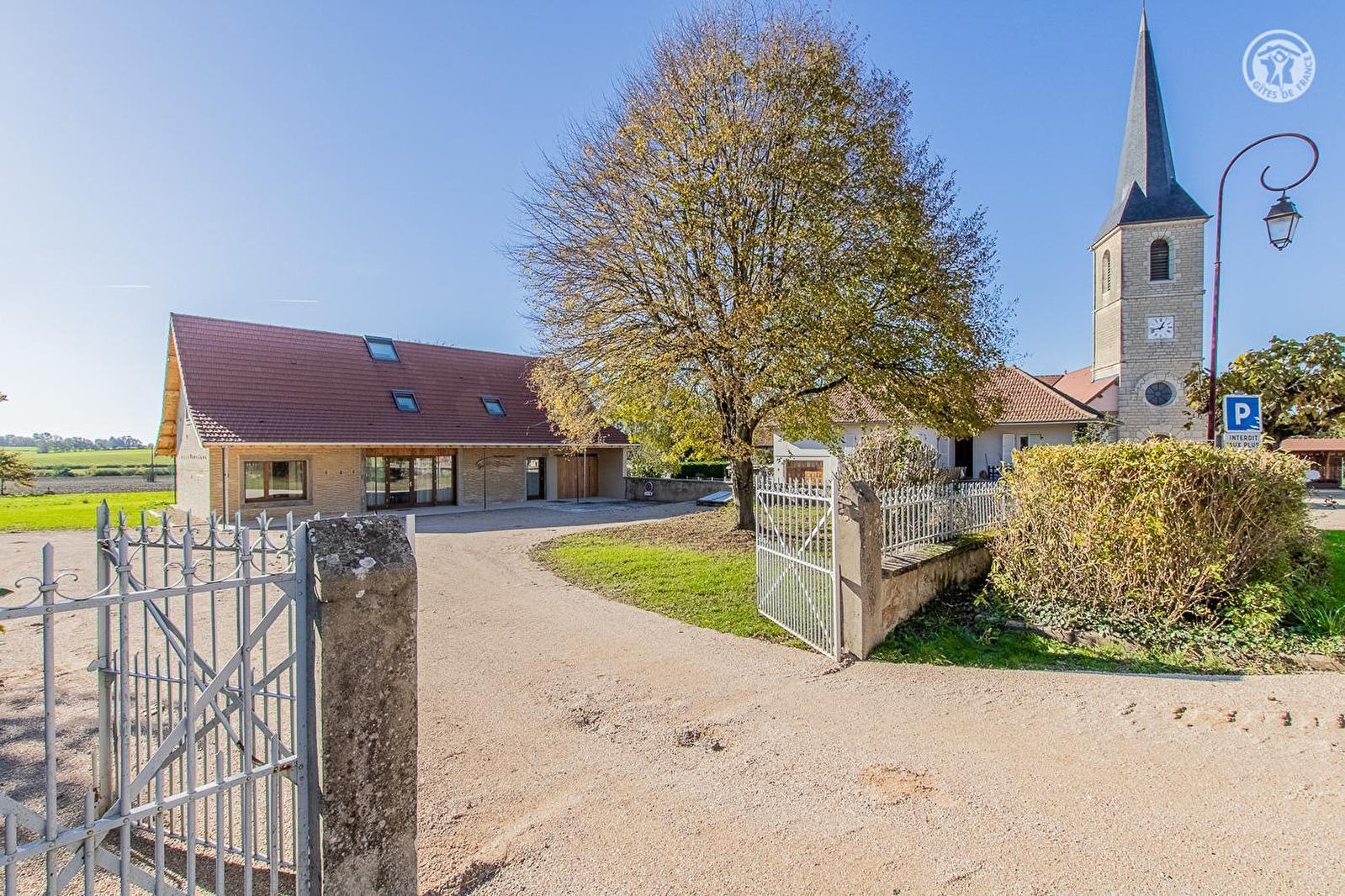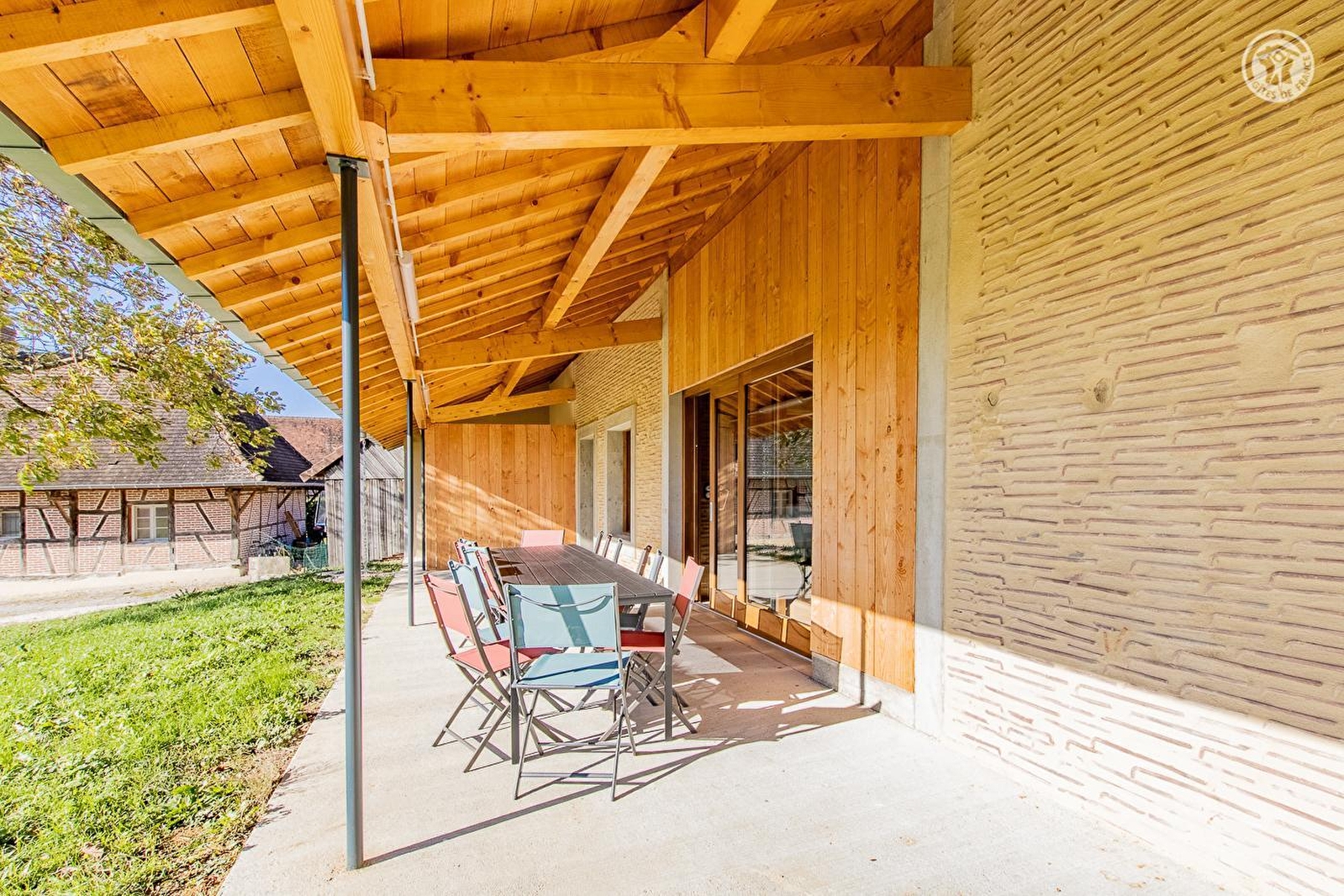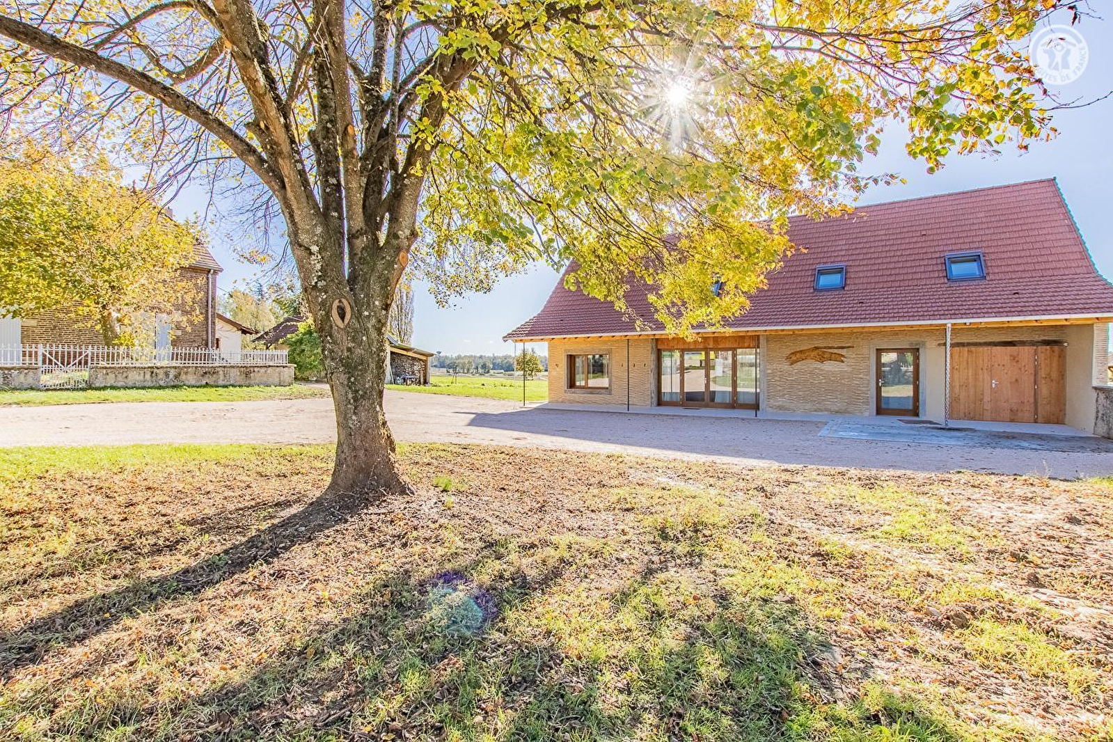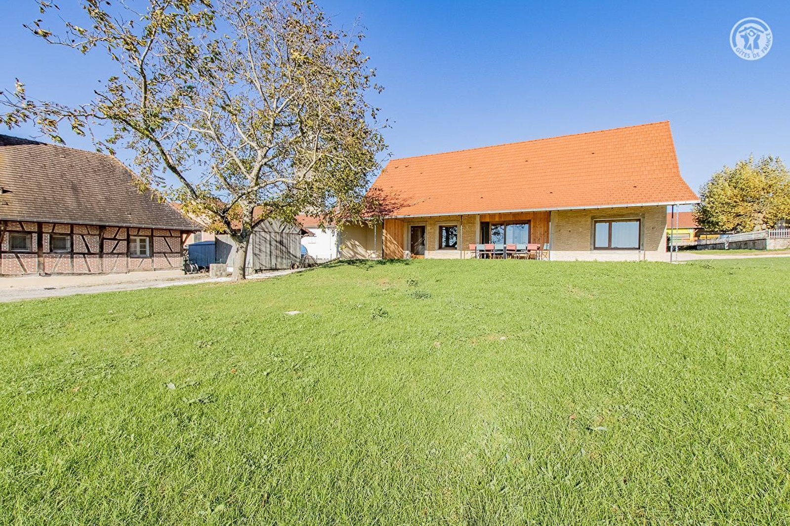 Ravissante authentique ferme traditionnelle du XIXe siècle de type longère, dotée d'une rare & atypique structure architecturale en "tuiles couchées", revisitée par la commune en ultra confortable villégiature dans une logique d'éco-construction globale (restauration intégrale très soignée respectant l'exigeant dispositif régional "Effilogis"), nichée en plein cœur d'un paisible petit village de la campagne bressanne. Calme & tranquille, Bosjean dispose d'un citystade (sis à deux pas du gîte) et d'un "verger conservatoire" (avec pommiers, pruniers, poiriers, cassis, groseille… / cueillette autorisée) et profite d'une apaisante campagne environnante conjuguant agriculture & pleine nature, en partie classée et protégée en ZNIEFF pour sa richesse faunistique & floristique, blottie au creux d'une apaisante plaine de prairies bocagères, légèrement vallonnée, à l'orée d'une vaste forêt sauvage & proche des rives de la Seille (rivière poissonneuse). Spacieux gîte de très bon confort. Grande pièce de vie. Chaleureux cachet contemporain sublimé par la conservation des insolites et très élégants murs en "tuiles couchées" du bâti d'origine. Beaucoup de charme. Cosy & douillet. Très vaste terrasse abritée ouverte sur un agréable jardin engazonné de 2000m², parfaite "aire de jeux" pour les enfants, ou trône un noyer (cueillette possible). Grande cour (potentiel terrain de pétanque naturel pour les aventureux !). Belle vue dégagée sur la douce campagne environnante.