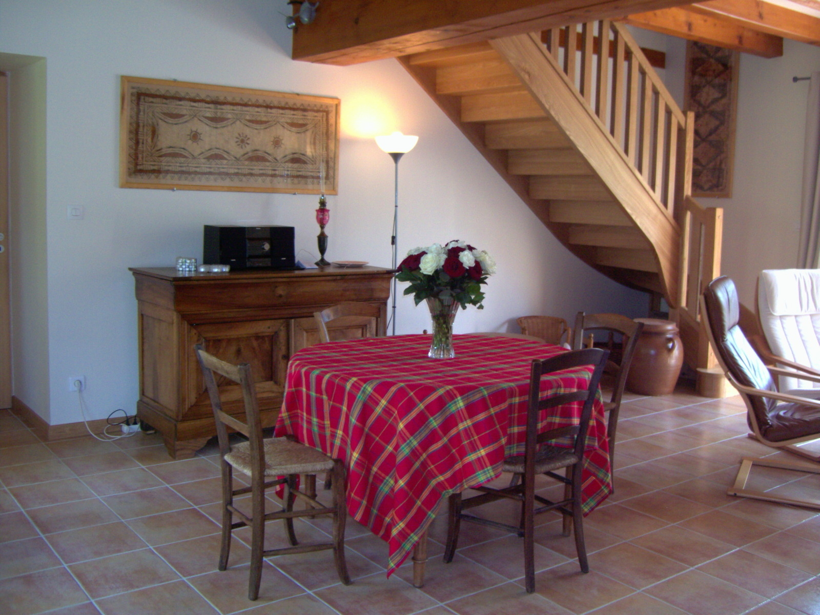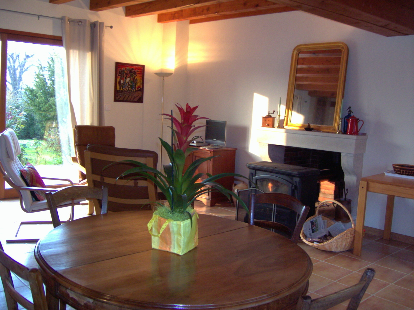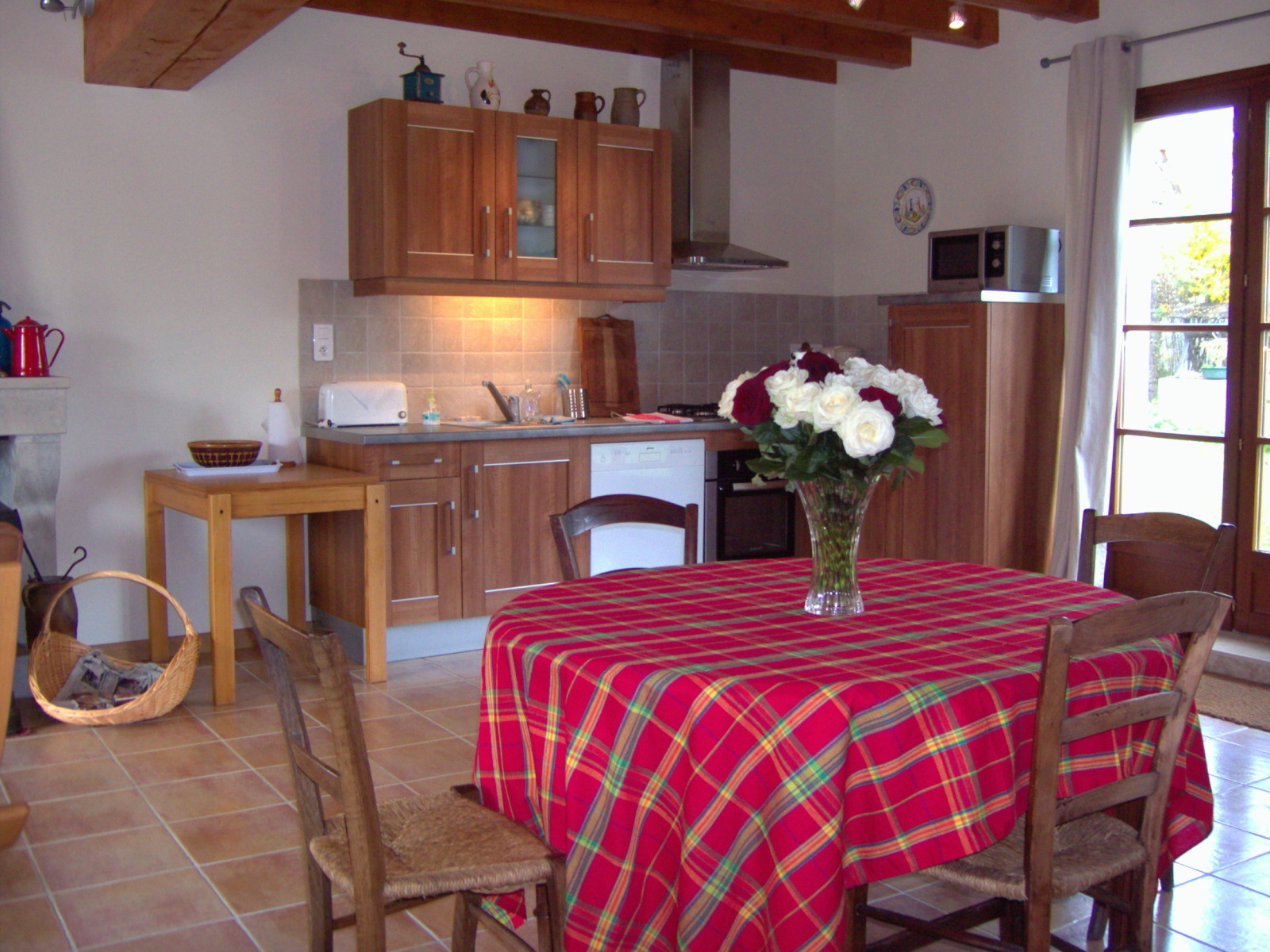 Au RDC : vaste pièce à vivre avec coin-cuisine équipé haut de gamme. Cheminée foyer ouvert ou poêle selon saison, TV, lecteur DVD, accès internet, chaine Hi-Fi. Vestiaire/buanderie avec lave-linge.