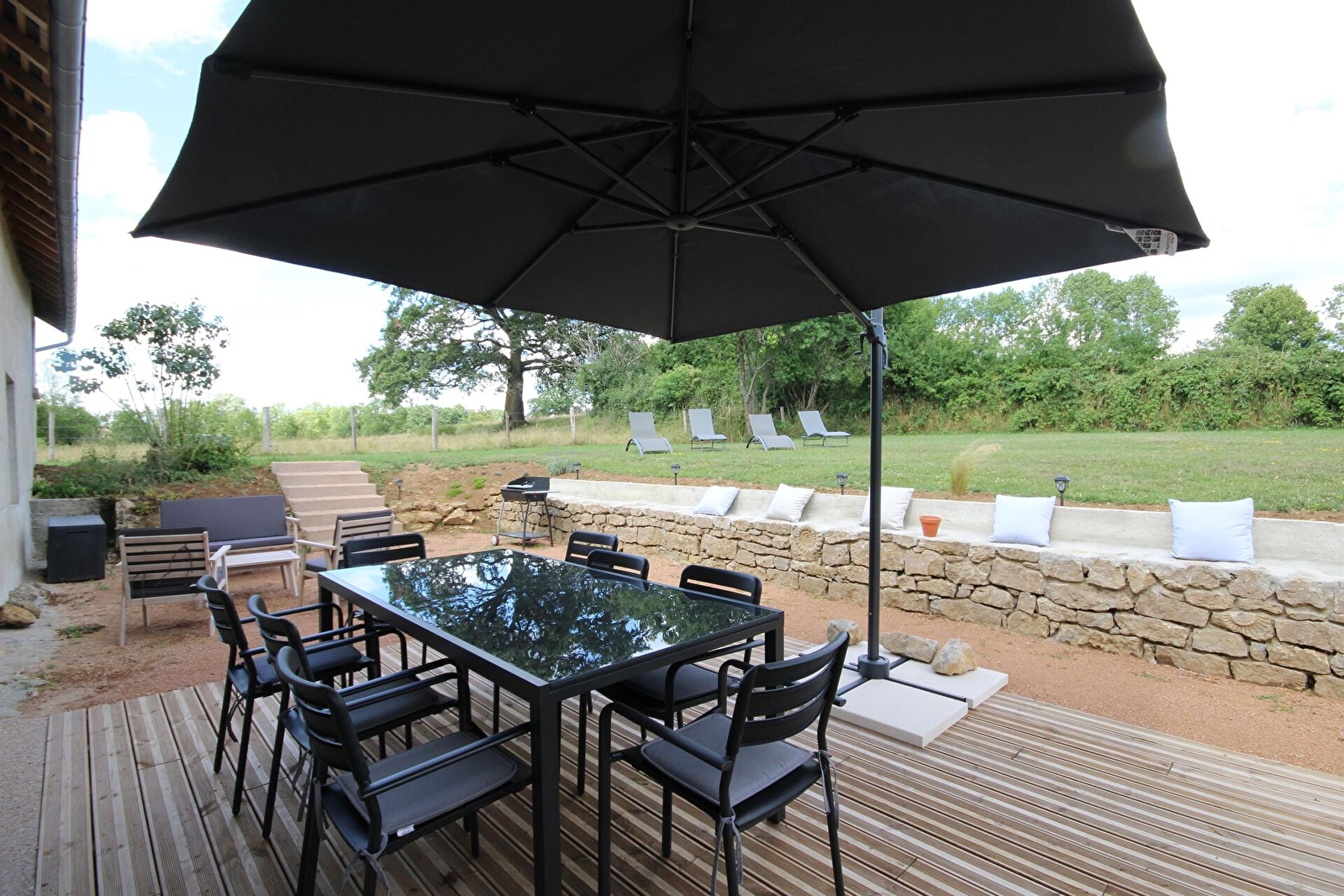 Maison individuelle avec jardin non clos, terrasse à l'arrière sans vis-à-vis avec salon de jardin et salon de détente, transats et terrain de pétanque sur le devant de la maison. Au départ d'un chemin de balade agréable. Piscine extérieure hors sol non chauffée de 2,80mx7,80m accessible selon météo de juin à septembre. Au départ d'un chemin de balade agréable.