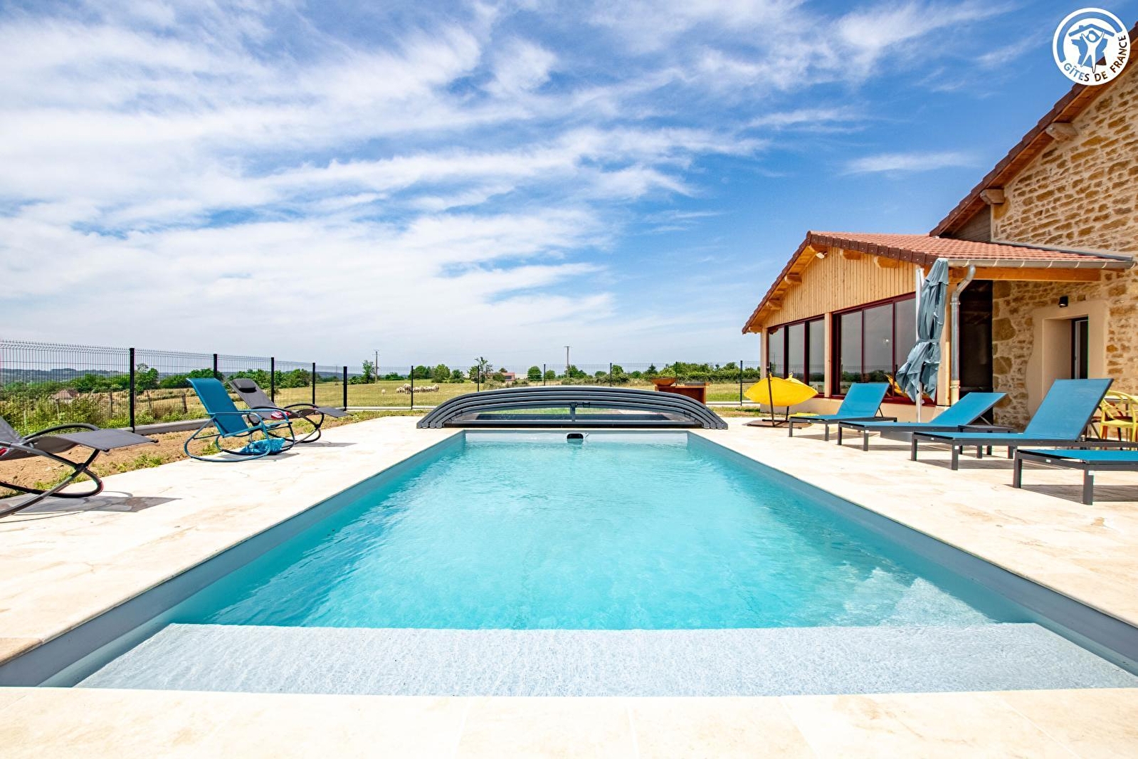 Authentique ferme traditionnelle de la fin XIXe très soigneusement restaurée blottie au calme, en "balcon" & "belvédère" panoramique à flanc de coteau ouest bien exposé, au sein d'un paisible hameau rural "dispersé" niché en pleine campagne brionnaise sur l'une des sept collines dominant le Val de Loire que compte le charmant bourg typique & commerçant d'Iguerande ("site Clunisien" riche d'une élégante église romane classée du XIIe). Magnifique cadre champêtre de bucolique bocage vallonné, lové en lisière de prairies (avec comme seules voisines, les célèbres vaches charolaises) à deux pas des rives de la Loire (magnifique espace naturel protégé pour son très riche écosystème faunistique & floristique), proche de petites forêts sauvages. Gîte de grand standing. Hyper spacieux & lumineux. Exceptionnelle pièce de vie de 70m² dotée d'un très imposant volume "cathédrale". Chaleureux cachet contemporain, cossu & raffiné. Ambiance zen & douce. Énormément de charme & caractère. Ultra cosy. Intimiste propriété close de 3000m² comprenant un grand jardin avec balançoire, belle piscine (8x4m), large terrasse (exposée & ombragée), vaste terrasse sous véranda (abritant un salon de détente & spa 5 places) et terrain de pétanque. Splendide vue dégagée sur la campagne environnante & les monts du roannais en toile de fond. Magnifique panorama & paysages. Accès à un sauna en bonus.