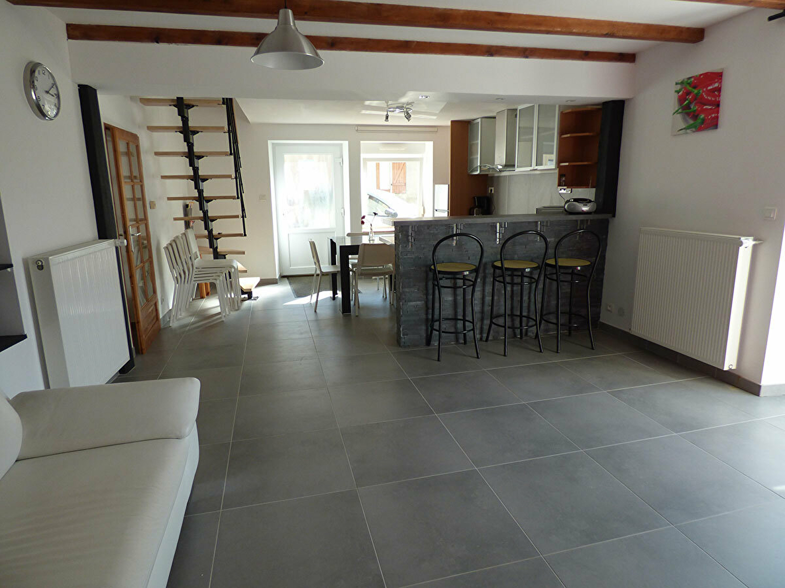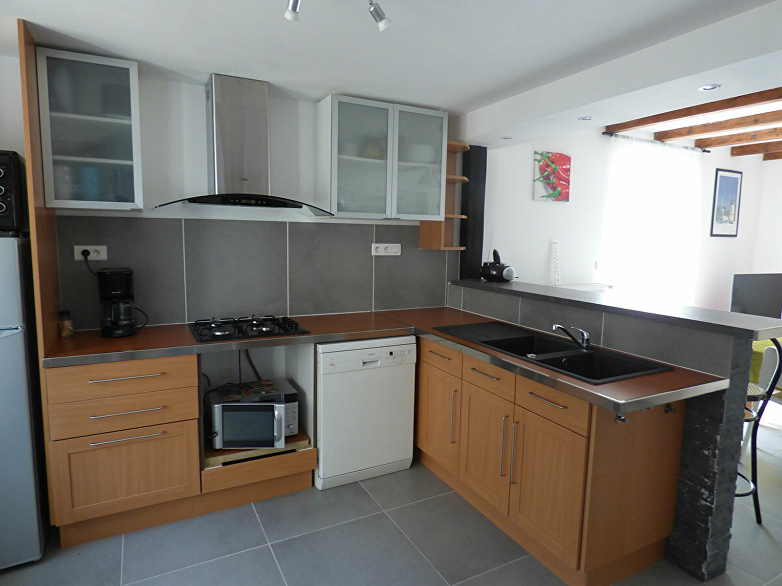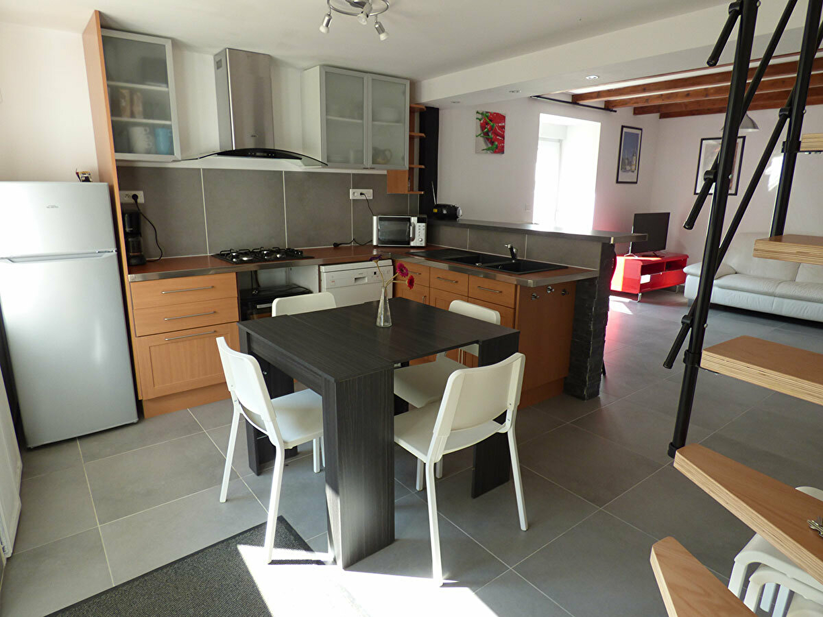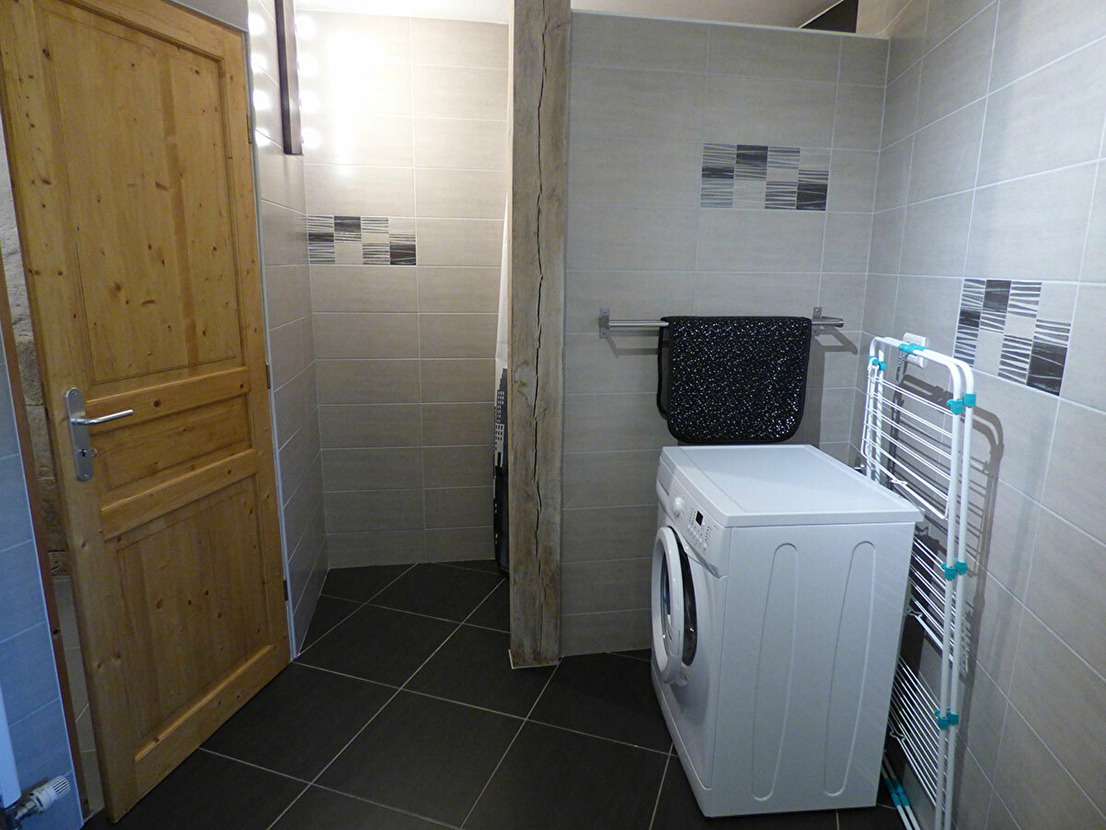 Ce gîte prévu pour recevoir jusqu'à neuf personnes, dispose d'un extérieur cloturé (en cours d'aménagement) , il est composé au rez de chaussé d'une grande pièce à vivre (deux canapés, télévision...), d'un coin cuisine parfaitement équipé (four, lave-vaisselle, micro-ondes, cafetière, matériel de cuisine, etc...), et d'une salle de bain (douche, WC, meuble vasque, lave-linge...)