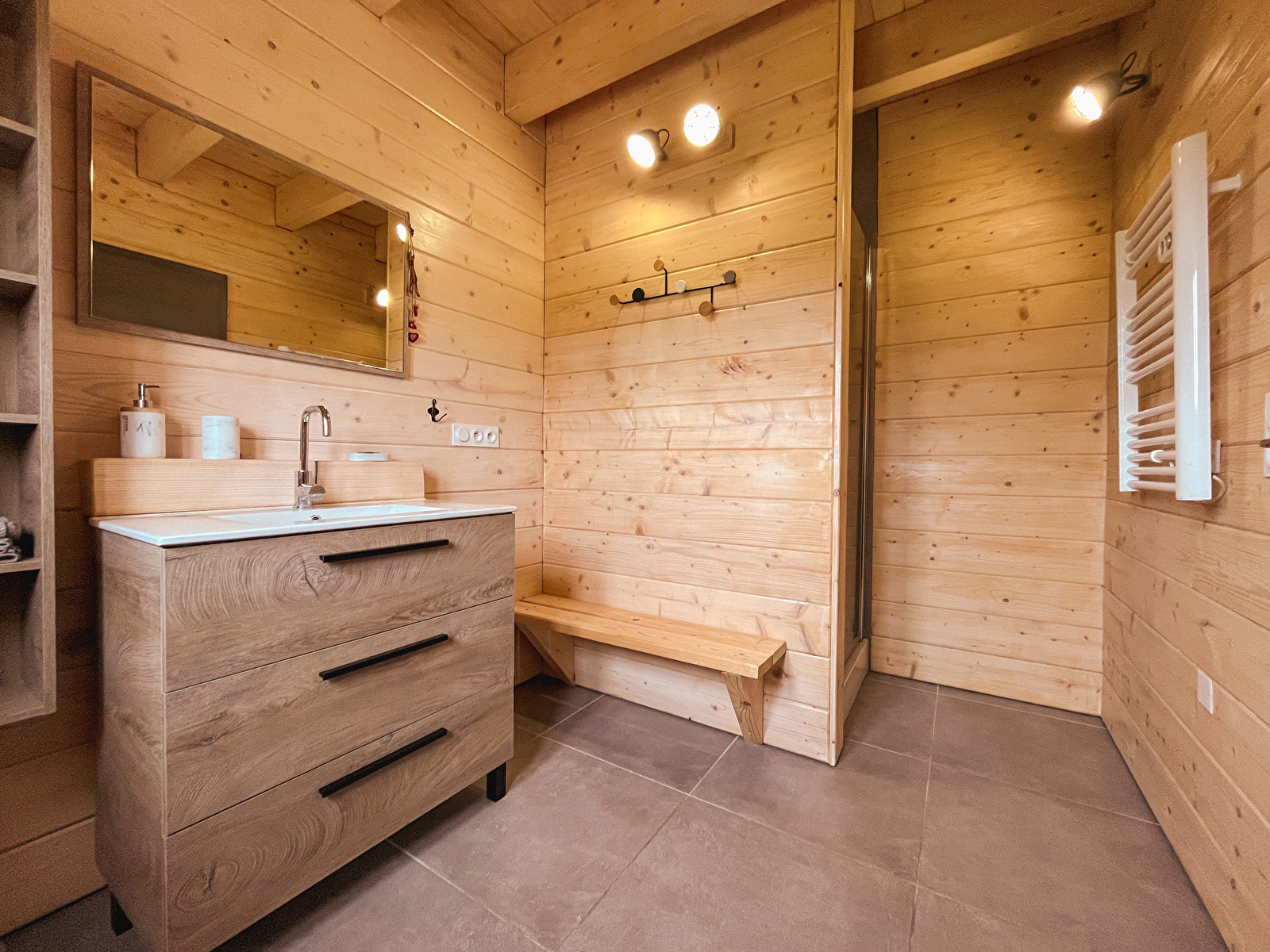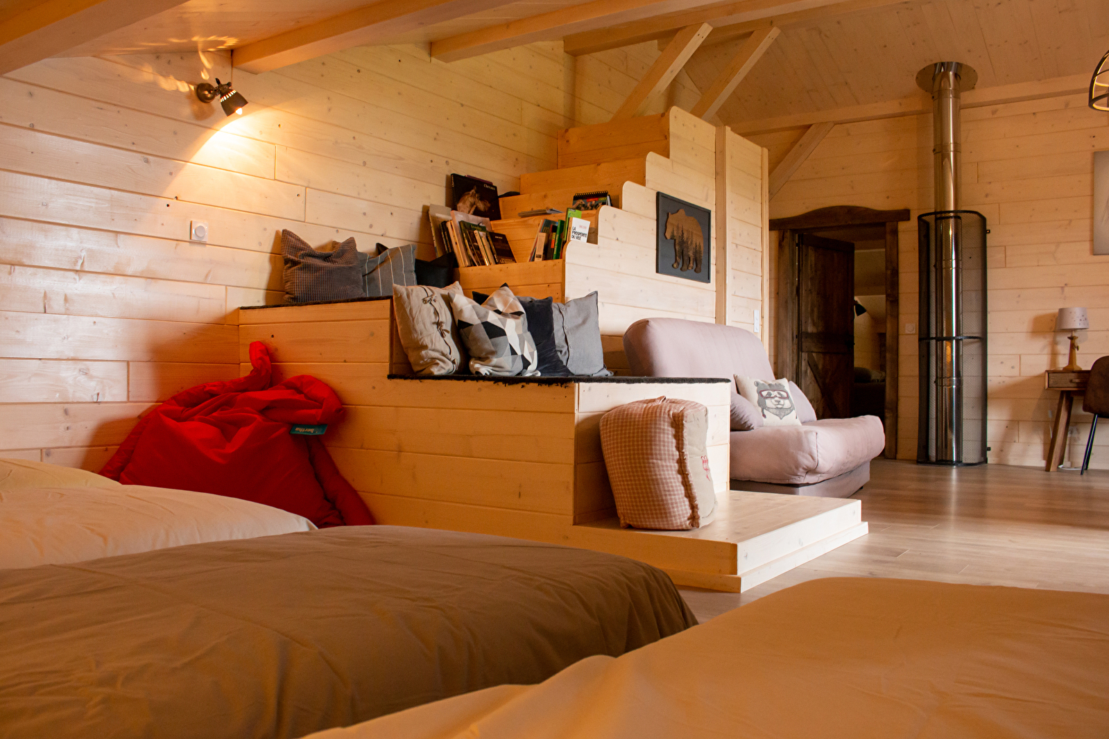 Le concept est basé sur un esprit refuge avec deux chambres seulement à l’étage plus une grande pièce permettant le couchage format dortoir.