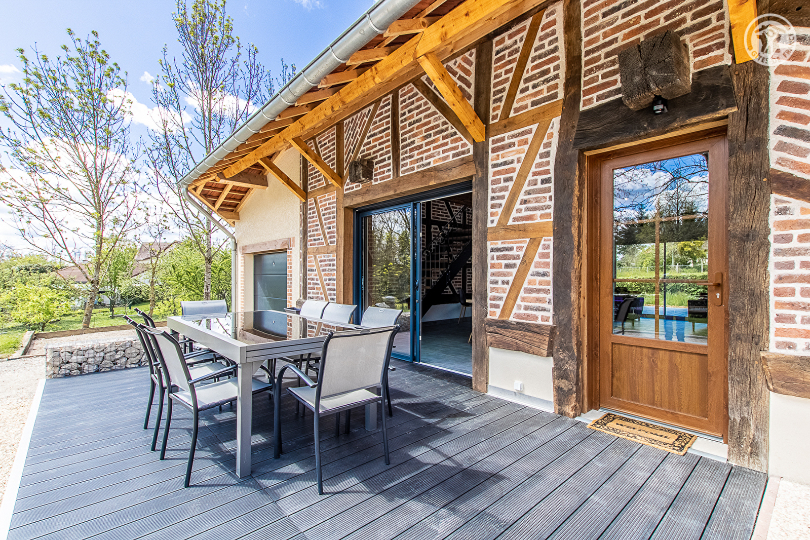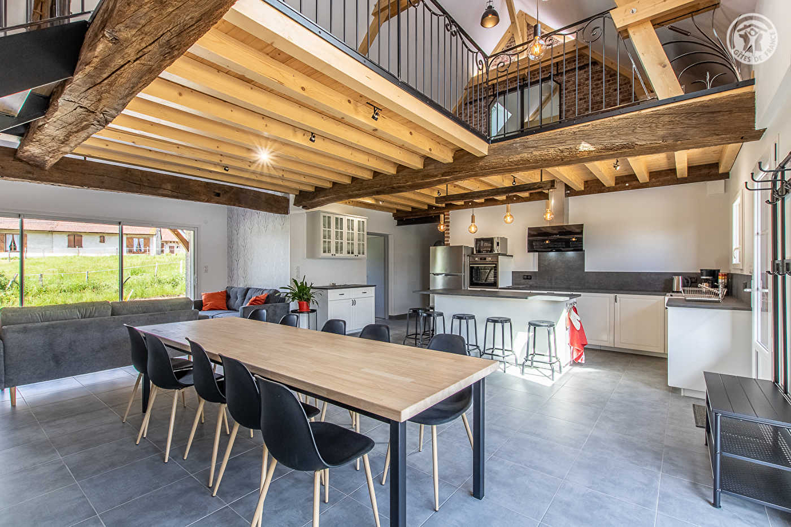 Denis, ferronnier d'art dont vous pourrez apprécier le travail dans le gîte, & Valérie vous accueillent au sein d'une élégante ferme bressane de caractère du 19ème siècle - d'architecture traditionnelle en pierres & pans de bois - soigneusement restaurée dans les règles de l'art. Calme & tranquillité au cœur d'un petit hameau rural niché en pleine campagne, en lisière de prairies & forêt, à deux pas du bourg commerçant de Saint-Usuge blotti sur les rives de la Seille, remarquable écosystème en partie classé « Zone Natura 2000 » (réserve d'oiseaux migrateurs, espèces végétales rares, nombreux poissons dont les célèbres silures, animaux et faune sauvage…). Grand confort. Vaste séjour & pièces aux dimensions nobles. Chaleureux cachet campagnard contemporain que sublime une restauration patrimoniale soignée (poutres, majestueuse ferme de la charpente, mur en briques & pans de bois d'origine). Ambiance douillette & zen, baignée d'une douce sobriété. Équipement complet de grande qualité (dont billard & baby-foot). Double large terrasse exposée & ombragée dont une abritée dotée d'un salon de détente « outdoor ». Agréable jardin engazonné & arboré avec terrain de pétanque, jouxtant un petit pré où pâture Roxanne la jument des propriétaires et leur poulailler (à l'écart du gîte), pour le plaisir des enfants.