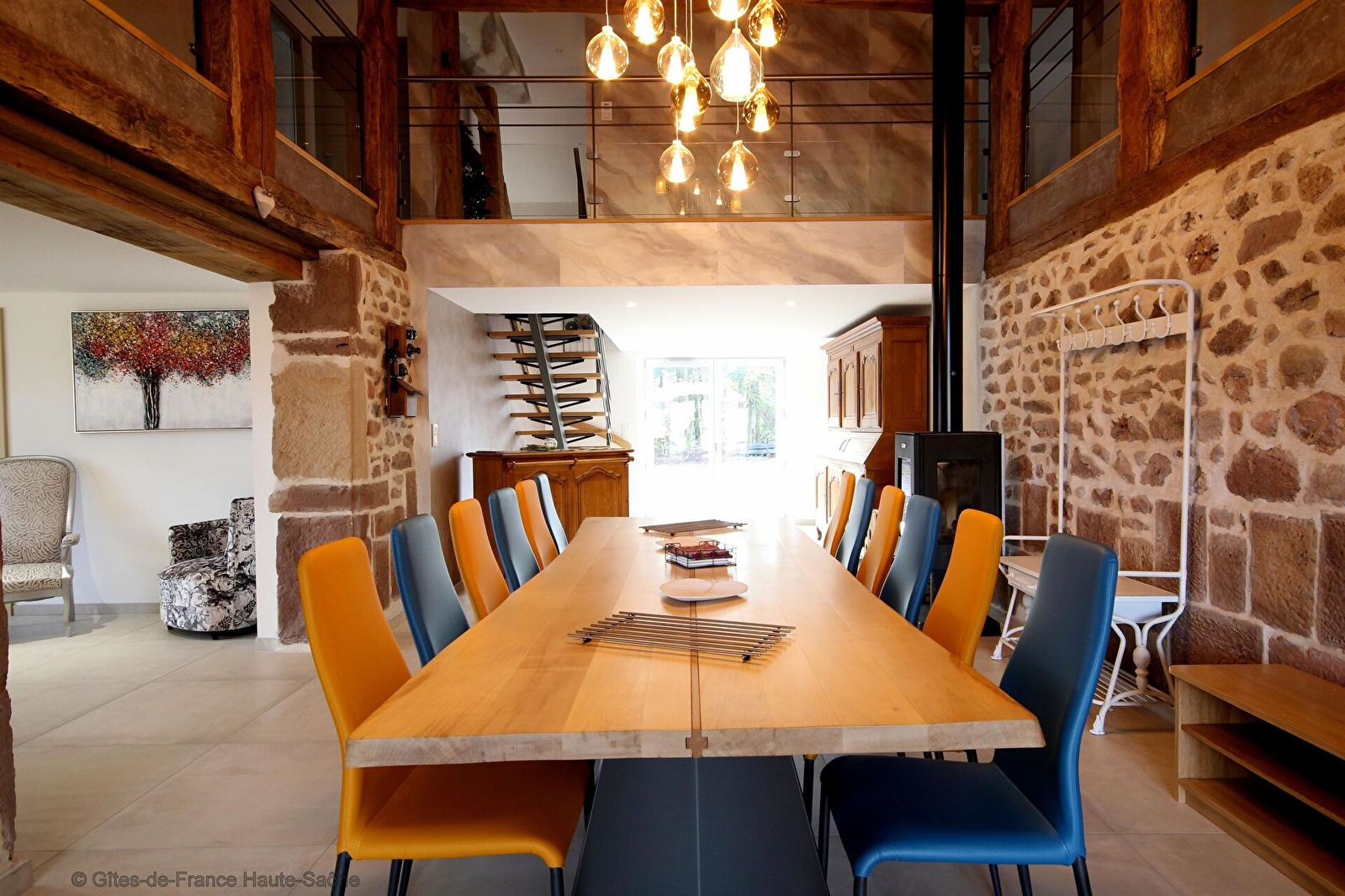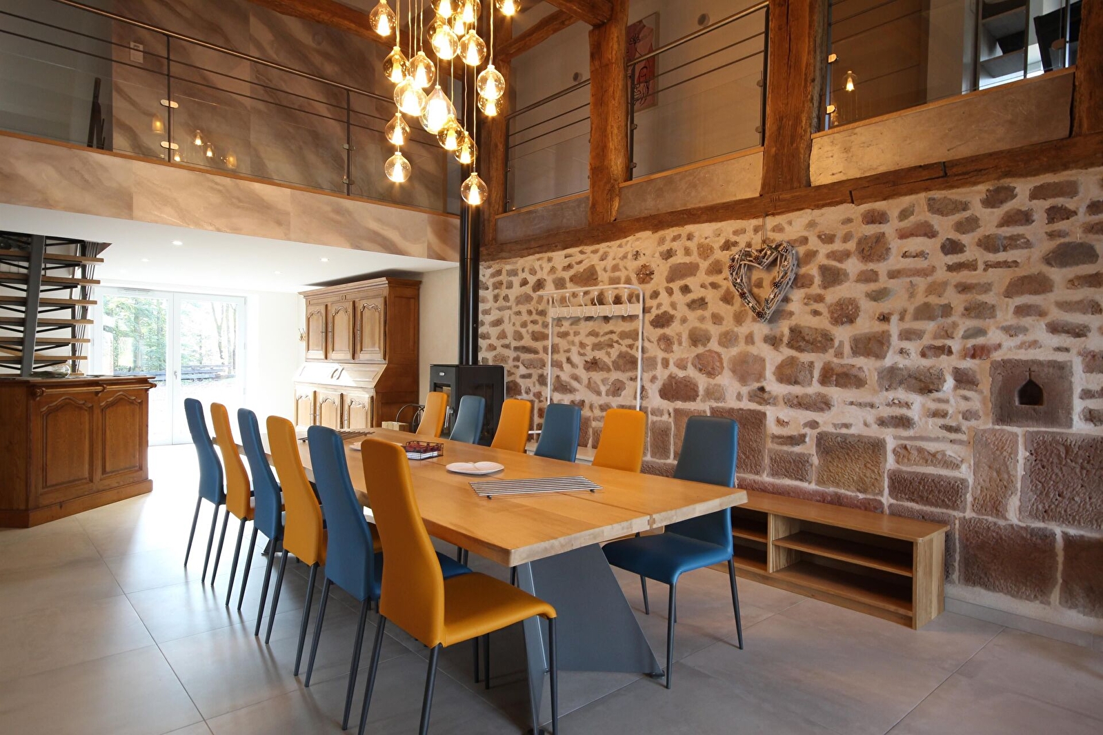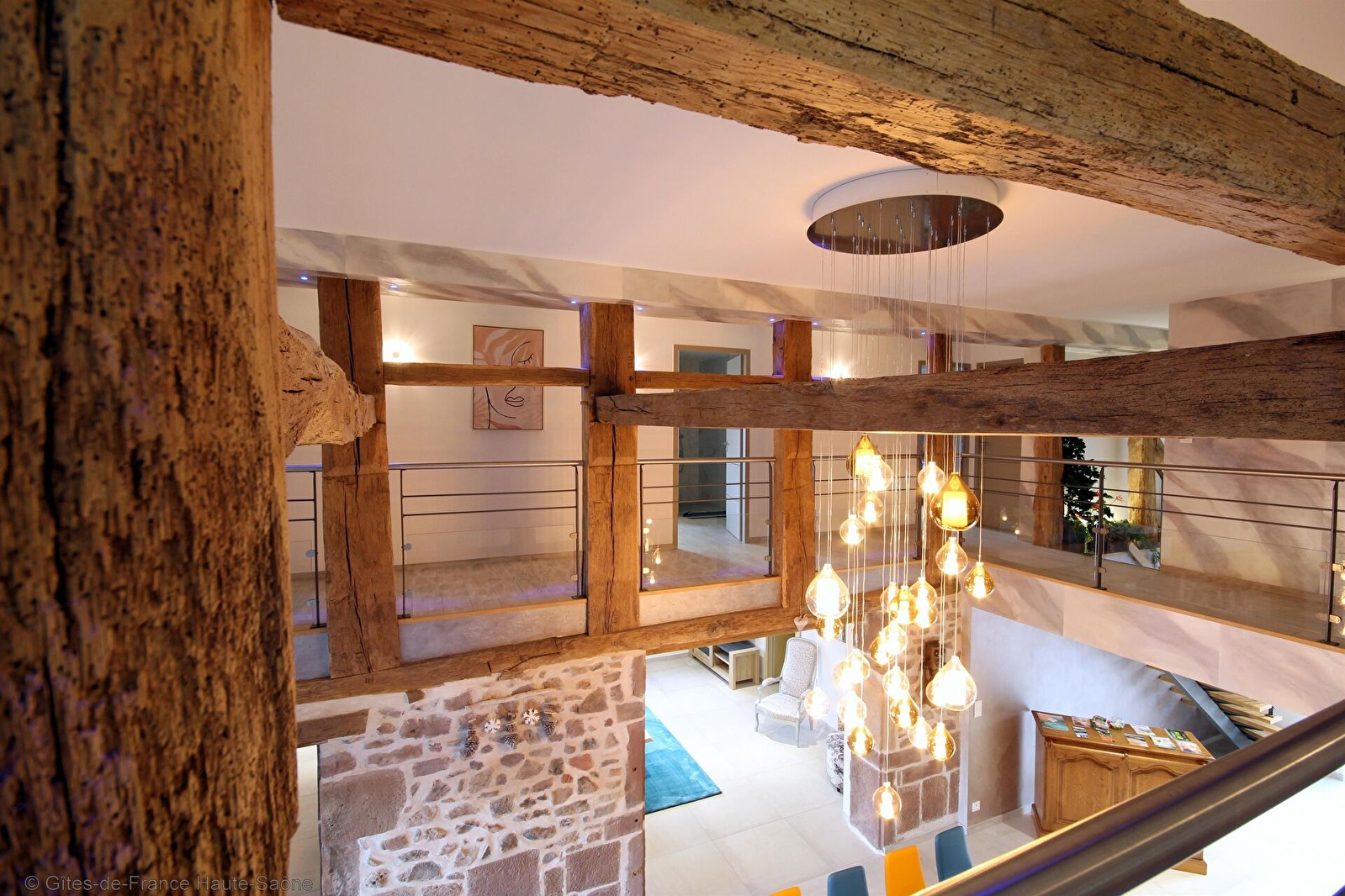 Au rez-de-chaussée: cuisine moderne entièrement équipée avec électroménager de grande qualité, salle à manger spacieuse et lumineuse avec poêle à bois, salon avec canapé, fauteuils et TV écran plat. Buanderie, coin-douche, WC indépendant. A l'étage, 5 chambres : 2 chambres avec chacune 1 lit de 160 cm et salle d'eau privative, 1 chambre avec 1 lit de 160 et salle d'eau donnant sur une 4ème chambre (communicante) avec également 1 lit de 160, 1 chambre "familiale" avec 1 lit de 160 et 2 lits de 90, avec salle de bain attenante, WC indépendants. Agréable espace-détente avec sauna, transats et douche italienne. Possibilité de 2 à 4 personnes supplémenatires dans le gîte mitoyen (70G4152). Situé en pleine forêt (accès par une chemin en très bon état) sur un terrain de 40 hectares, au bord d'un étang privé. Extérieur en cours d'aménagement.
