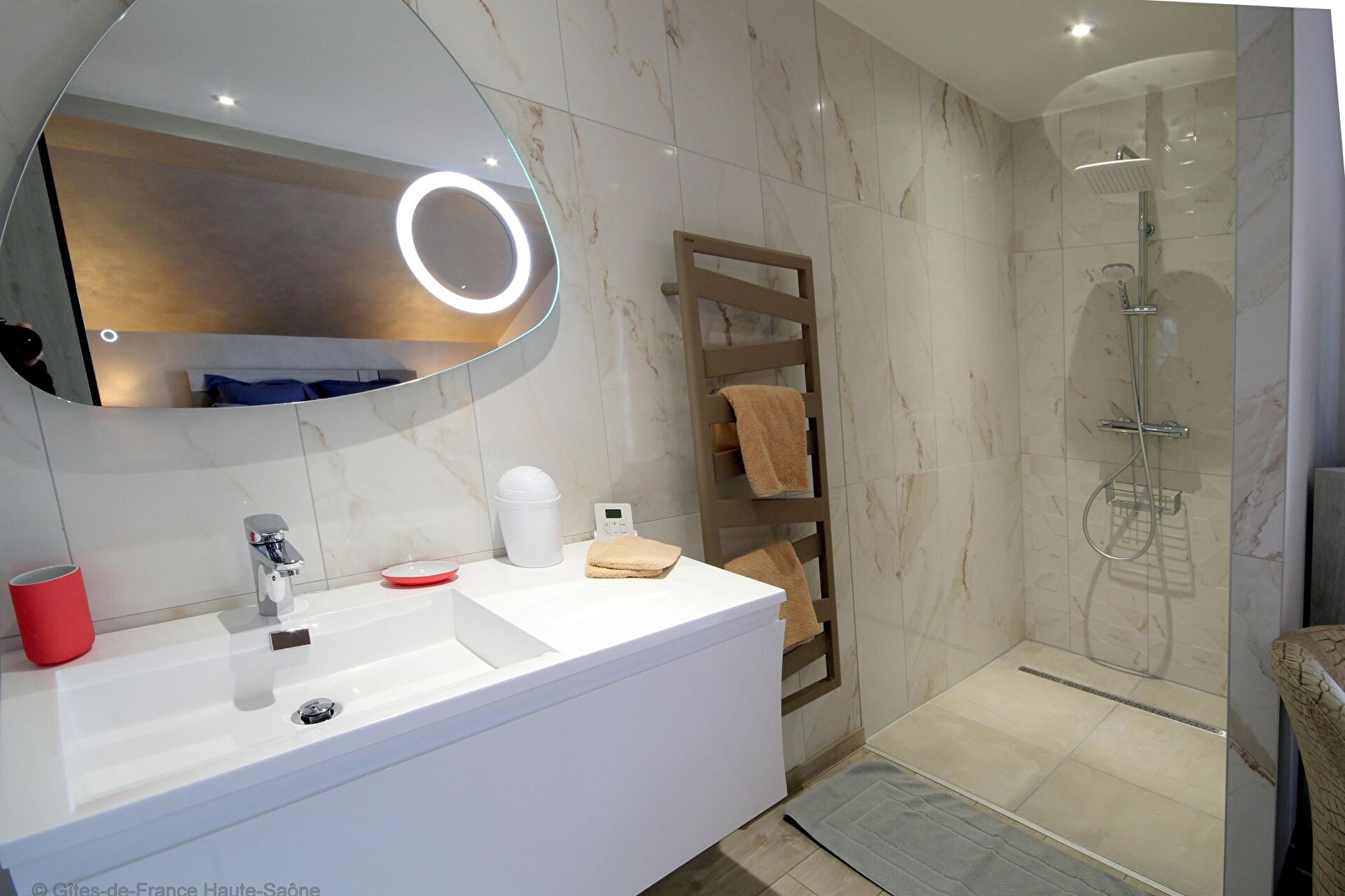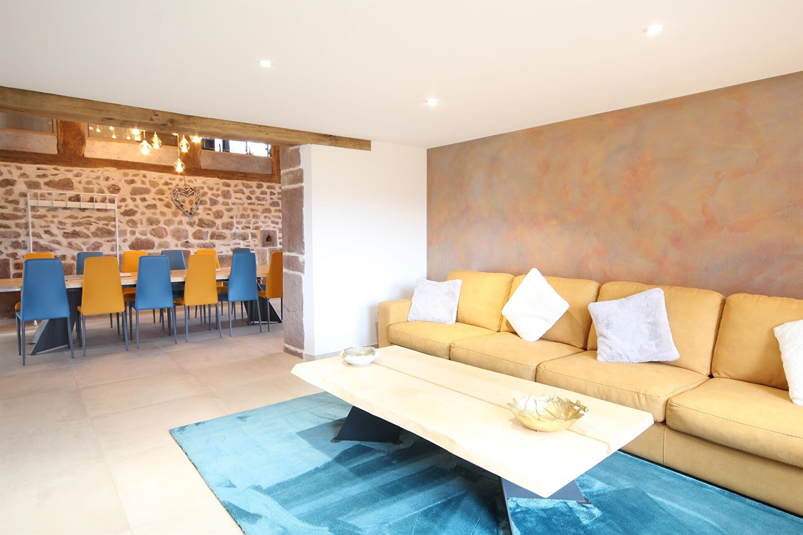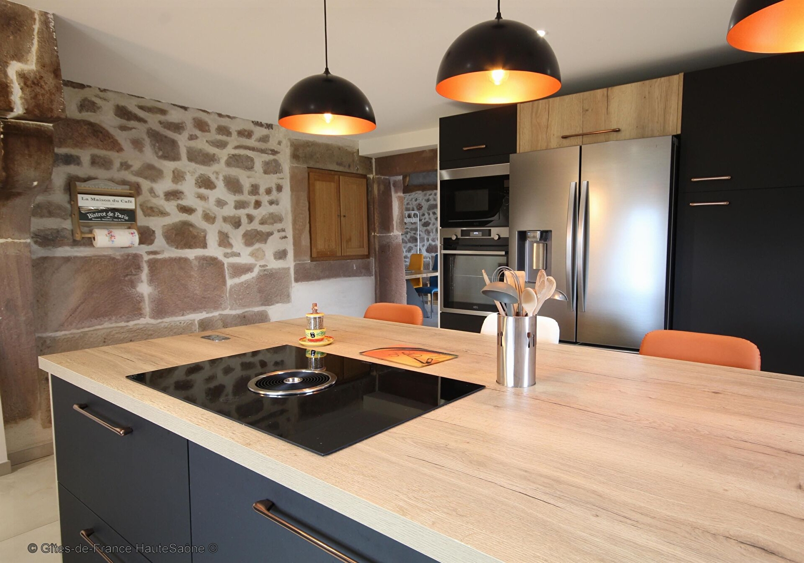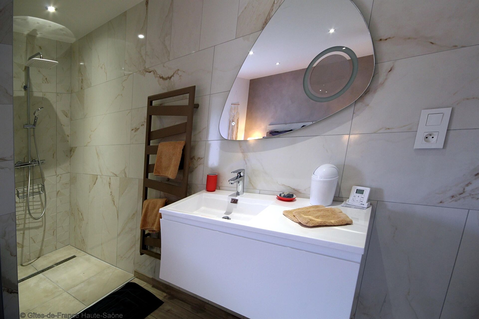 Au rez-de-chaussée: cuisine moderne entièrement équipée avec électroménager de grande qualité, salle à manger spacieuse et lumineuse avec poêle à bois, salon avec canapé, fauteuils et TV écran plat. Buanderie, coin-douche, WC indépendant. A l'étage, 5 chambres : 2 chambres avec chacune 1 lit de 160 cm et salle d'eau privative, 1 chambre avec 1 lit de 160 et salle d'eau donnant sur une 4ème chambre (communicante) avec également 1 lit de 160, 1 chambre "familiale" avec 1 lit de 160 et 2 lits de 90, avec salle de bain attenante, WC indépendants. Agréable espace-détente avec sauna, transats et douche italienne. Possibilité de 2 à 4 personnes supplémenatires dans le gîte mitoyen (70G4152). Situé en pleine forêt (accès par une chemin en très bon état) sur un terrain de 40 hectares, au bord d'un étang privé. Extérieur en cours d'aménagement.