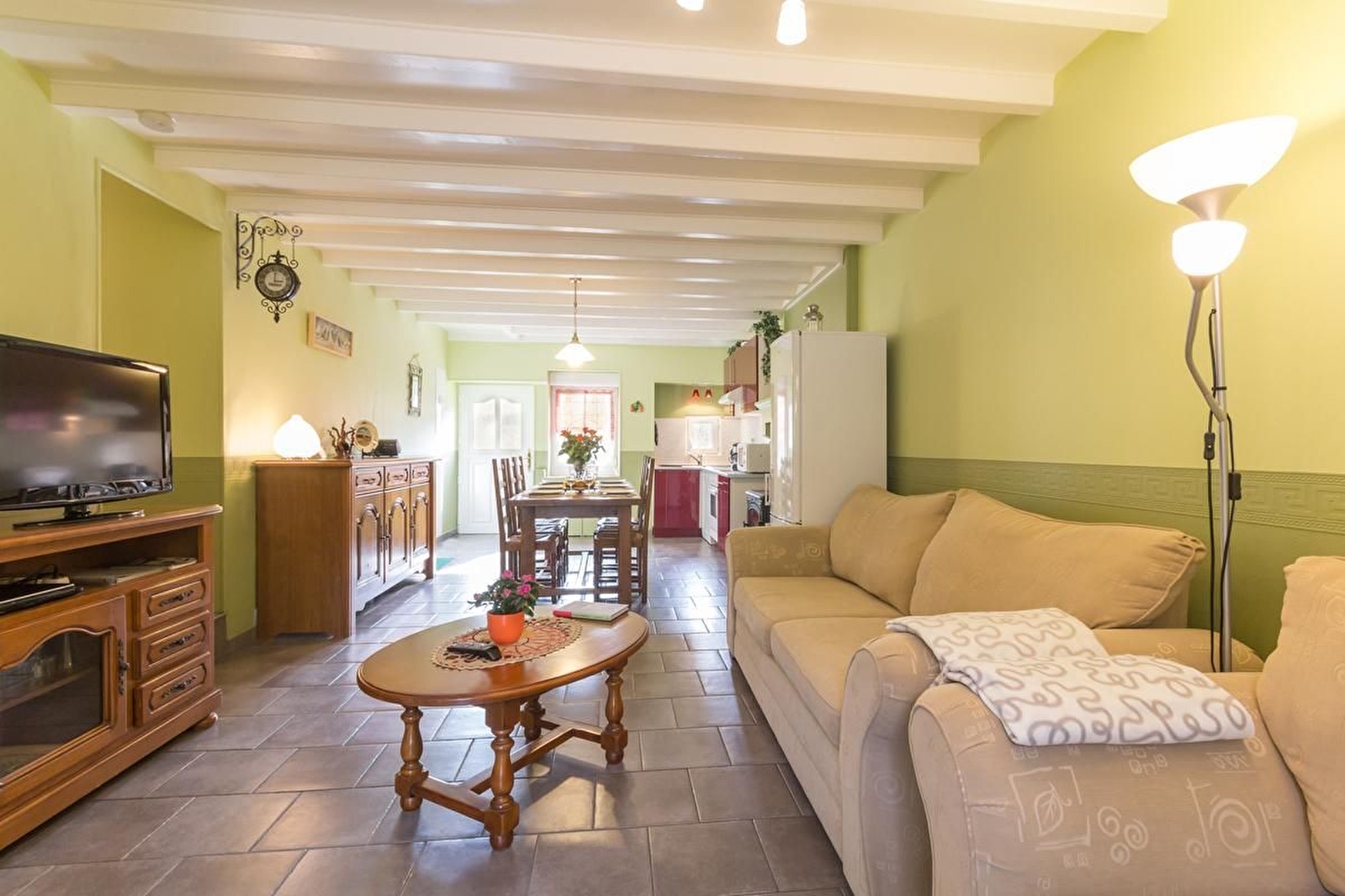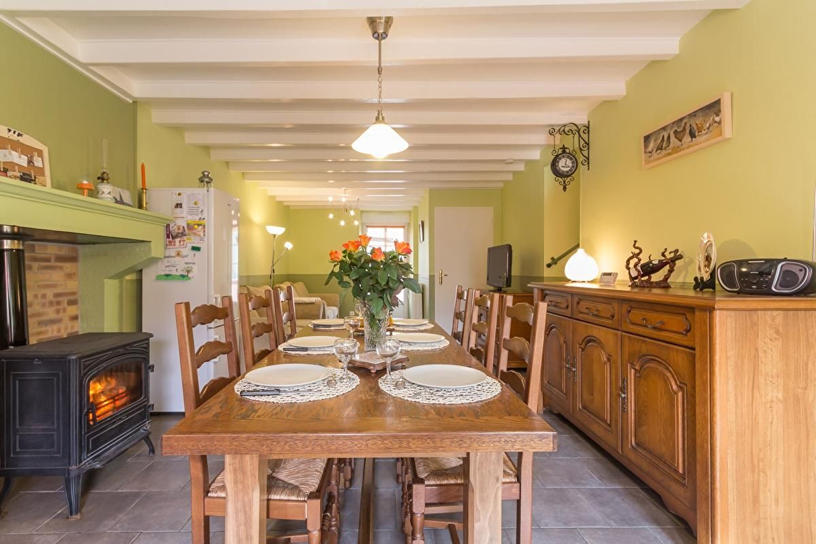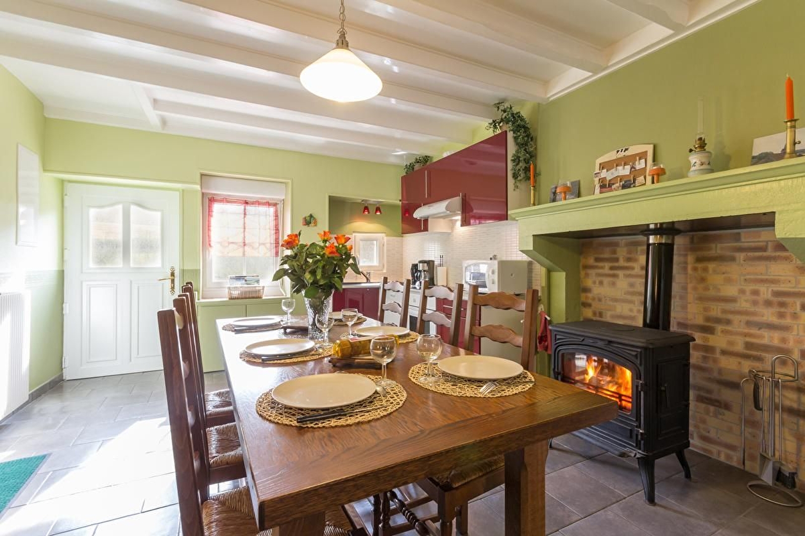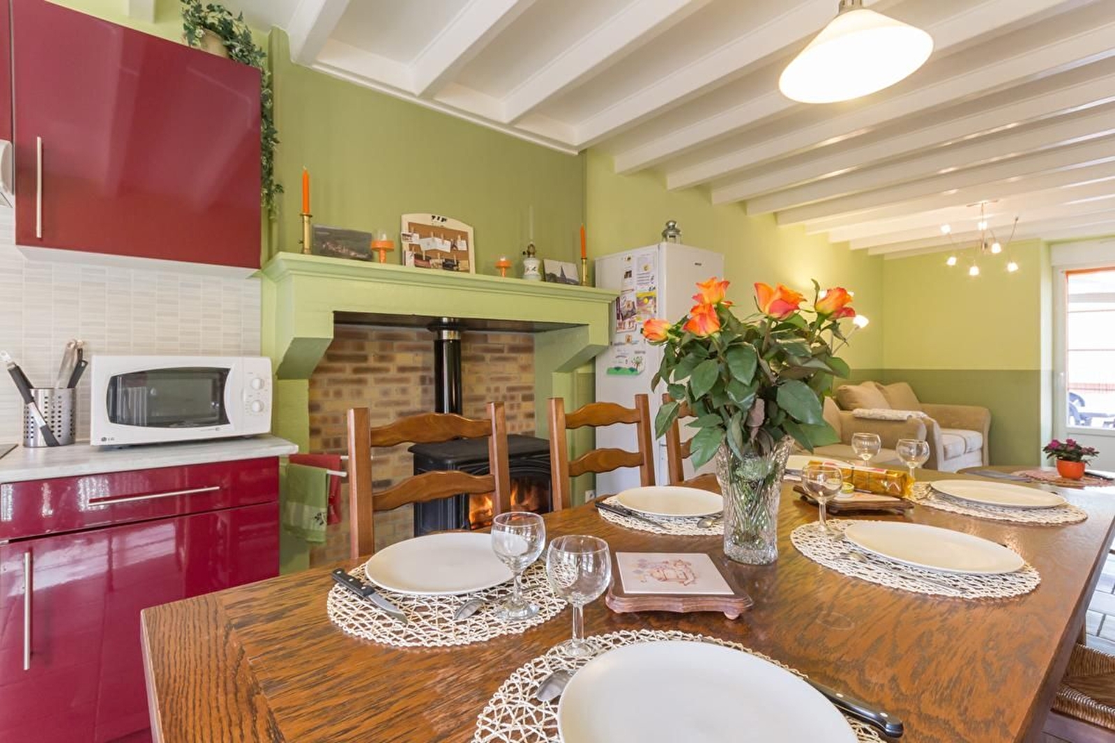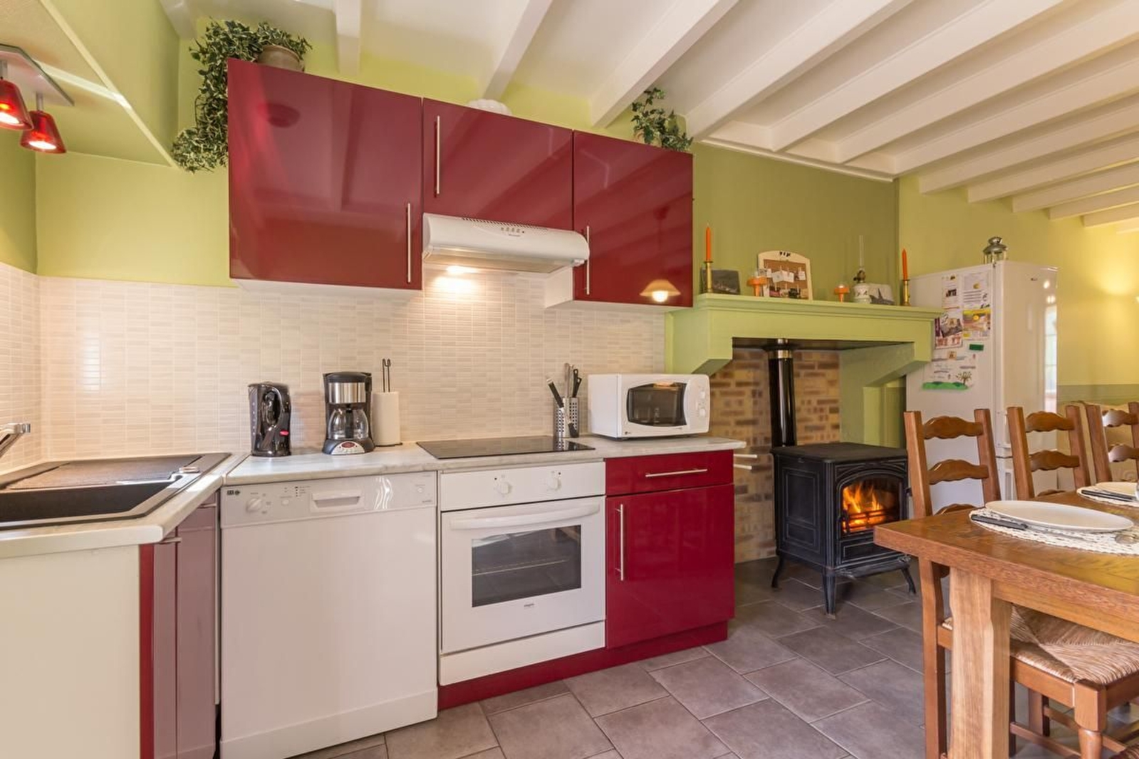Cuisine intégrée ouverte sur la salle à manger et le salon avec poêle à bois. WC indépendant.