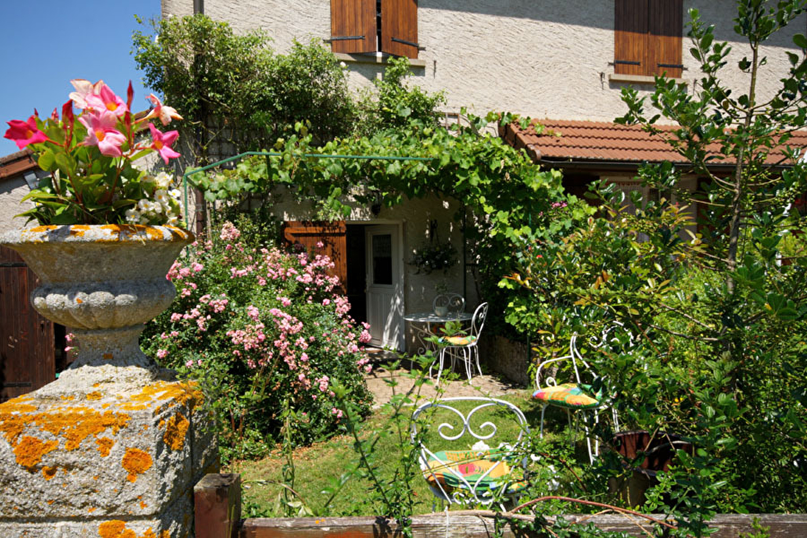 Passionnée d’horticulture (elle aura plaisir à vous faire visiter son jardin personnel), Josiane vous ouvre les portes d’une authentique & dépaysante demeure de pays datant du XIXème siècle, restaurée & réhabilitée, blottie au cœur d’un paisible mini hameau rural résidentiel chargé d’histoire, abritant une très élégante chapelle romane du XIVème siècle restaurée, adossée à une insolite allée de séquoias géants lui servant d’accès, formant une "nef" monumentale (rare ensemble boisé considéré comme littéralement "remarquable" à l'échelle du département de Saône-et-Loire). Apaisant cadre champêtre alentour parfaitement préservé, perché en "balcon" & "belvédère" panoramique sur une petite colline dominant un bucolique vallon de champs & prairies bocagères boisées, en pleine campagne viticole vallonnée des Côtes Chalonnaises, à proximité de nombreuses forêts sauvages (à parcourir lors de reposantes balades à pied ou VTT) comme des vignobles voisins (dont le très réputé cru "Mercurey" ou l'AOC de Givry fleuron des vins de Bourgogne dont il se dit qu'il était le vin préféré du roi Henry IV !). Petit gîte de bon confort. Cachet campagnard contemporain. Terrasse soigneusement fleurie & végétalisée, agréablement ombragée sous une treille de vigne. Accès à un vaste jardin clos de 700m² sis à deux pas (en commun), arboré & végétalisé, offrant une très belle vue dégagée sur la douce campagne environnante, doté d’un verger fruitier (pêchers, pruniers, cerisiers, noisetiers, kiwis, poirier… / cueillette possible durant votre séjour), bordé par le poulailler de la propriétaire (accueillant ses poules & une oie).